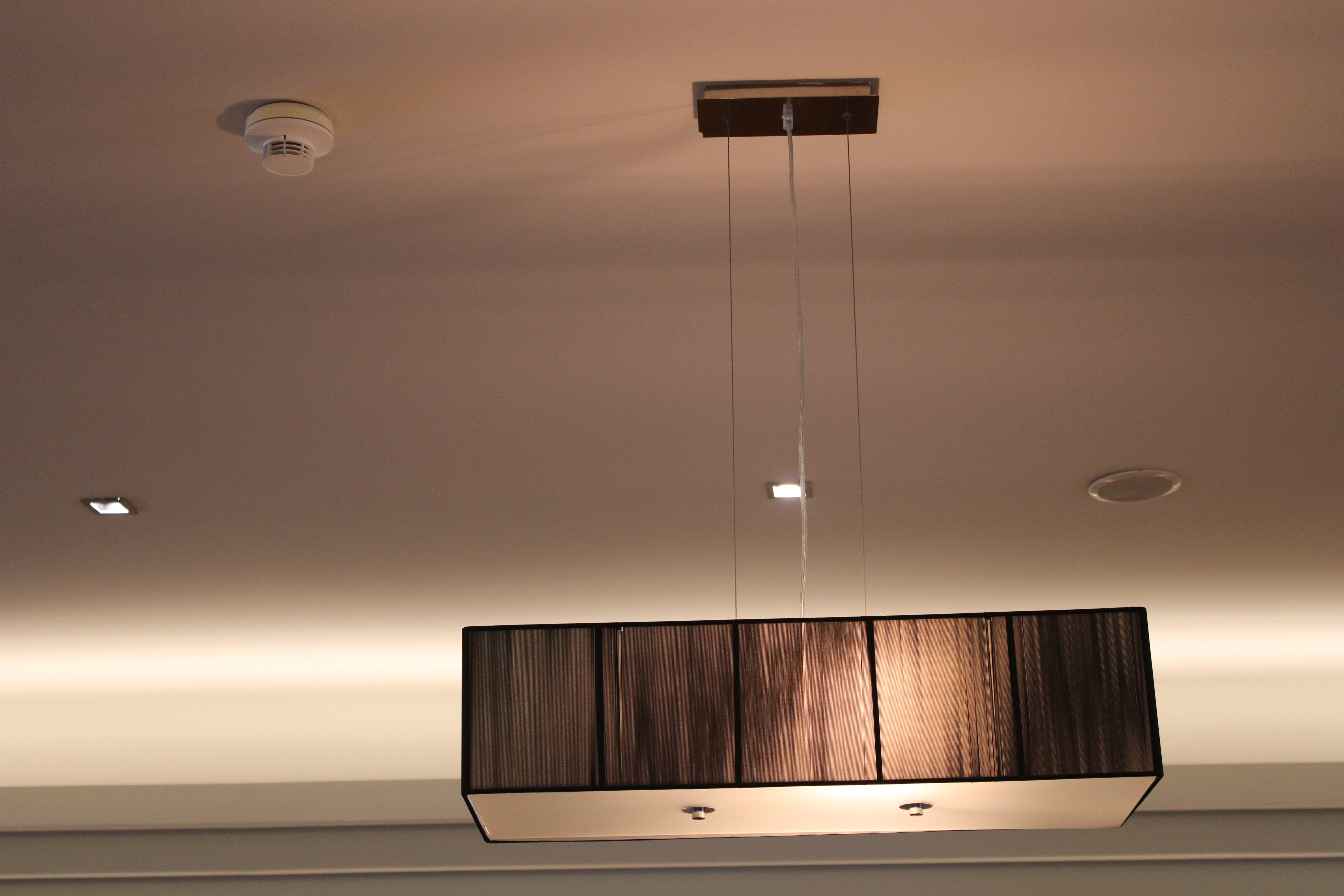O candeeiro é suspenso por cabos ajustáveis, permitindo personalizar a altura conforme o espaço.
