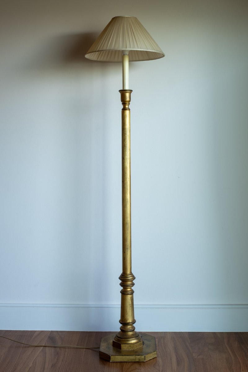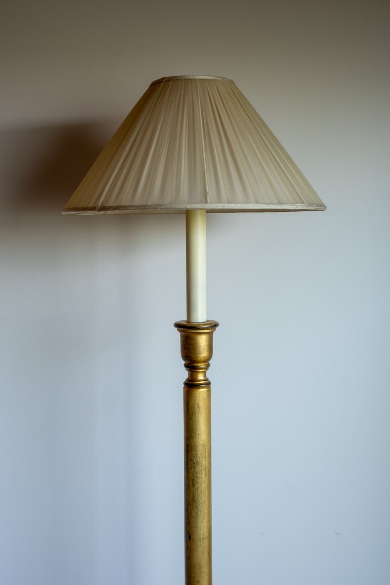 Candeeiro com estrutura dourada e abat-jour em tecido claro. Design clássico e intemporal, fácil de integrar em diferentes ambientes, ideal para criar uma iluminação suave e acolhedora.