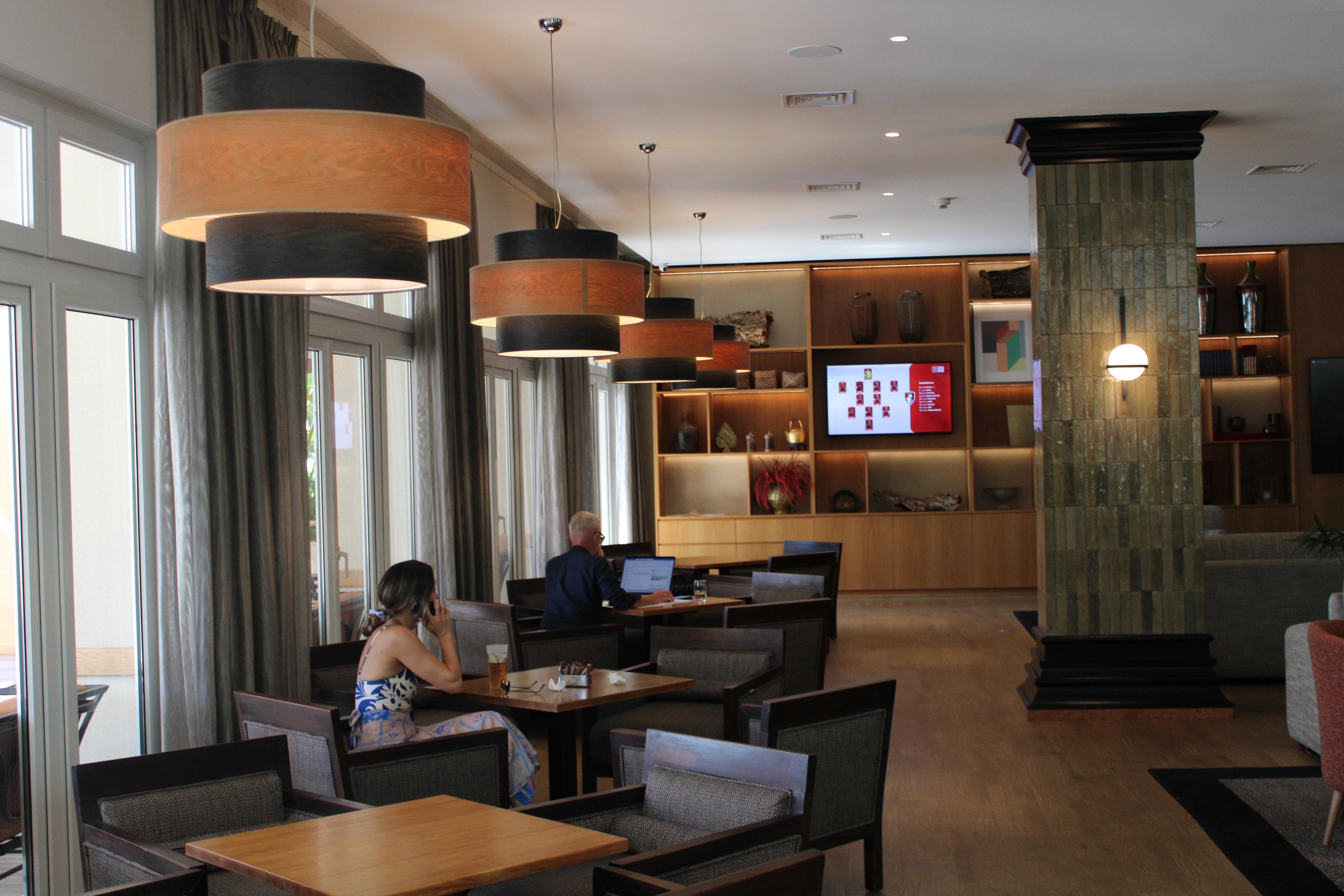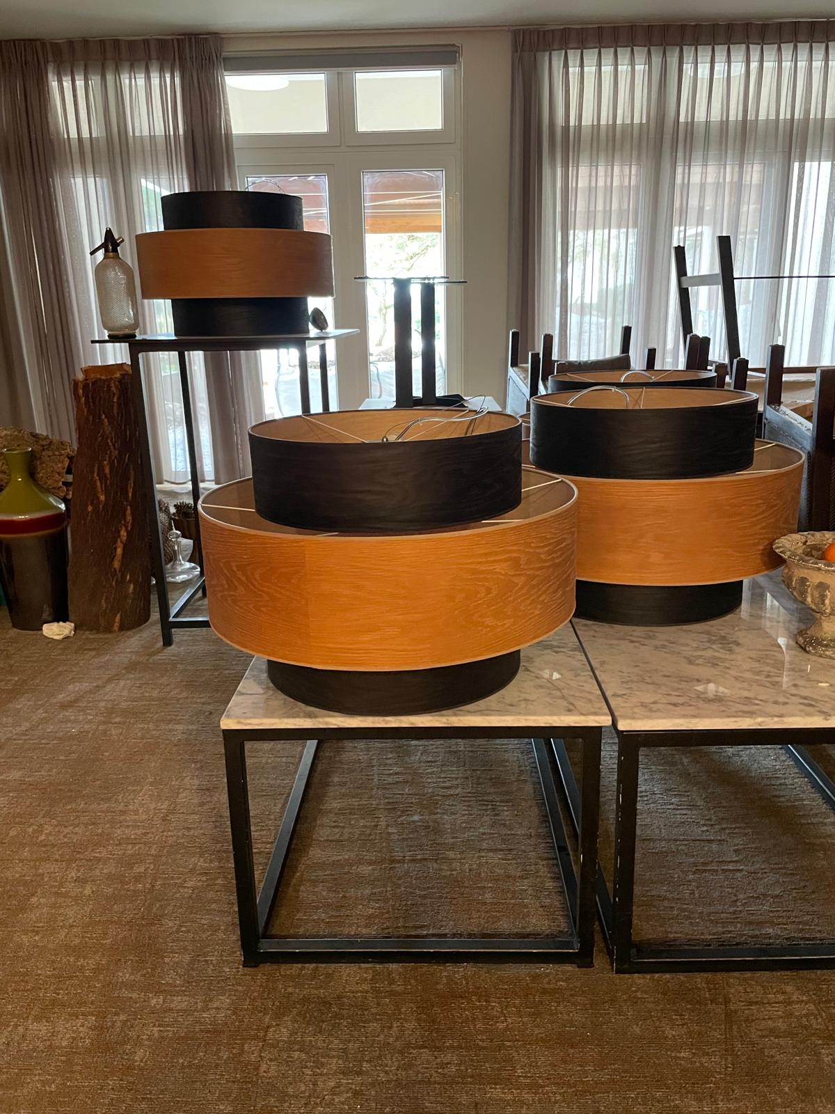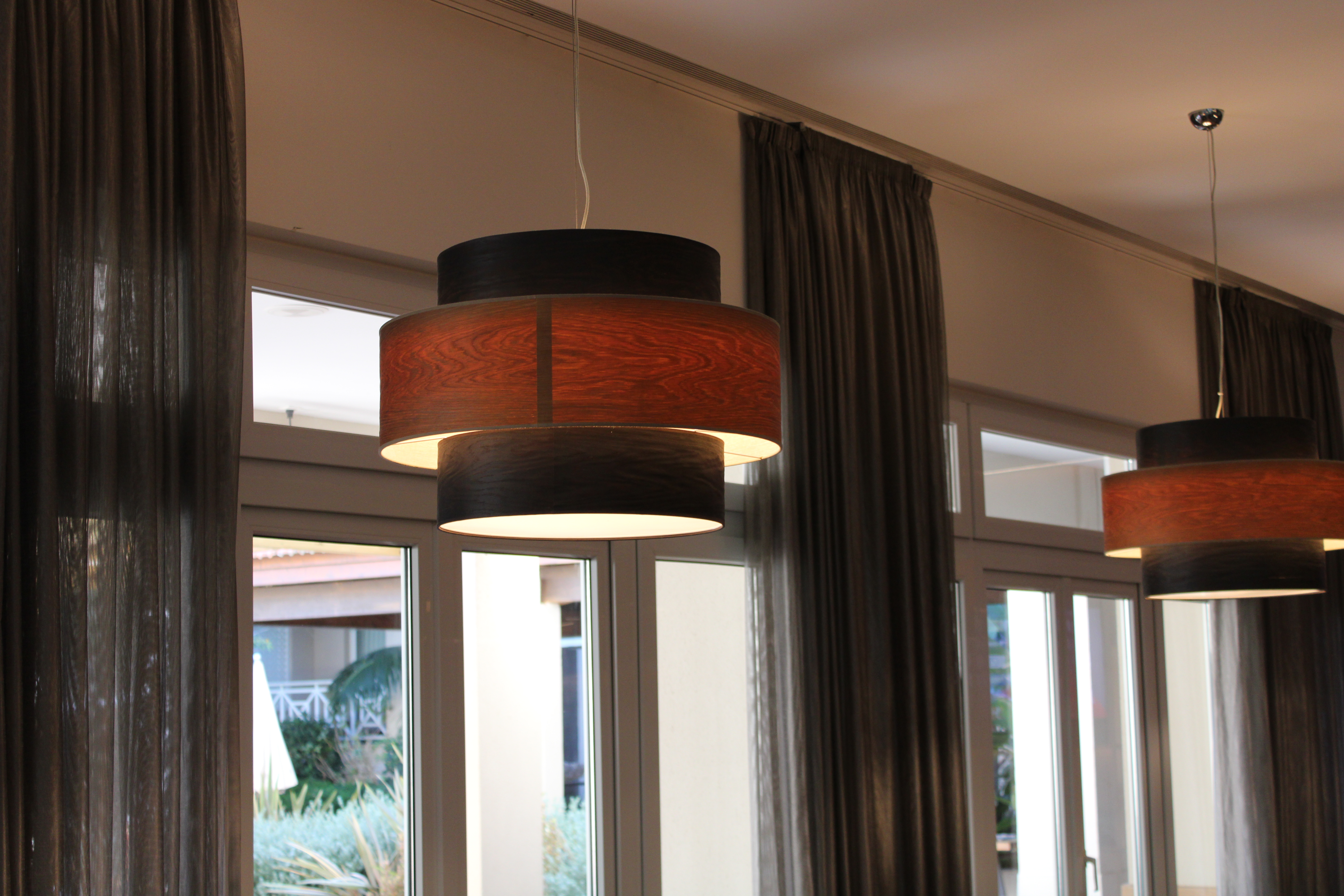 Cúpula dupla em folha de madeira, com textura elegante e tom quente que cria uma luz acolhedora