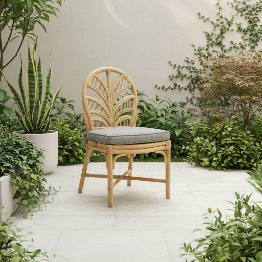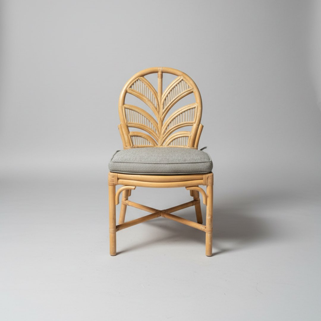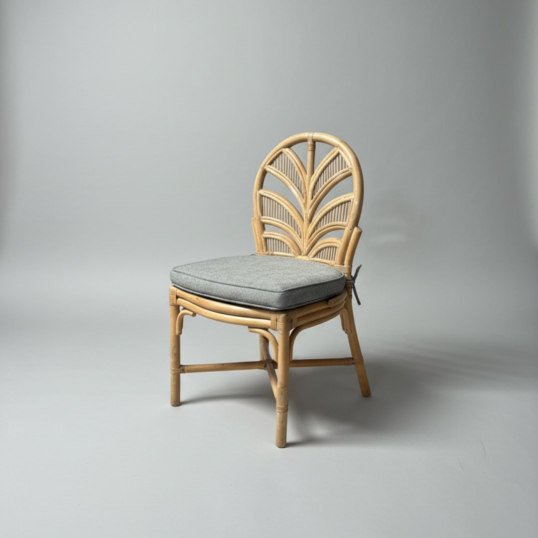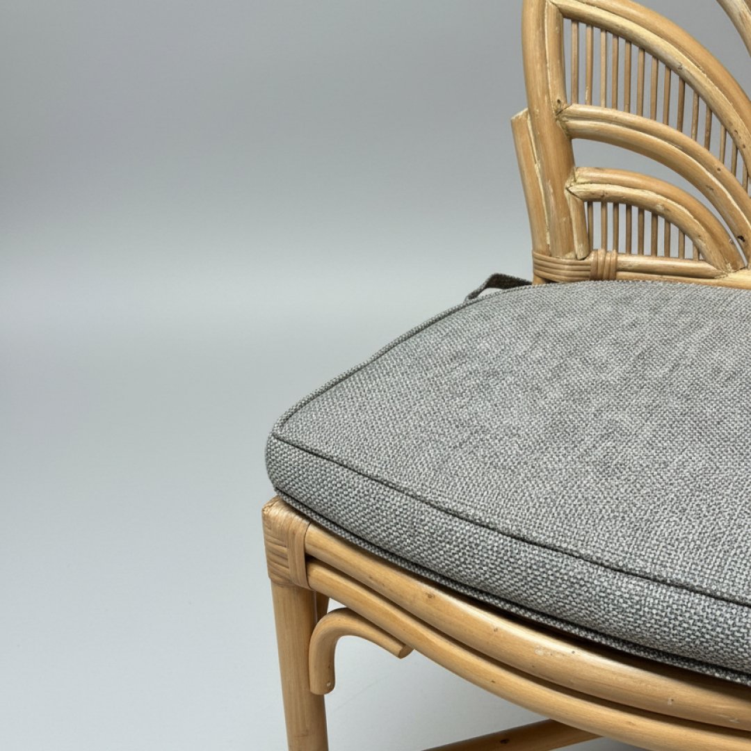 Cadeira de jantar em bambu natural com encosto decorativo em formato de folha. Inclui almofada de assento amovível em tecido técnico cinza mesclado, ideal para tornar o ambiente acolhedor. A estrutura apresenta marcas de desgaste naturais, decorrentes da sua utilização anterior em contexto de hotelaria