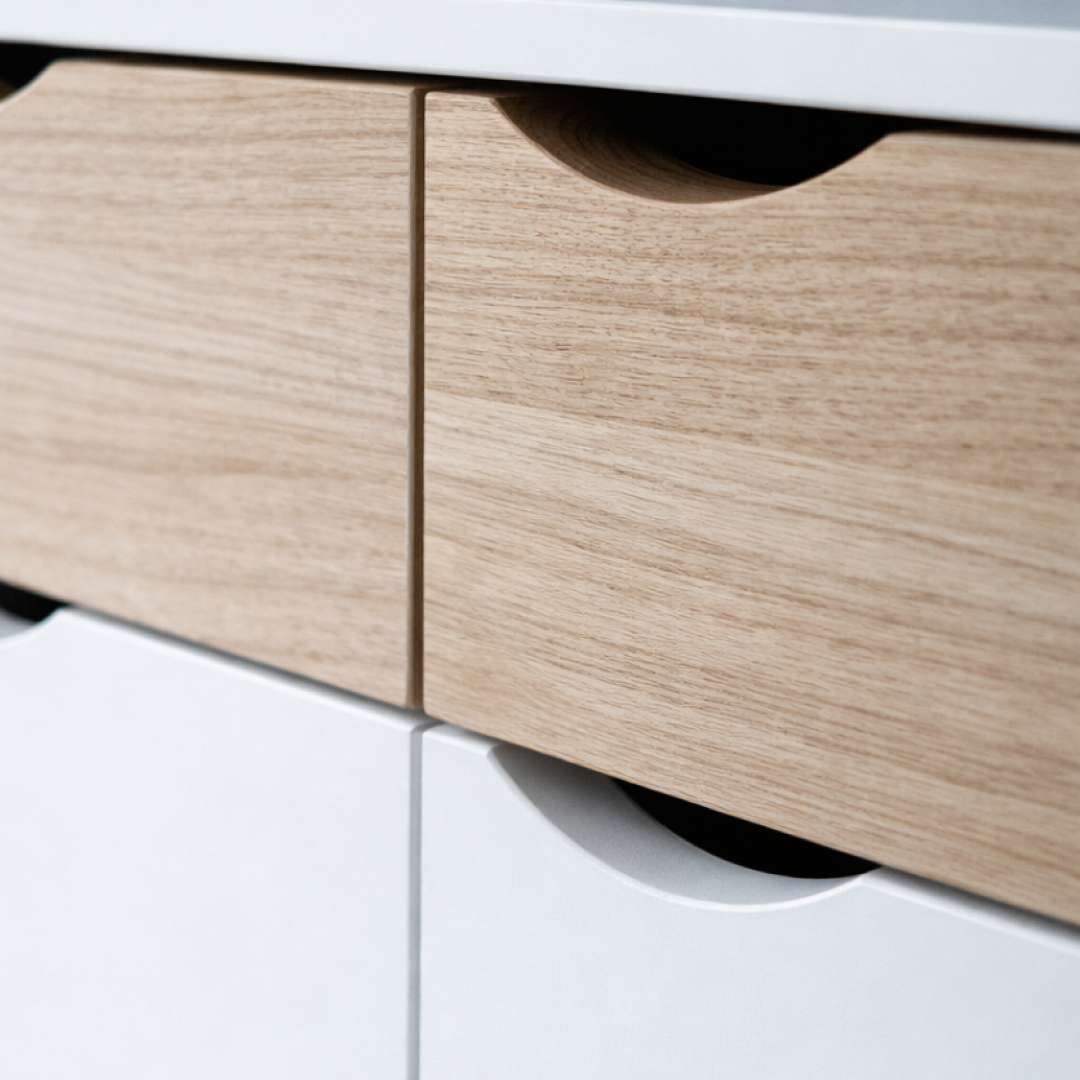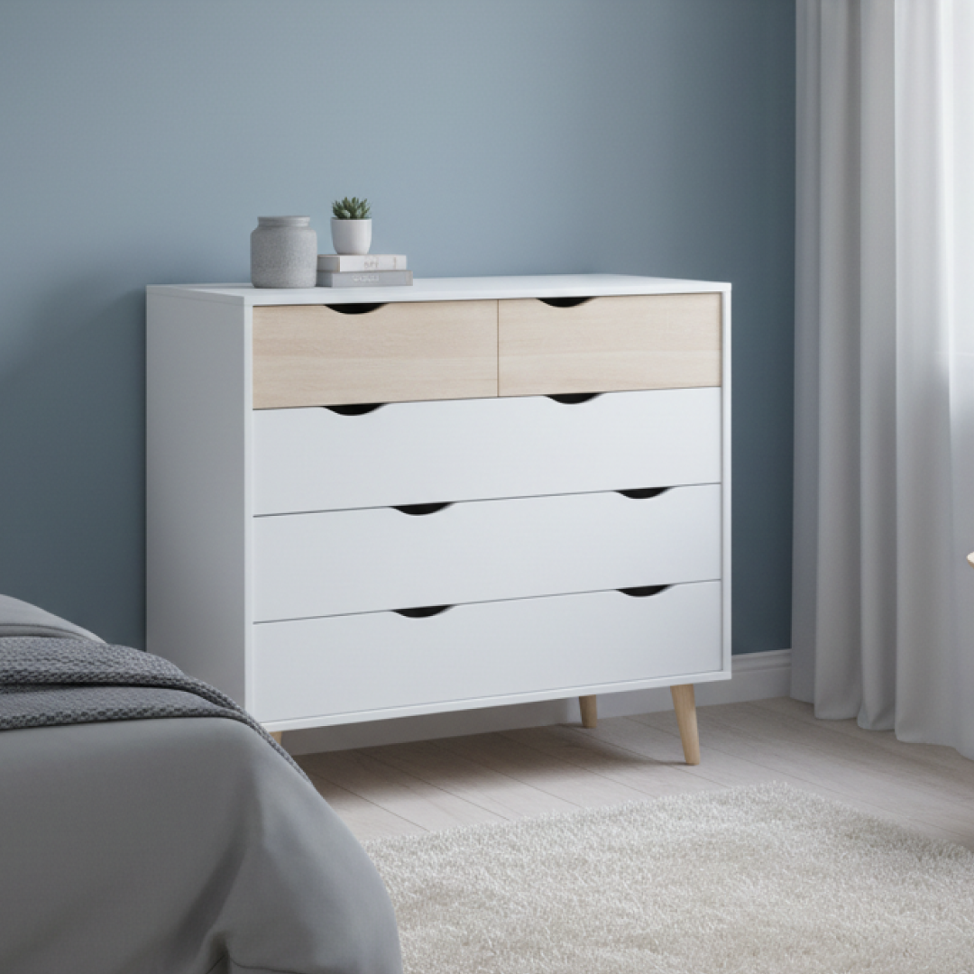 Esta cómoda destaca-se pela sua estética minimalista de inspiração nórdica, combinando a sobriedade do branco com o calor da madeira de carvalho. É uma peça versátil, ideal tanto para quartos como para zonas de arrumação em escritórios ou hotéis que privilegiam um design leve e funcional. A sua estrutura assenta em pés cilíndricos de madeira, que elevam a peça do chão, facilitando a limpeza do espaço e conferindo-lhe uma aparência mais arejada.