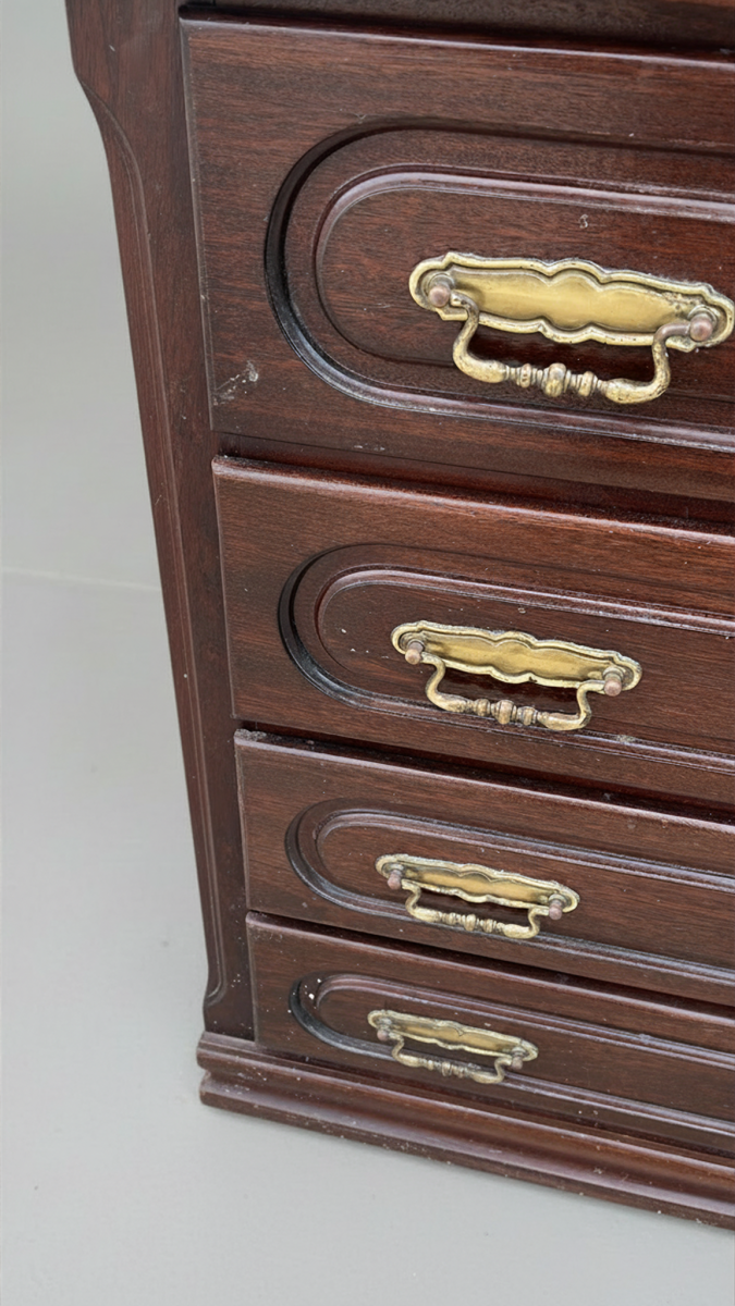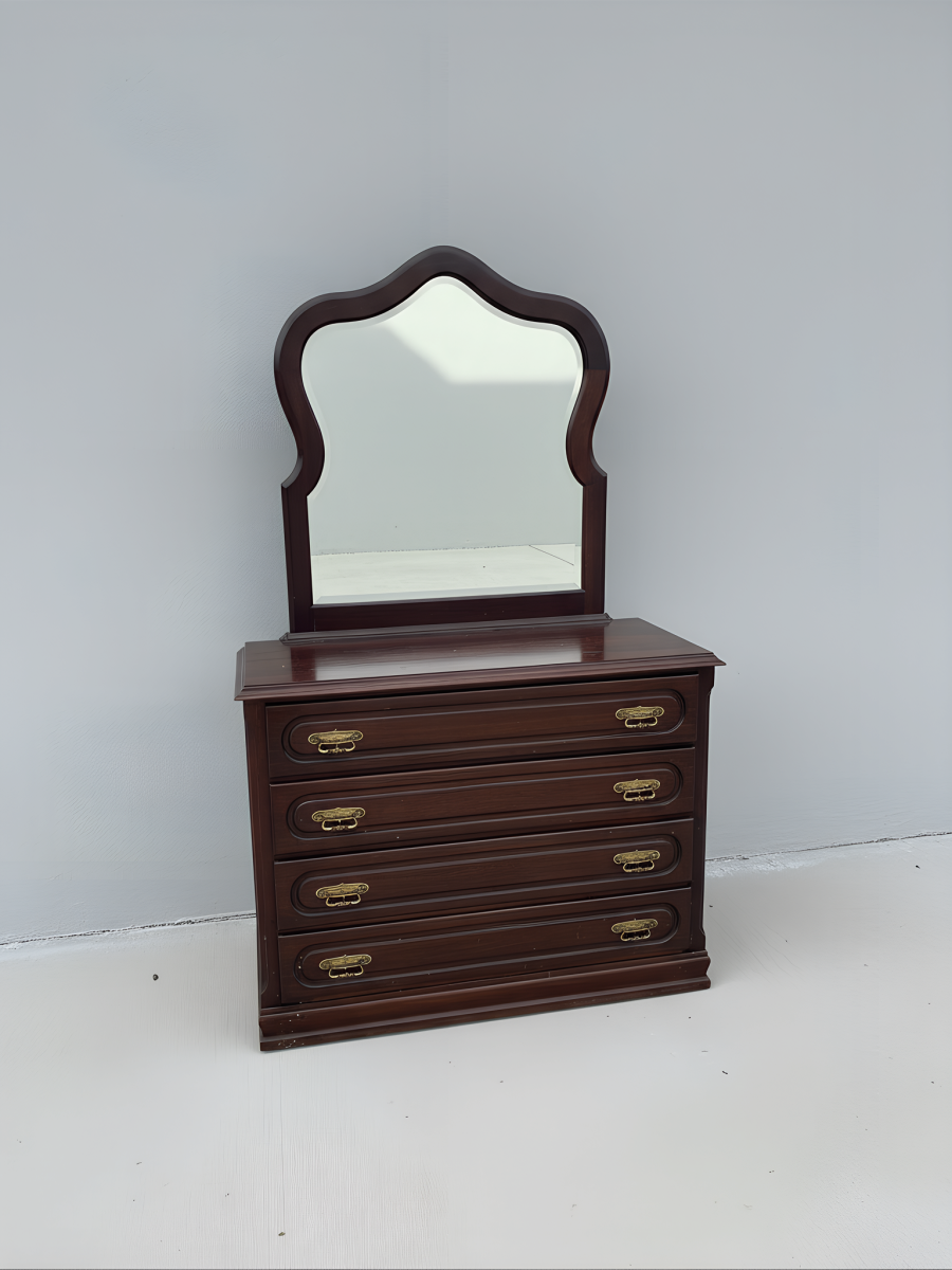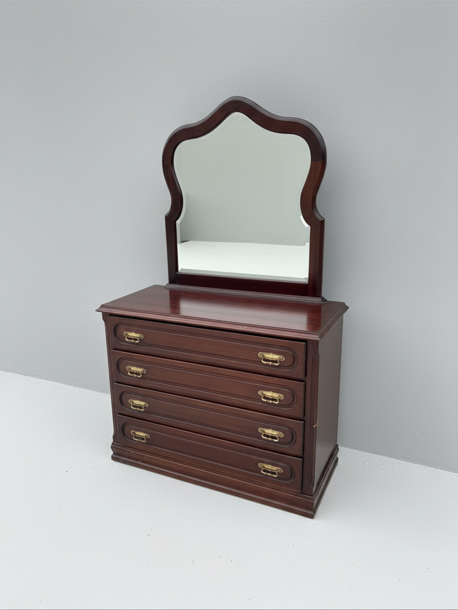 Mobiliário de arrumação de tipologia clássica, composto por uma cómoda de quatro gavetas e um espelho superior com moldura recortada e moldurada. A estrutura integral é executada em madeira com acabamento em verniz de tom escuro, possivelmente nogueira ou mogno, apresentando uma construção robusta e de linhas tradicionais. As frentes das gavetas são enriquecidas com molduras em relevo e equipadas com puxadores metálicos duplos em liga de latão, que conferem um detalhe ornamental distintivo à peça. O espelho apresenta um contorno superior arqueado, integrando-se na estética do conjunto para funcionar como um toucador funcional.
