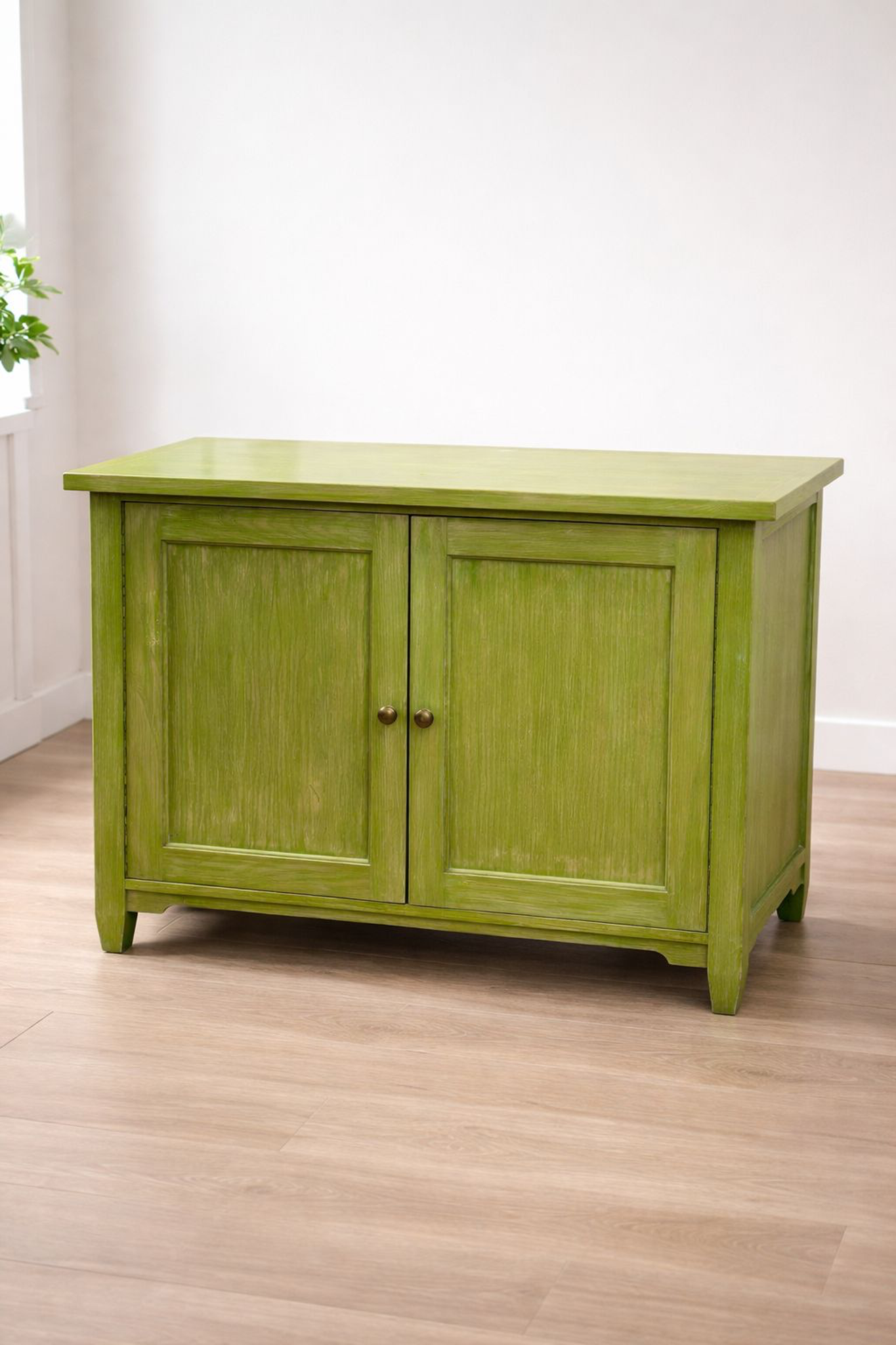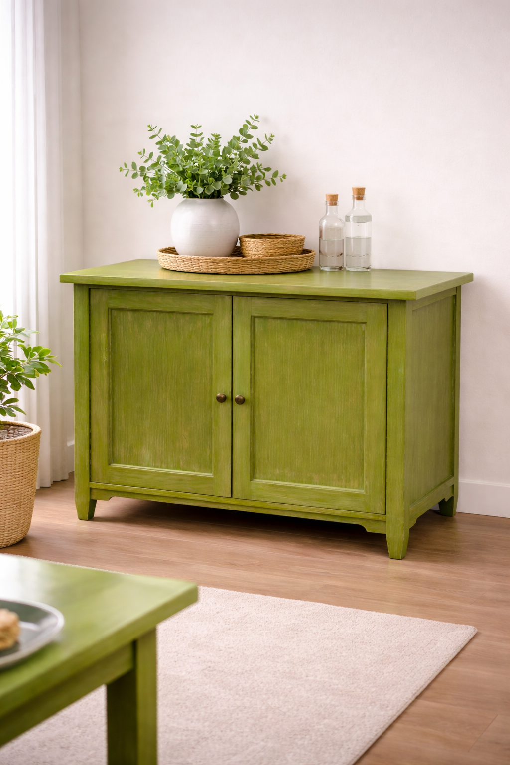 Cómoda de design simples e funcional, com duas portas e boa capacidade de arrumação. O acabamento em verde dá presença ao espaço e funciona como peça de destaque, mantendo uma estética limpa e versátil para sala, quarto ou entrada.