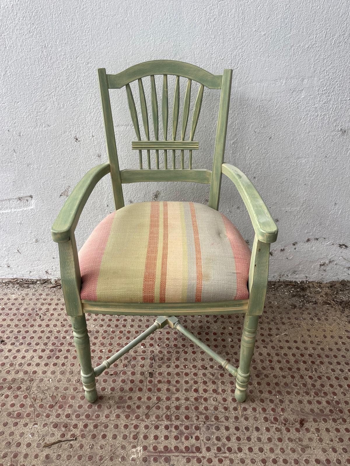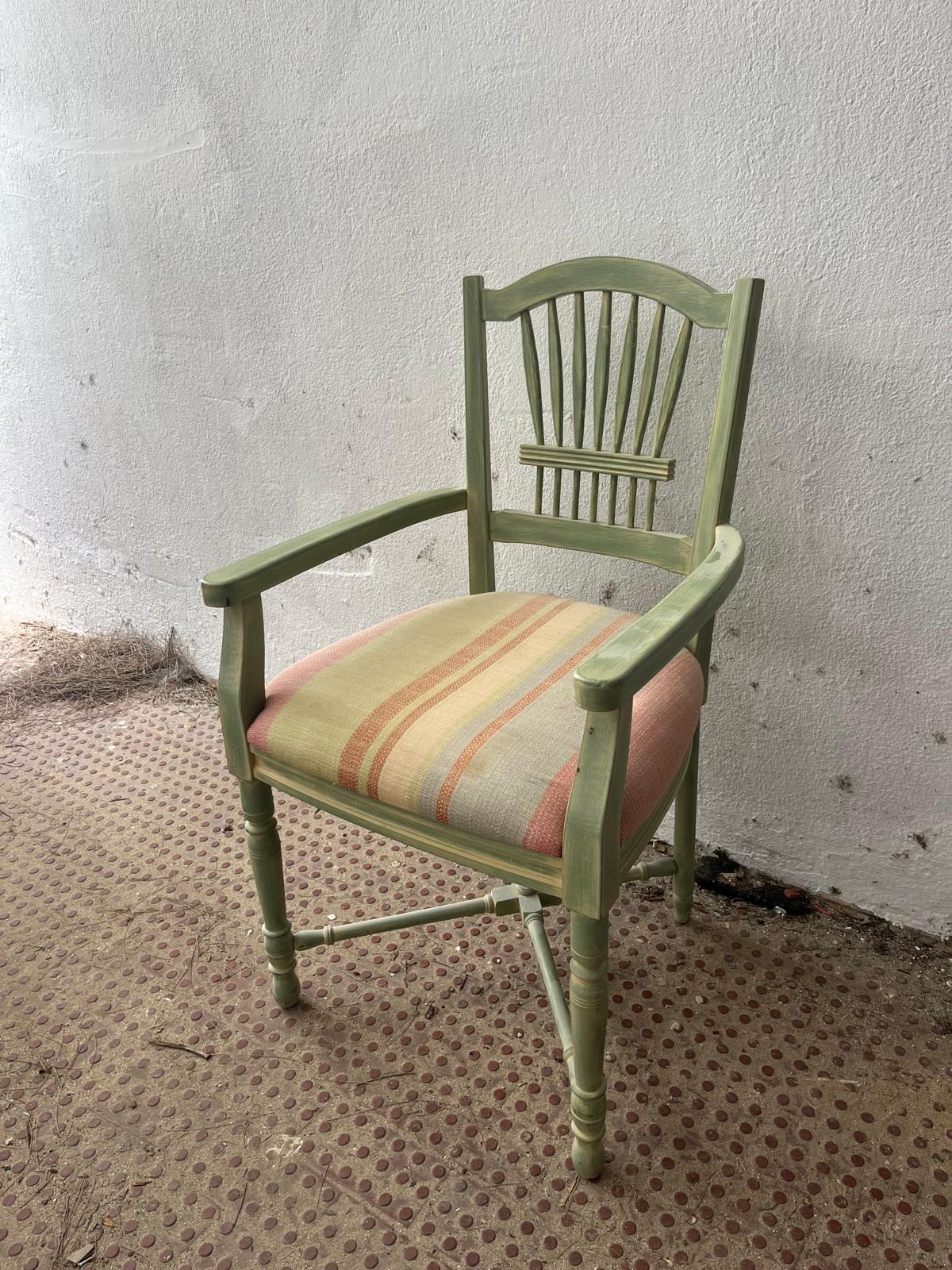 Cadeira em madeira maciça com acabamento verde/ esbranquiçado tipo decapé, que realça o seu charme rústico e vintage. O encosto apresenta um bonito detalhe em ripas verticais com travessa central horizontal, conferindo elegância e robustez ao design.