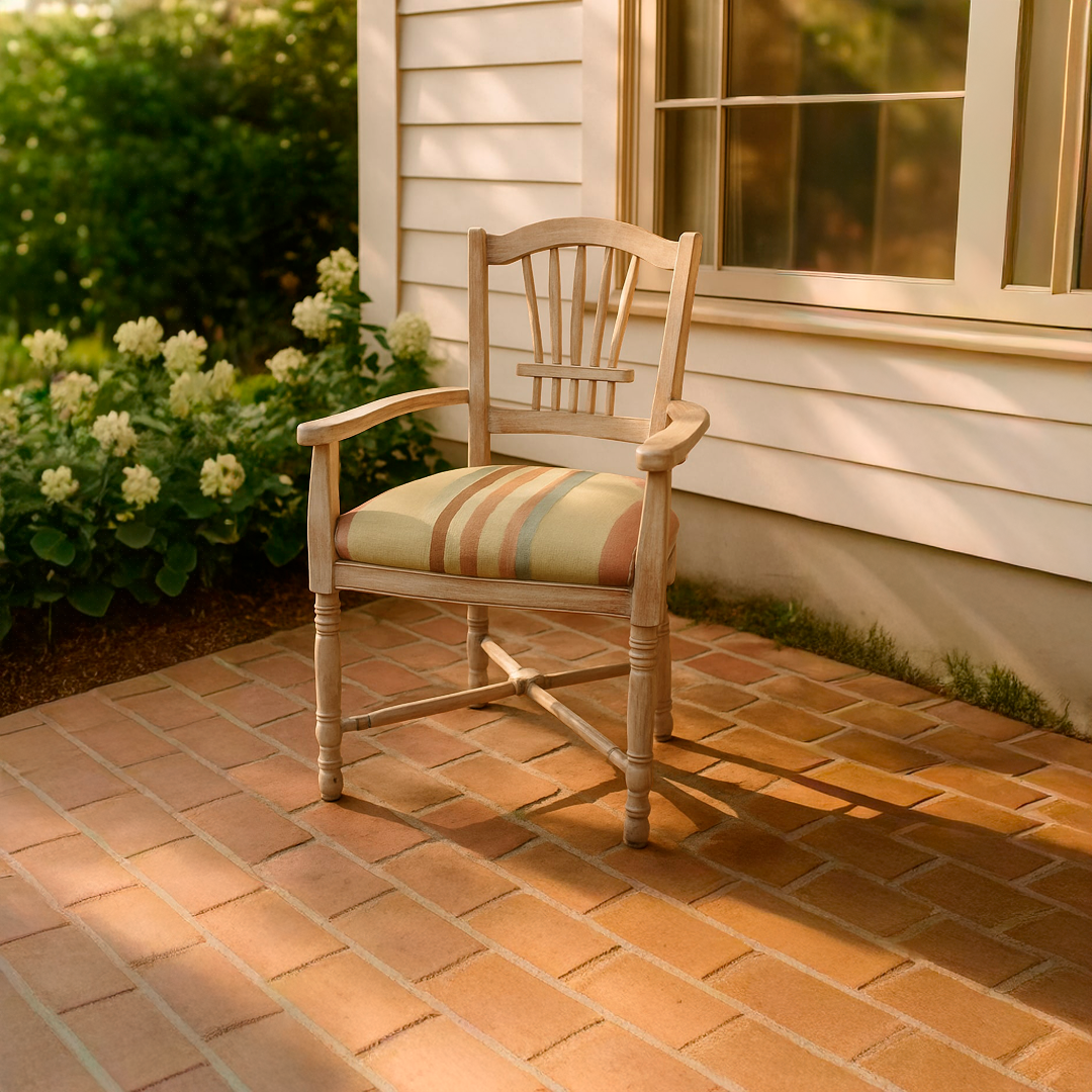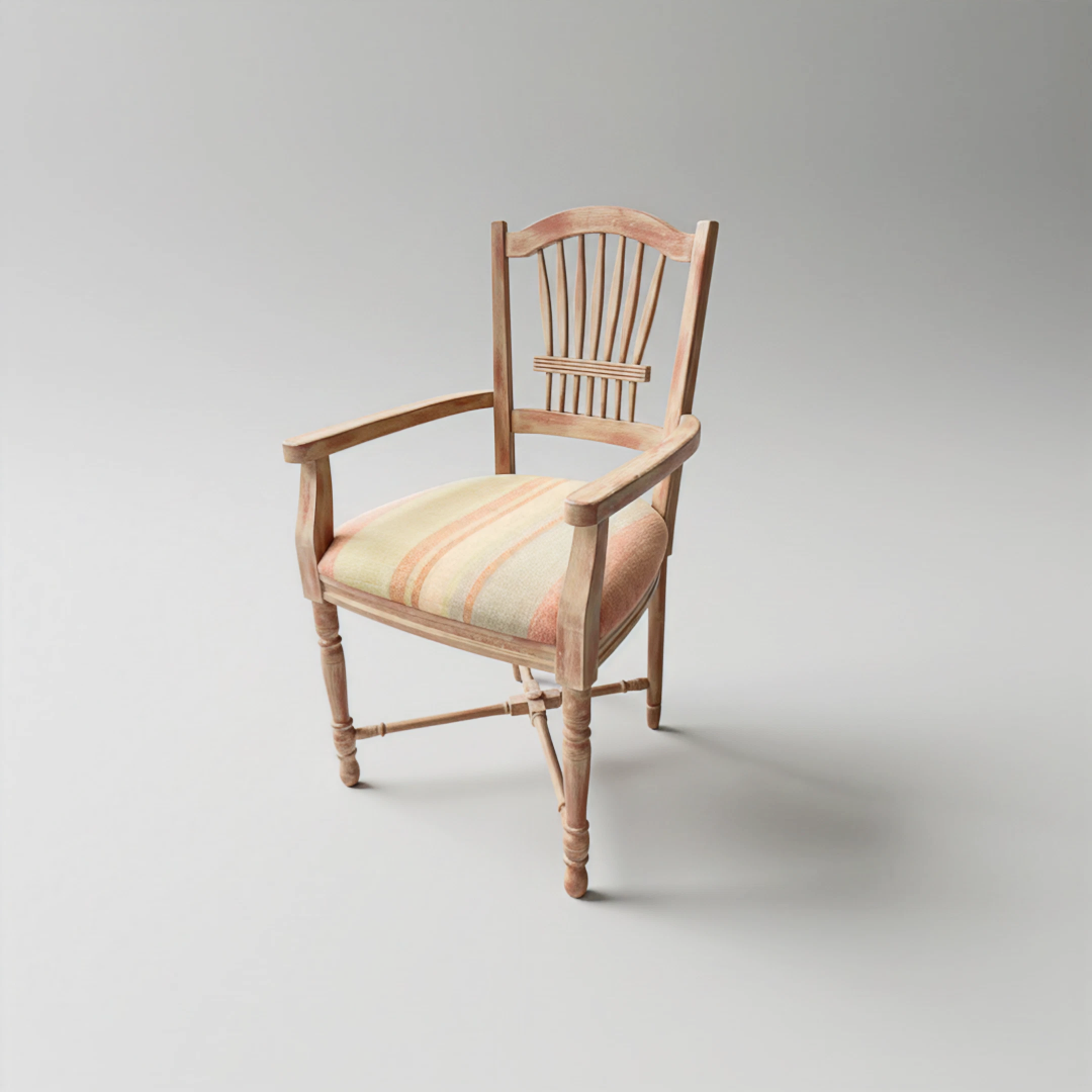 Conjunto de 6 cadeiras em madeira maciça com acabamento decapê em tons de rosa e esbranquiçado, realçando o seu carácter rústico e vintage. O design apresenta um encosto trabalhado com ripas verticais e pernas torneadas que conferem um toque clássico e artesanal. O assento é estofado em tecido de gramagem elevada com um padrão de riscas suaves em tons pastel, garantindo conforto e uma estética acolhedora.