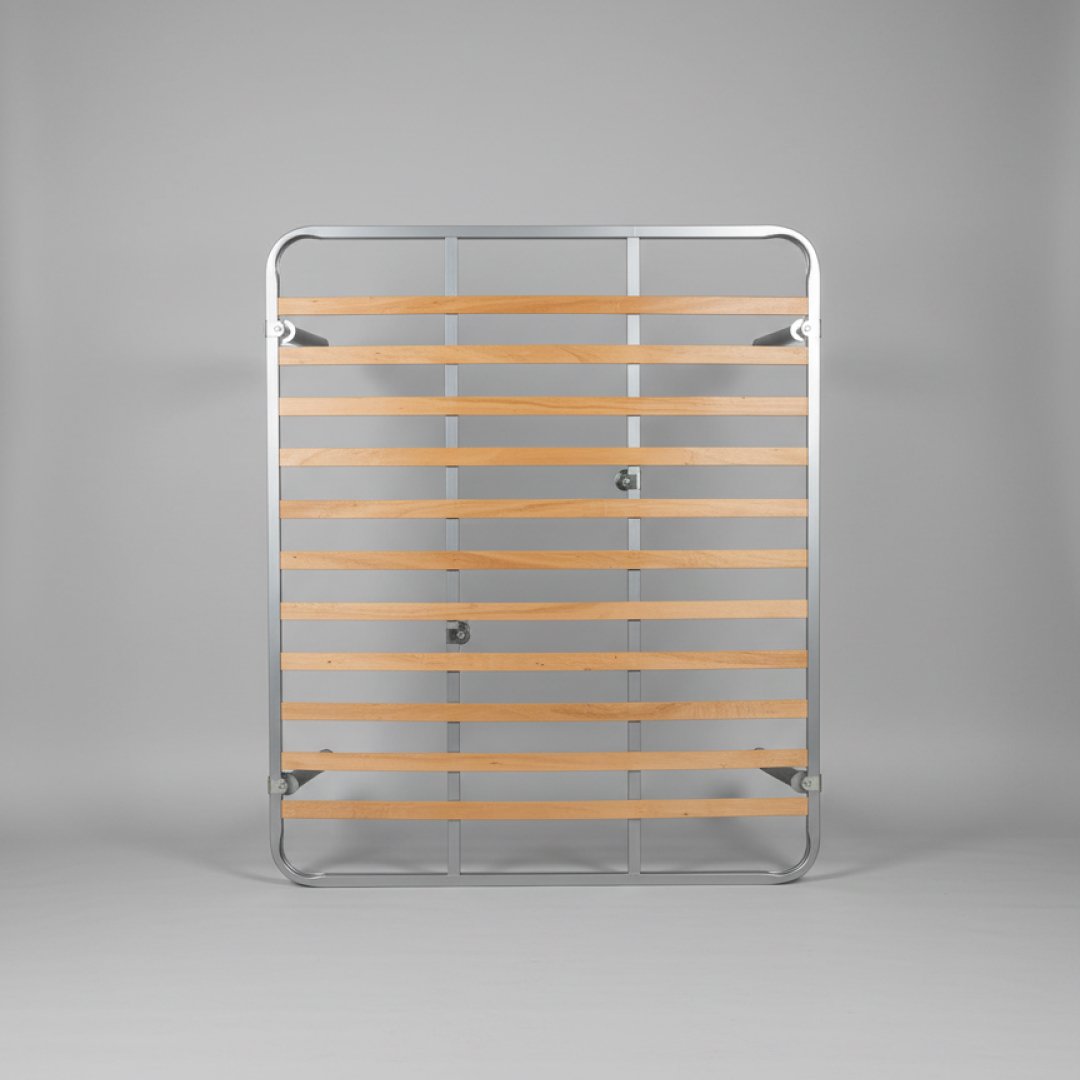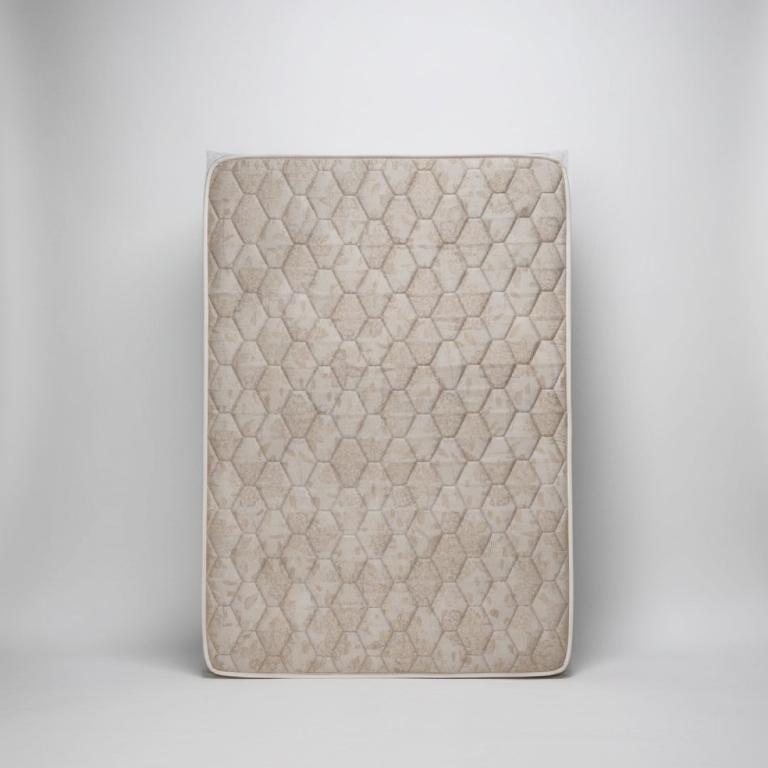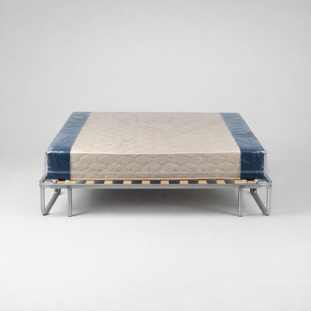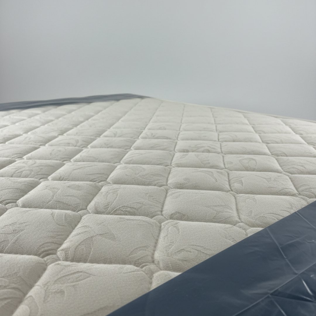 Conjunto completo de repouso composto por um colchão de casal 140x190 com padrão acolchoado e um sommier metálico com estrado de lâminas de madeira. Esta combinação foi desenhada para oferecer durabilidade e conforto ergonómico, seguindo os padrões de exigência da hotelaria. Por ser um artigo proveniente de contexto hoteleiro, pode apresentar sinais mínimos de manuseamento que não comprometem a higiene ou o conforto.