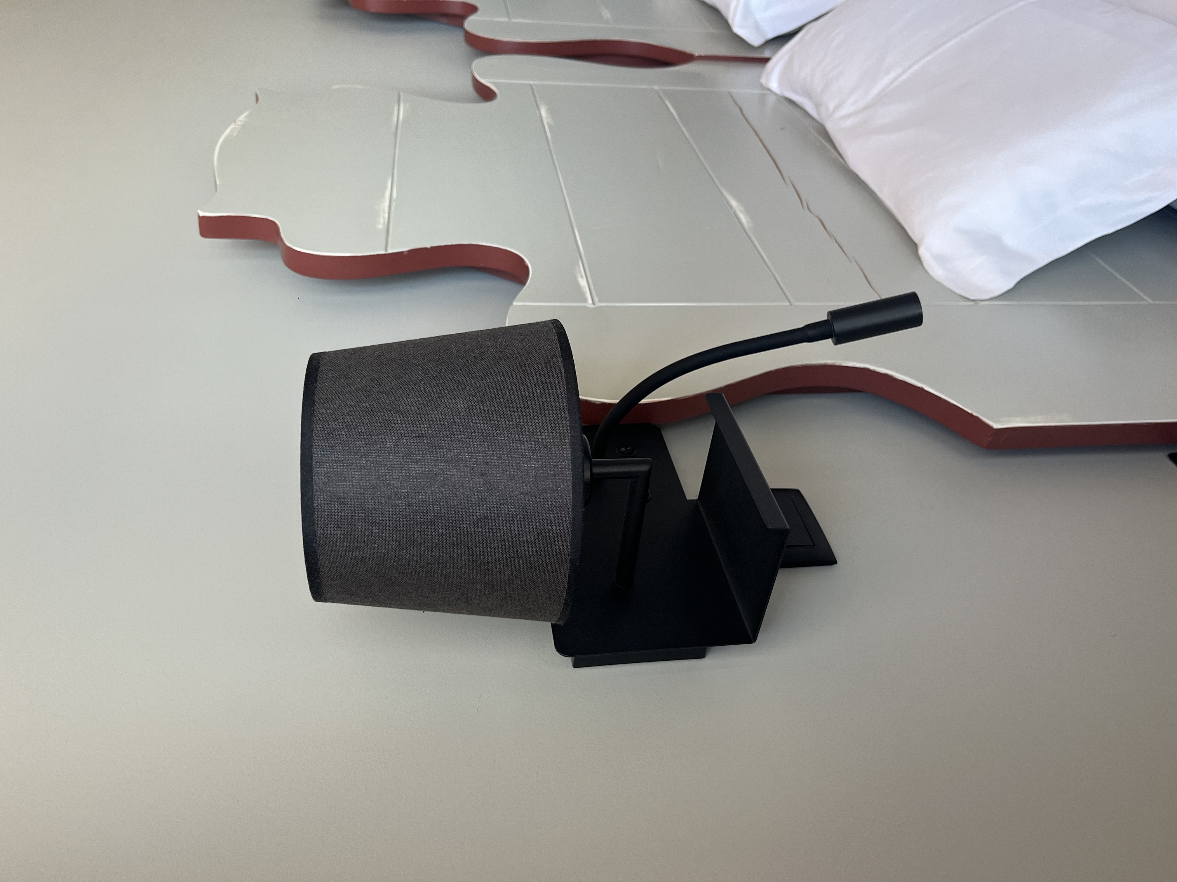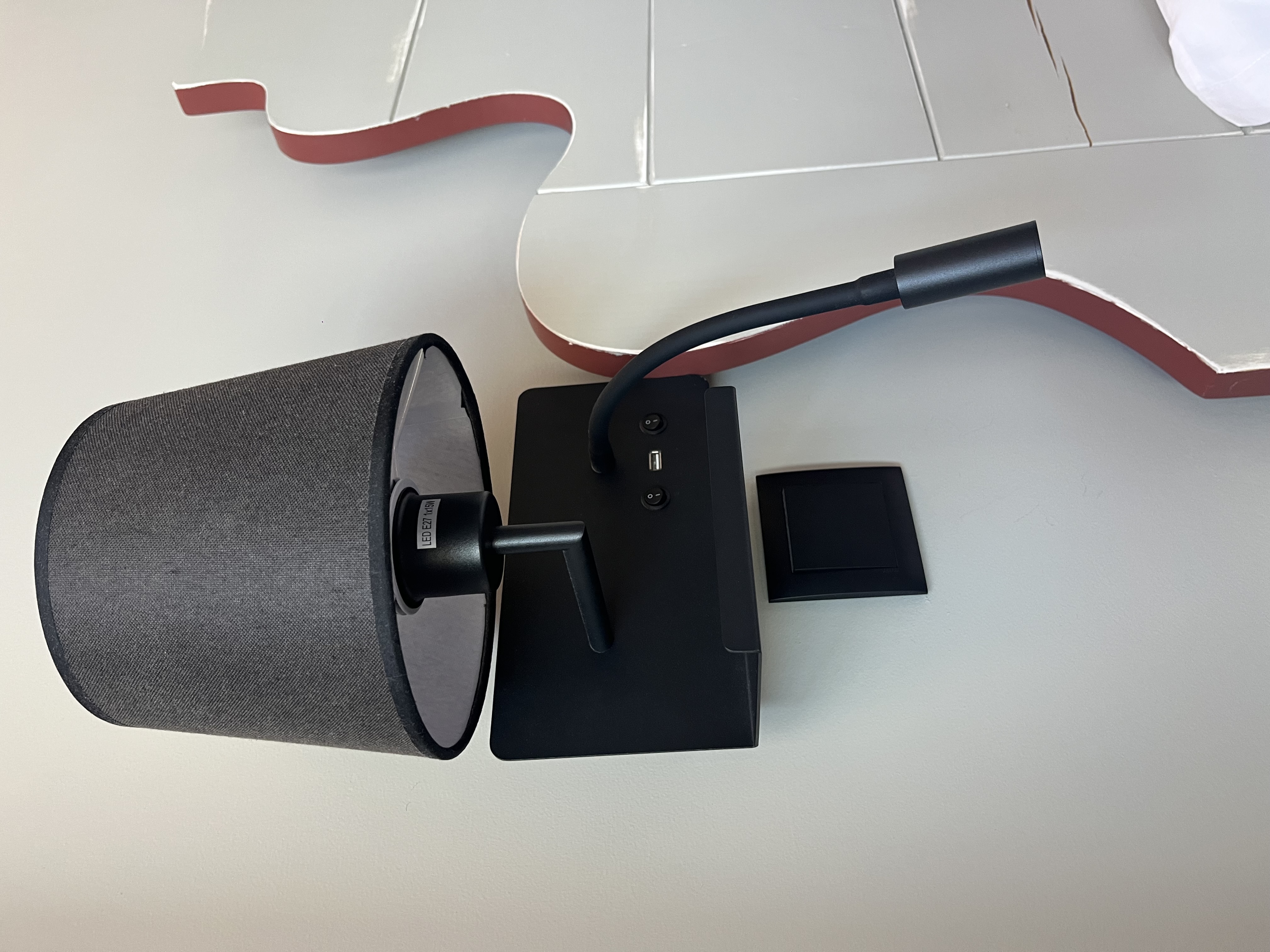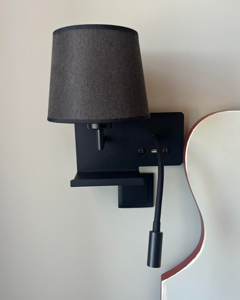 Candeeiro/aplique de parede moderno em preto, com abat-jour em tecido escuro para iluminação ambiente e luz LED flexível incorporada para leitura.