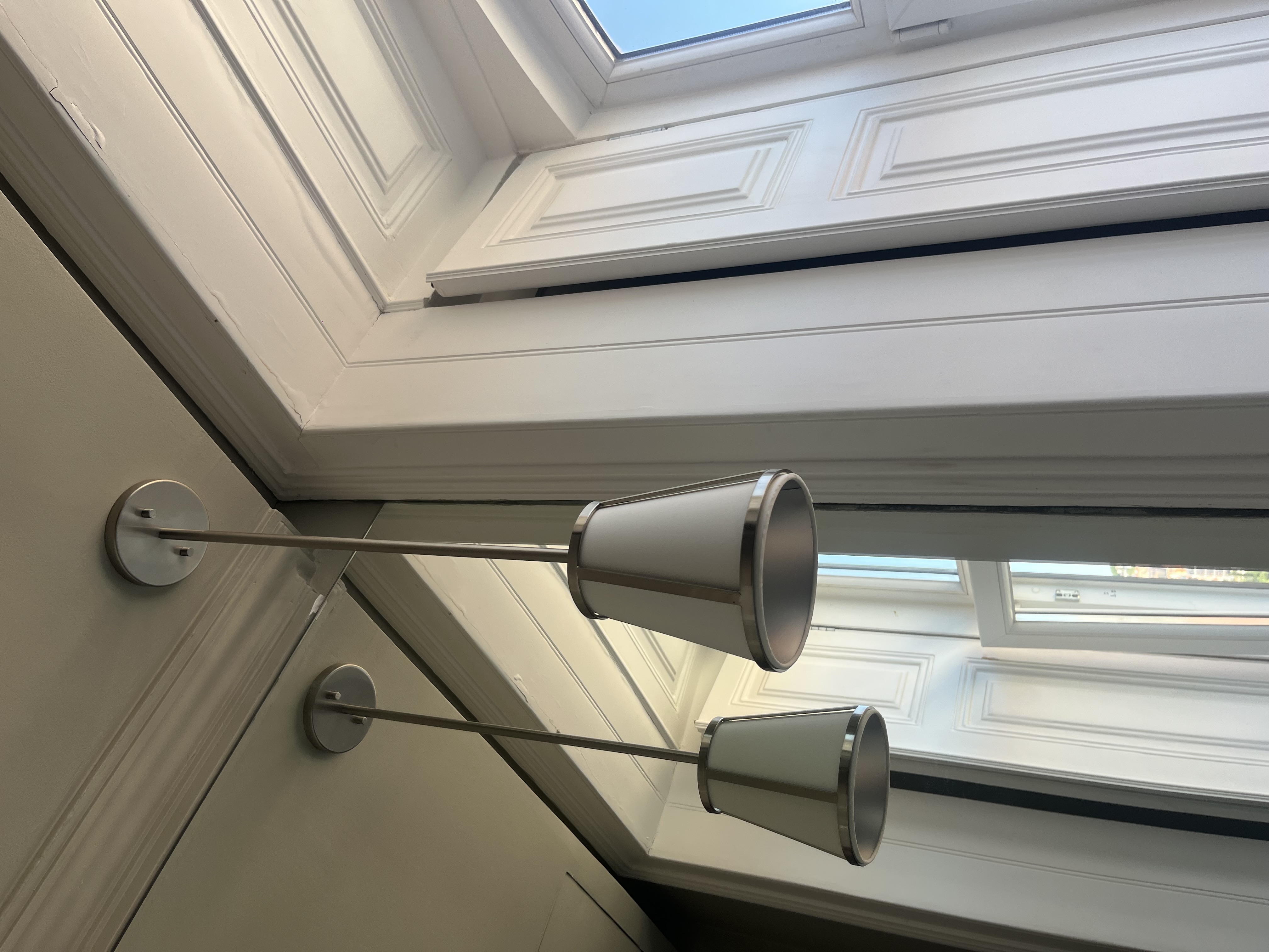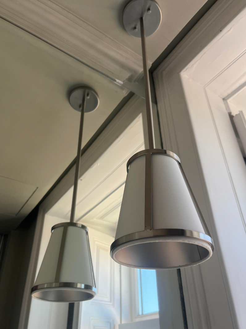 Conjunto de candeeiros suspensos com estrutura metálica em inox escovado e difusor em vidro/acrílico branco.