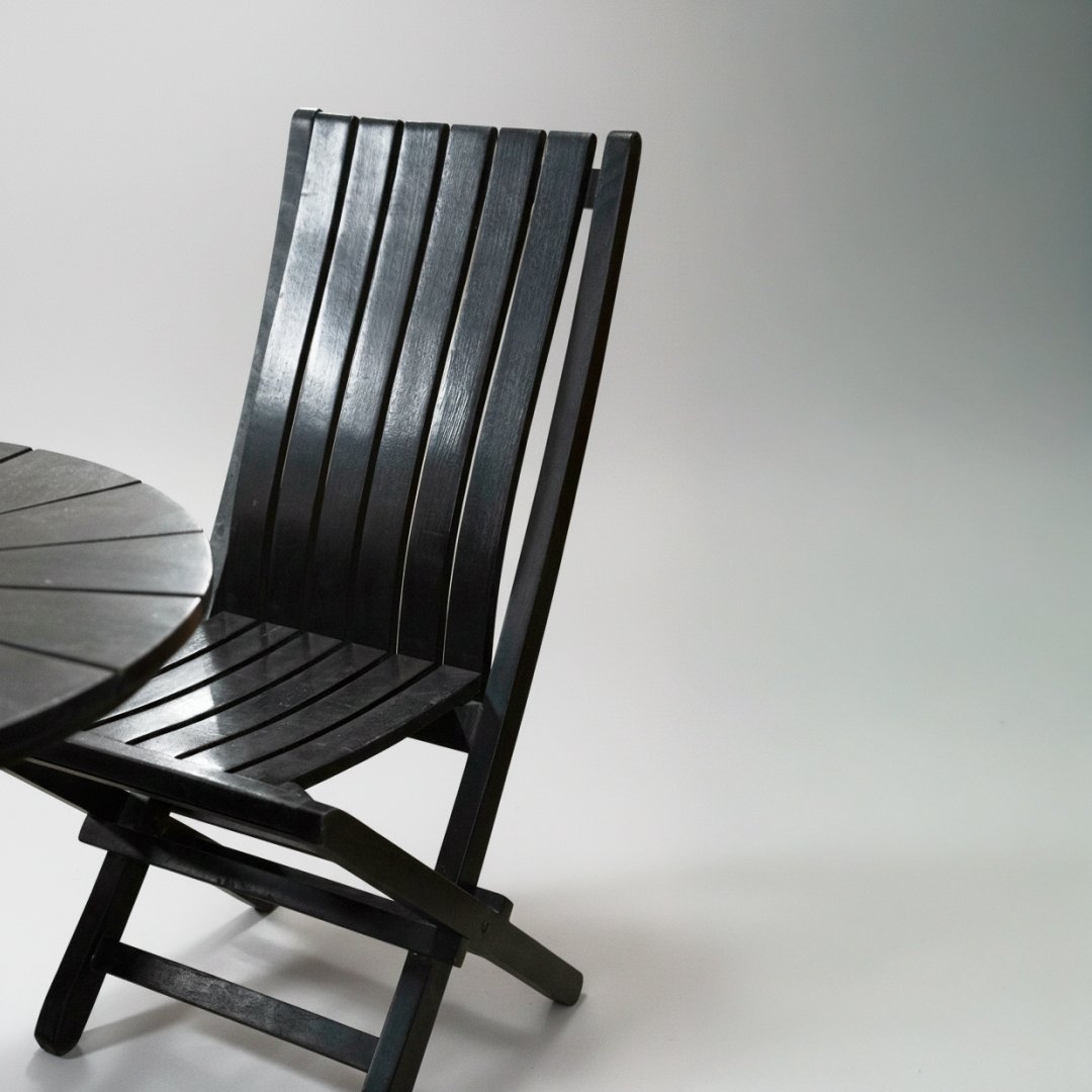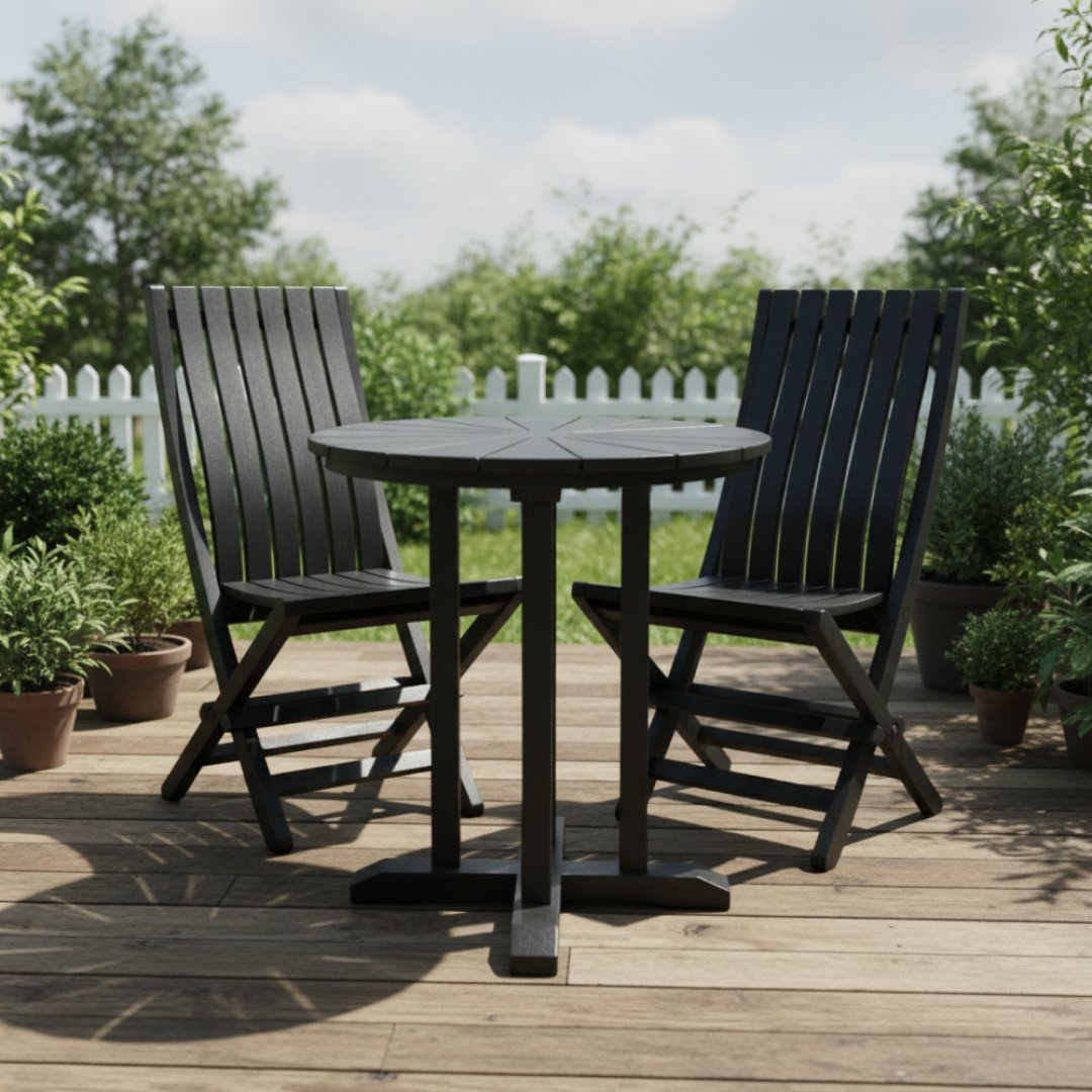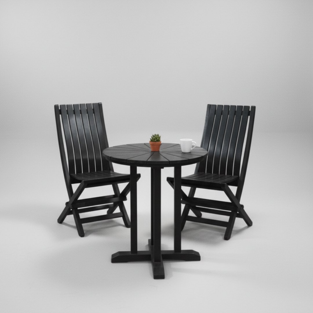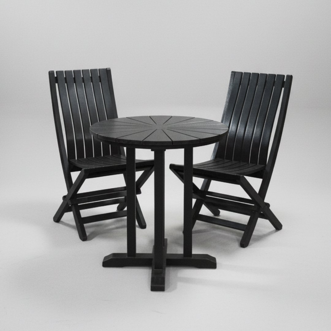 Ideal para varandas ou pequenos terraços, este conjunto foca-se na praticidade. É composto por uma mesa redonda com tampo ripado e duas cadeiras dobráveis, permitindo arrumar tudo facilmente quando não está a ser utilizado. Conjunto funcional e estável. Apresenta o desgaste natural de mobiliário de exterior e pó de armazenamento.