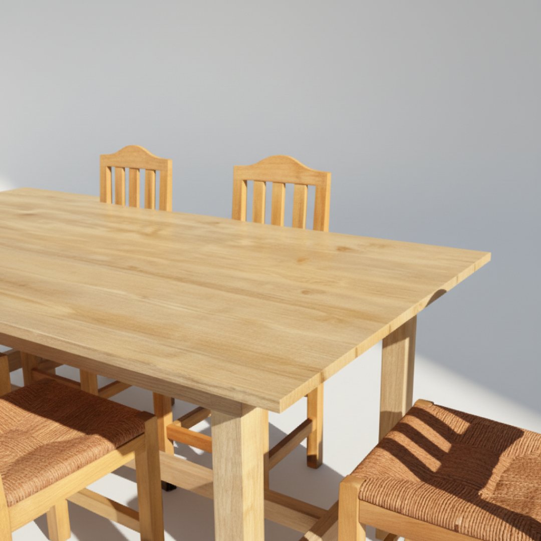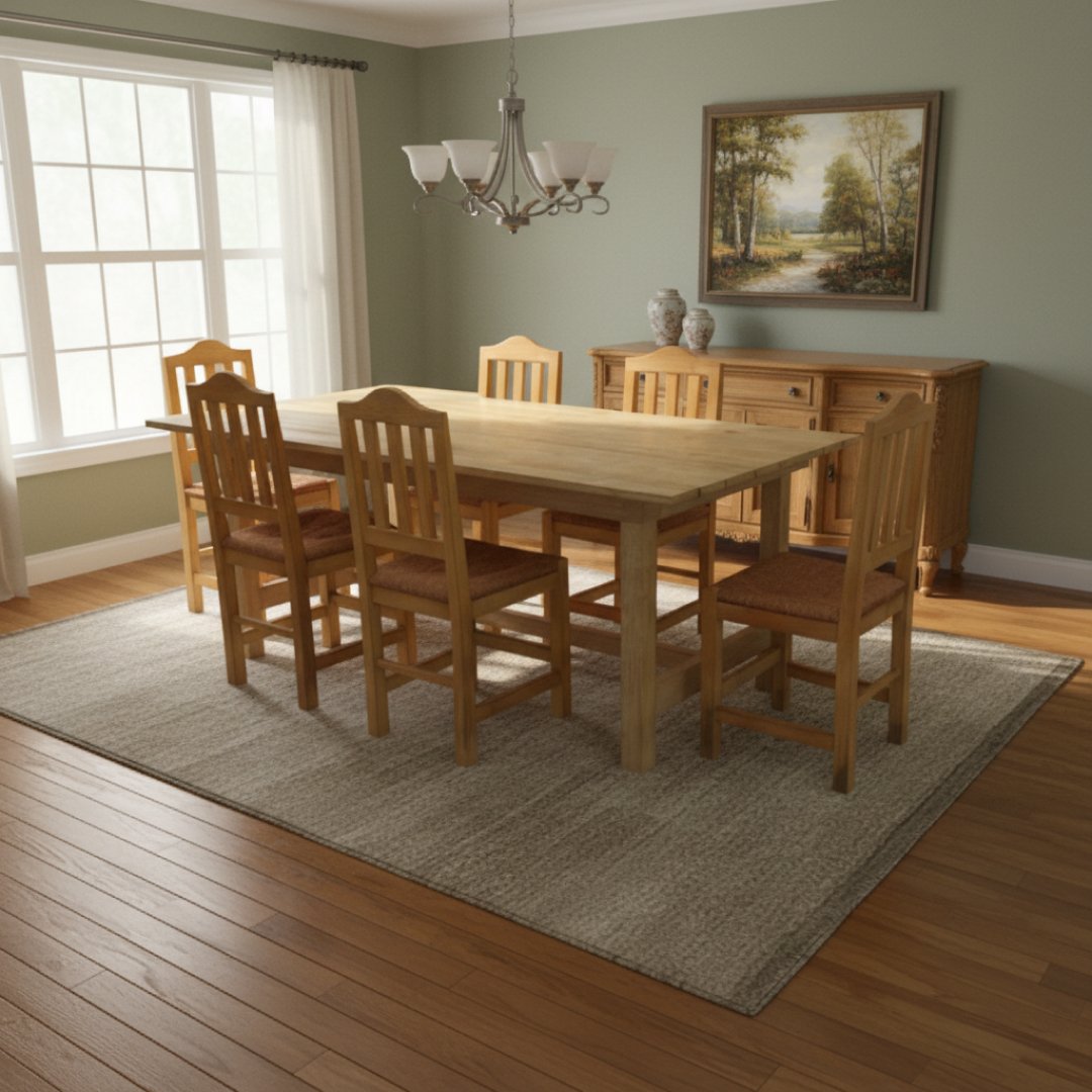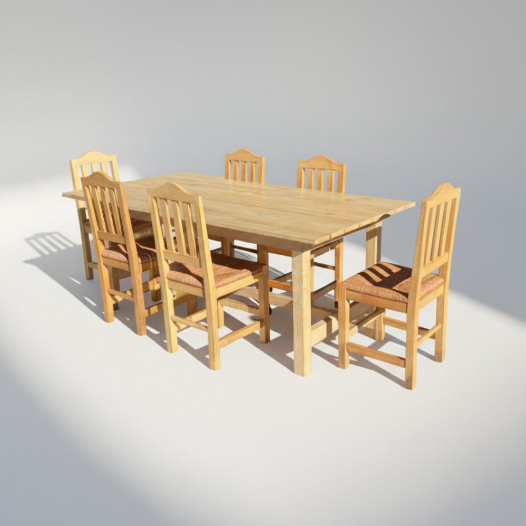 Este conjunto foca-se na durabilidade e no aspeto tradicional da madeira clara. A mesa é inteiramente em madeira, com um tampo retangular simples e pernas robustas. É acompanhada por 6 cadeiras com encosto de ripas verticais e assentos estofados num tom neutro, oferecendo um visual rústico e acolhedor. Estrutura em madeira sólida e estável. Como é habitual em mobiliário de armazém, apresenta pó e algumas marcas superficiais de manuseamento no acabamento da madeira.