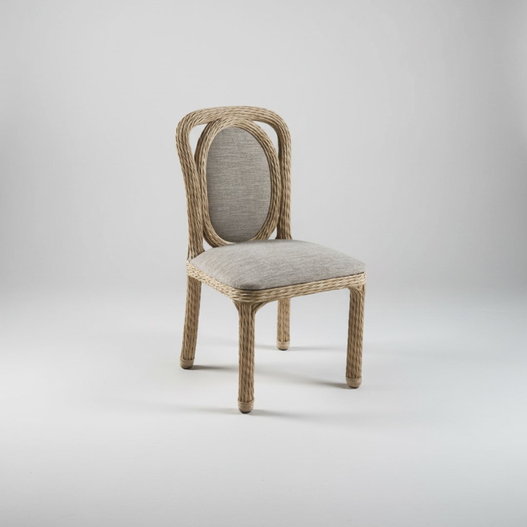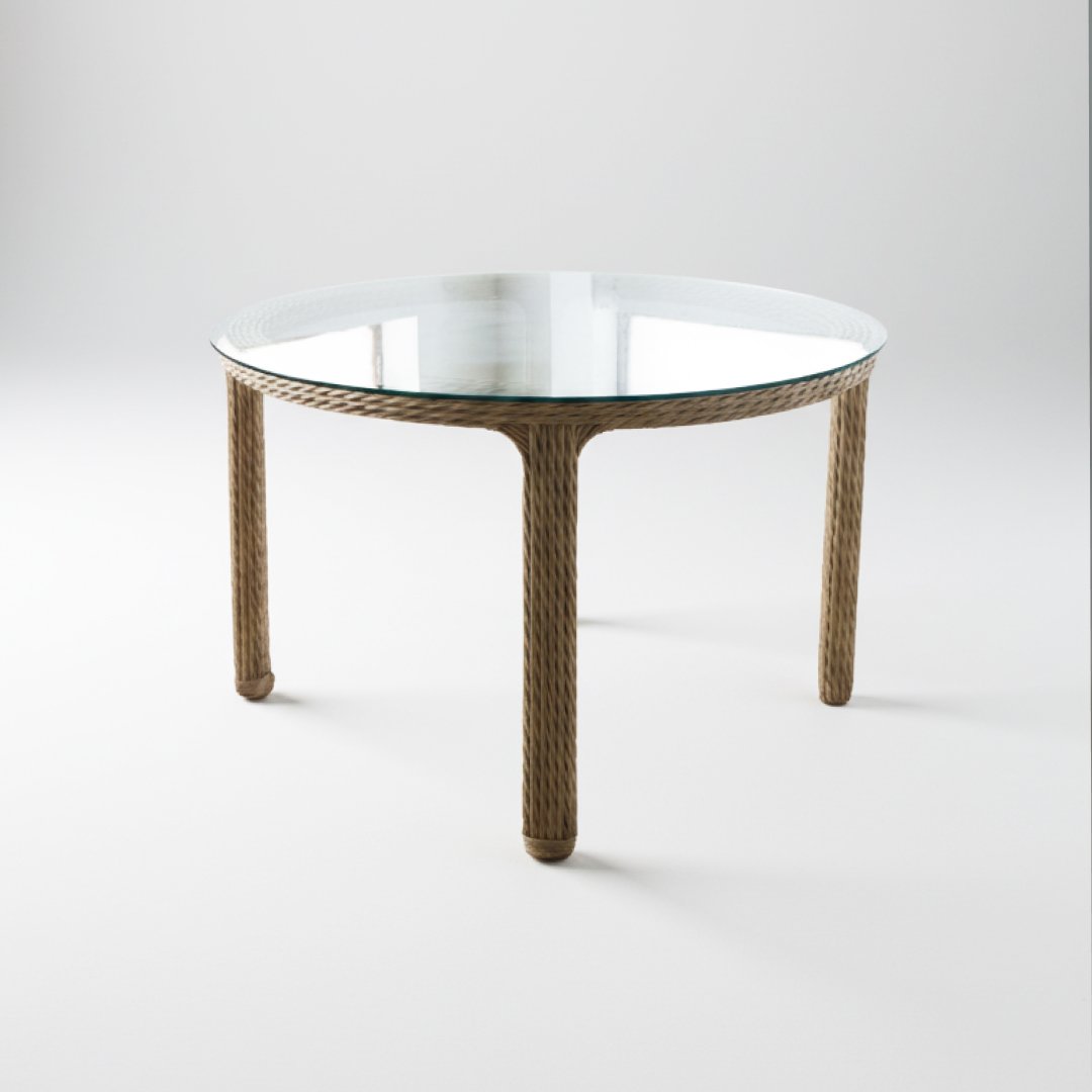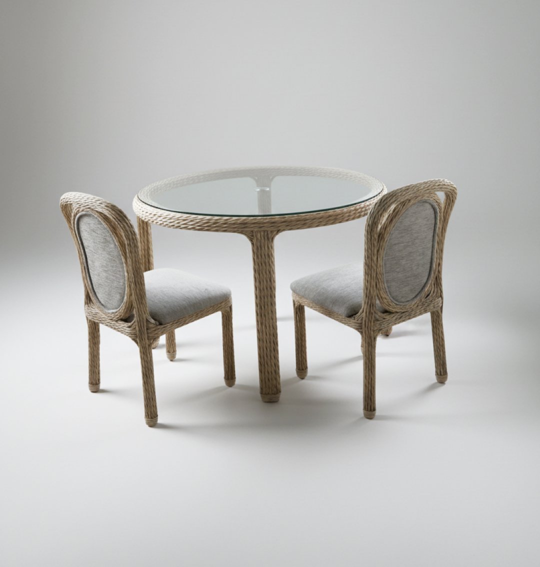 A estrutura metálica e o enrolamento em corda náutica estão em bom estado. O tampo de vidro temperado não apresenta riscos profundos. Os estofos azuis mantêm a cor vibrante, podendo apresentar apenas sinais mínimos de manuseamento. Conjunto de refeição composto por uma mesa circular com tampo de vidro e 4 cadeiras ergonómicas. Destaca-se o trabalho artesanal em corda náutica bege, que confere leveza visual ao ambiente. Os assentos são estofados em tecido num tom cinza, ideal para uso frequente.