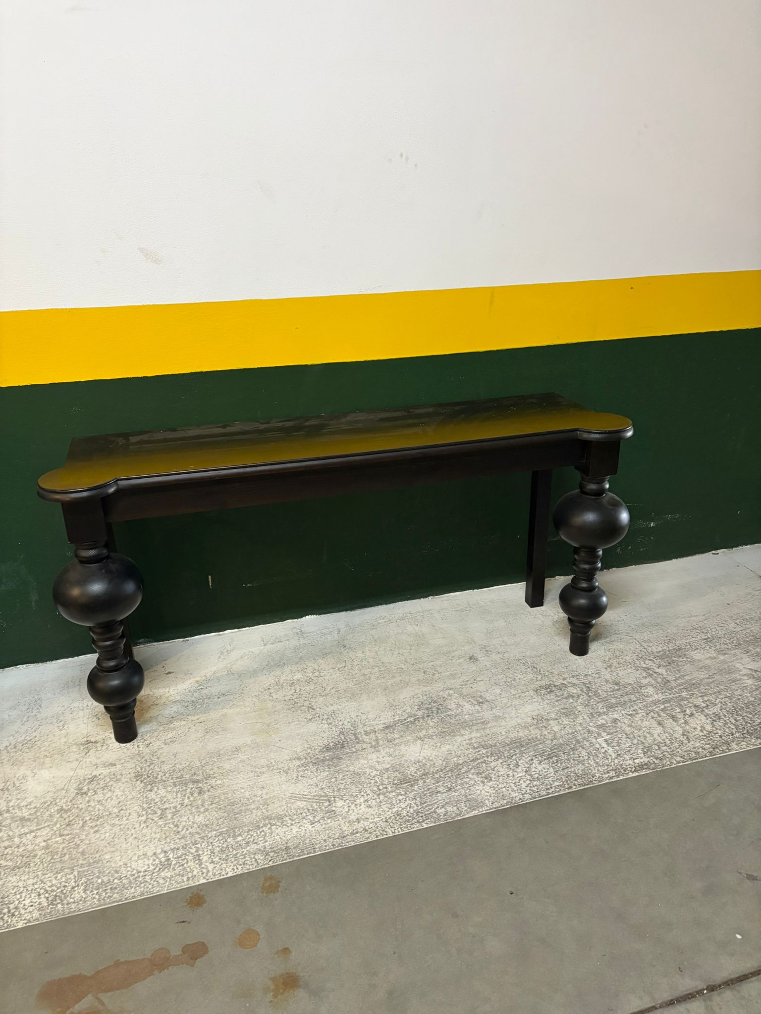 Consola em madeira, com acabamento preto e pés torneados de inspiração clássica. Peça elegante e funcional, ideal para apoio decorativo em entradas, corredores ou zonas de destaque.