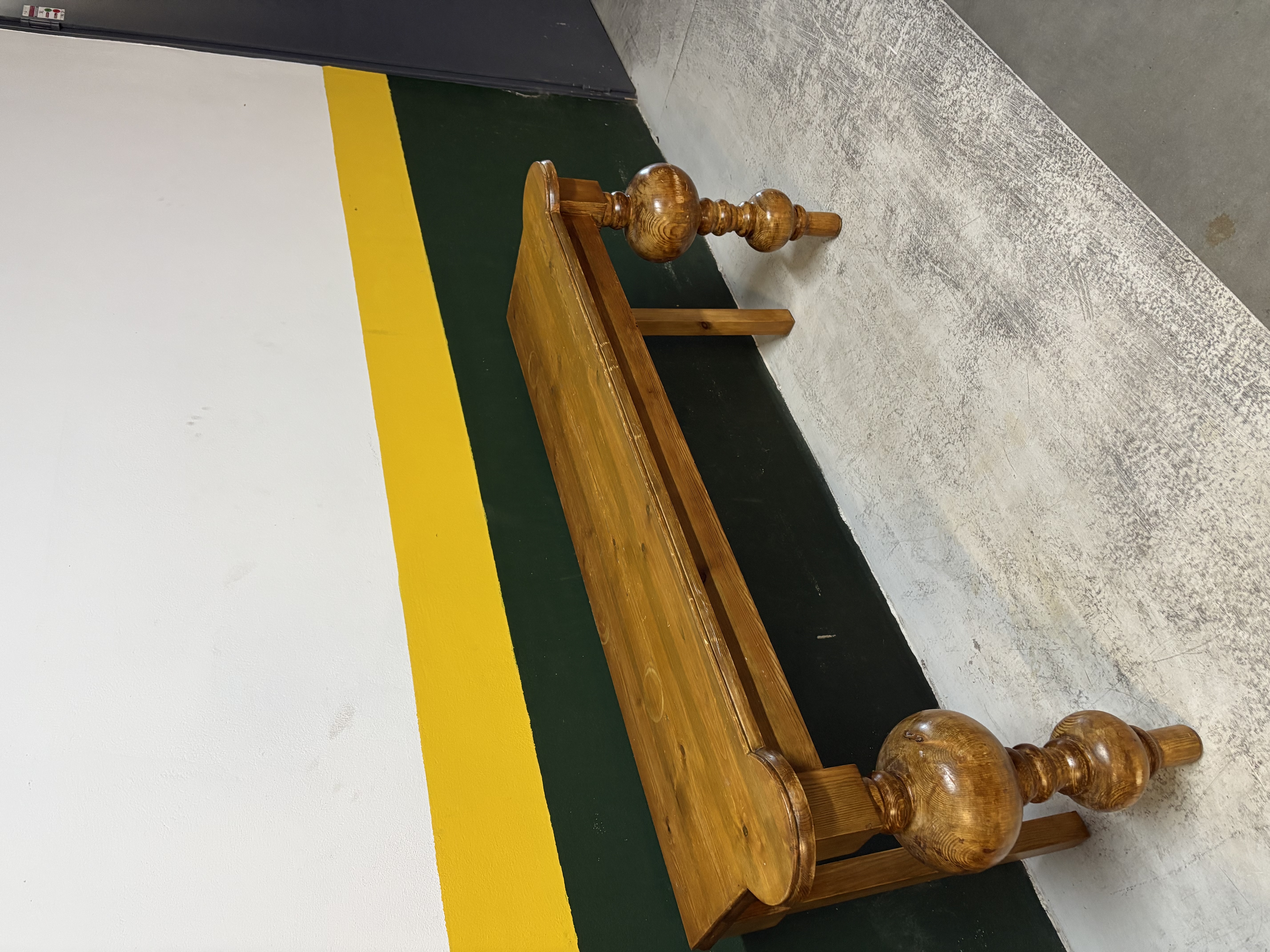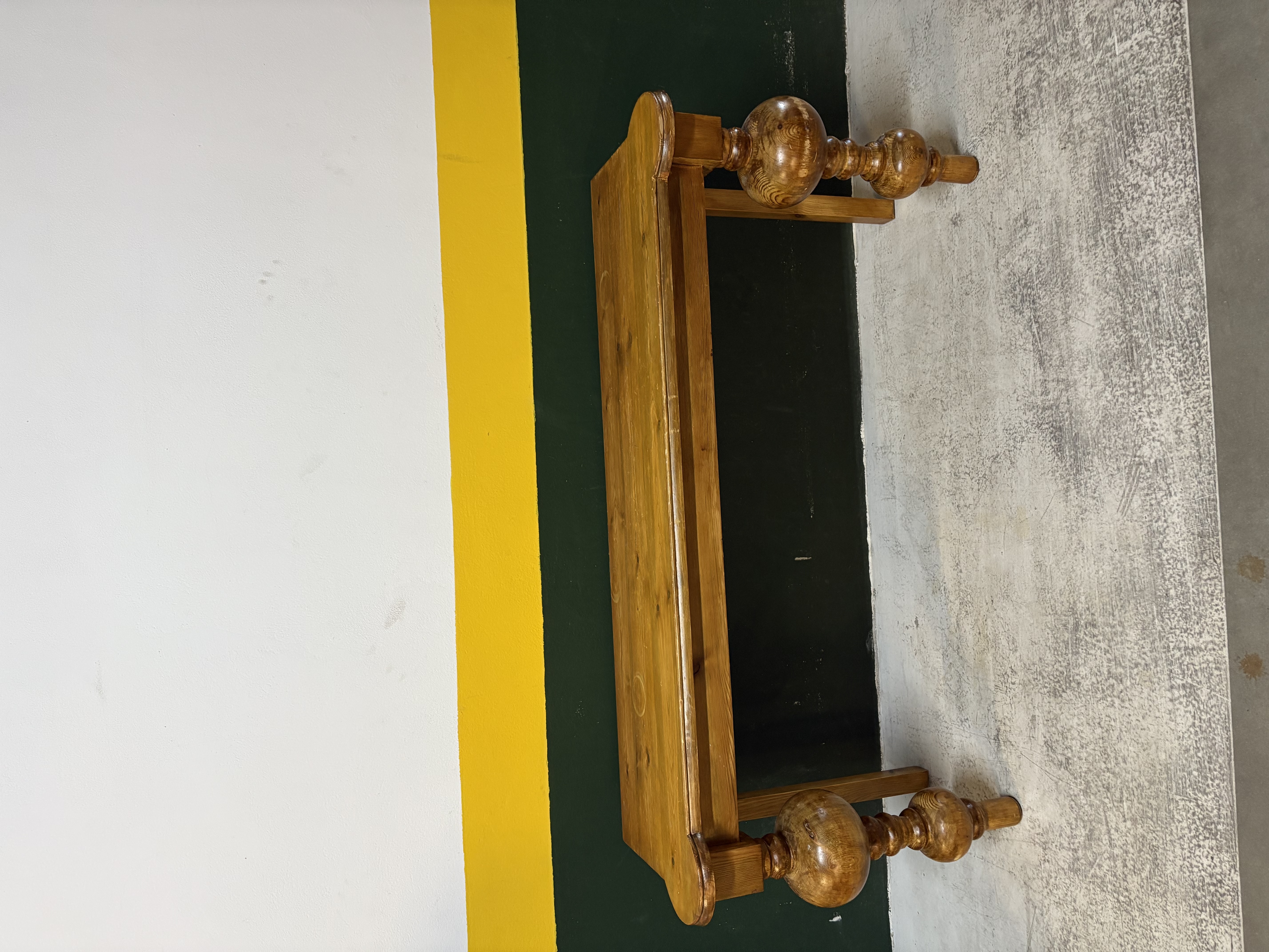 Consola em madeira maciça, com pés torneados de inspiração clássica e tampo retangular. Peça sólida e decorativa, ideal para apoio e organização em zonas de passagem ou espaços de destaque.