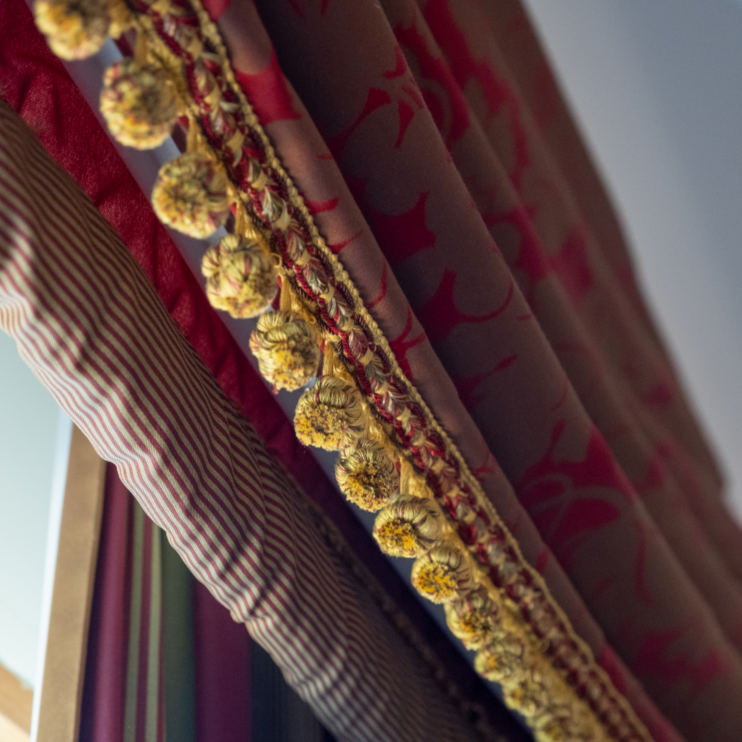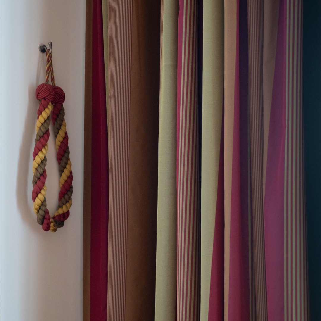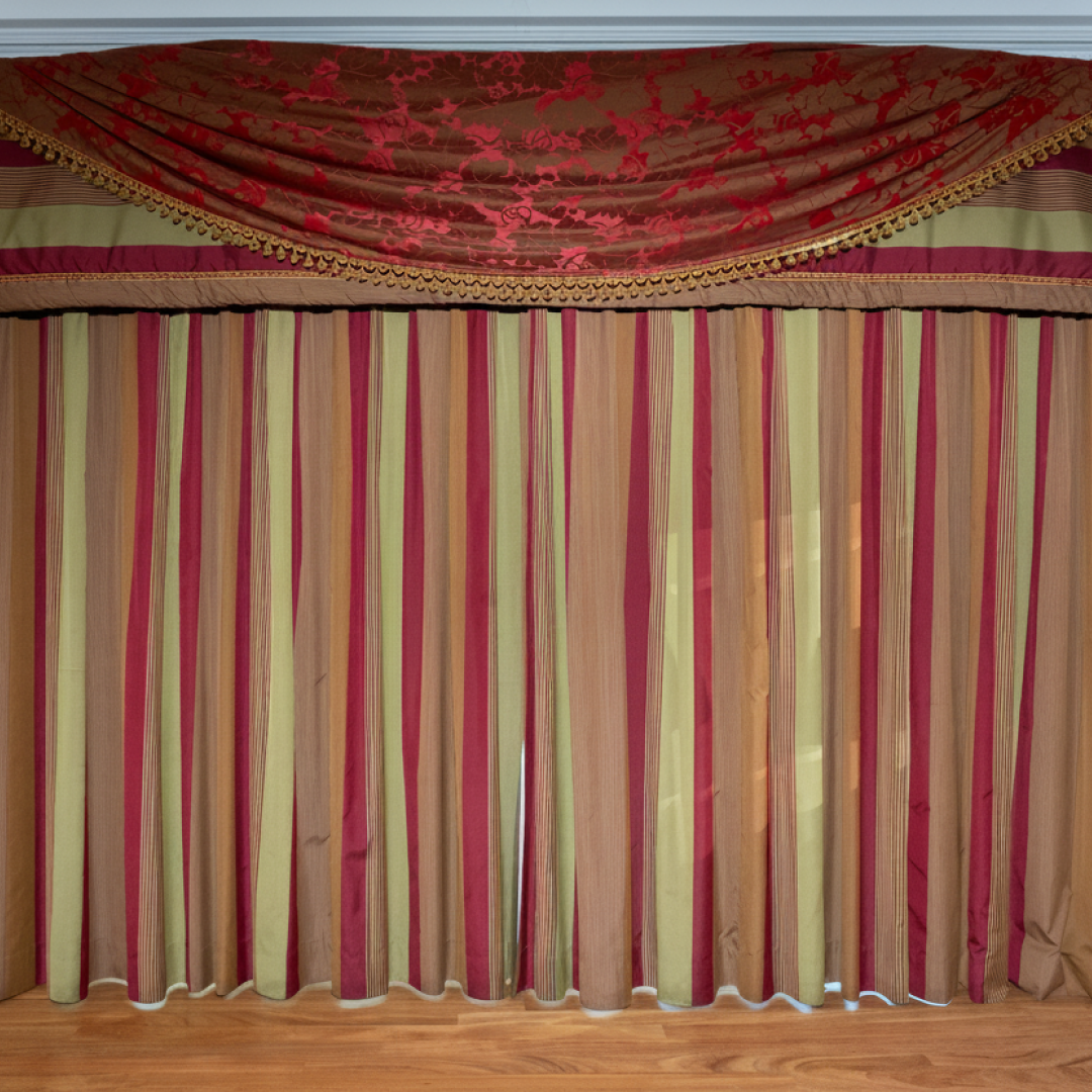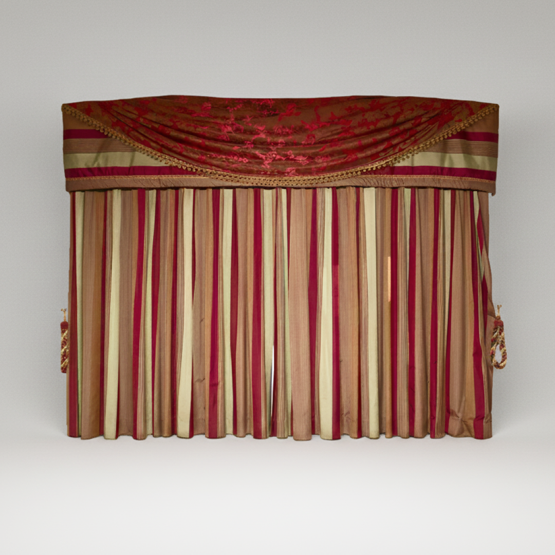 Elegante conjunto de cortinados de estilo clássico, com um padrão de riscas verticais em tons terra, bordeaux e dourado. O conjunto destaca-se pela sua sanefa estruturada e decorada com passamanaria e detalhes em relevo, conferindo um aspeto imponente a qualquer janela. É uma solução completa para quem procura um ambiente sofisticado, pois já inclui a calha para uma instalação imediata.