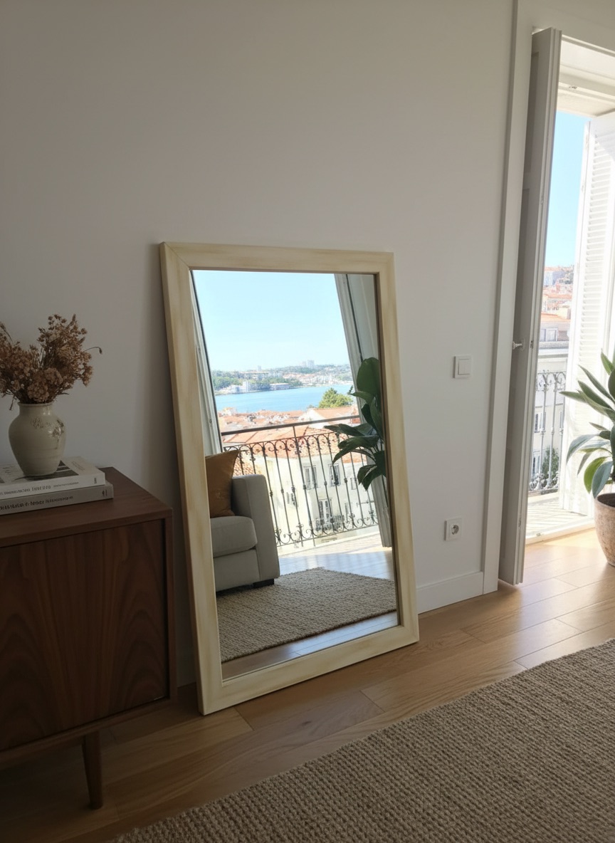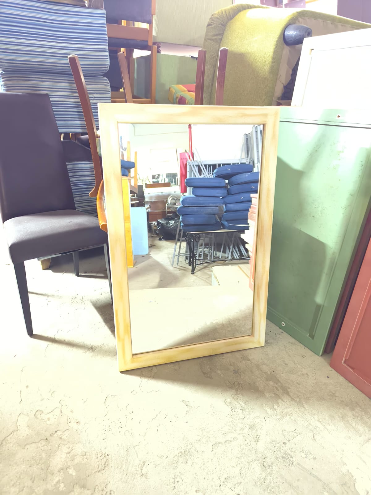 Este espelho combina linhas simples com um acabamento amarelo/esbranquiçado, perfeito para dar carácter a qualquer quarto, hall ou espaço comercial.