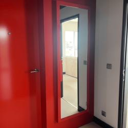 Espelho de corpo inteiro com moldura vermelha. Peça funcional e contemporânea, ideal para acrescentar cor e personalidade a espaços modernos.