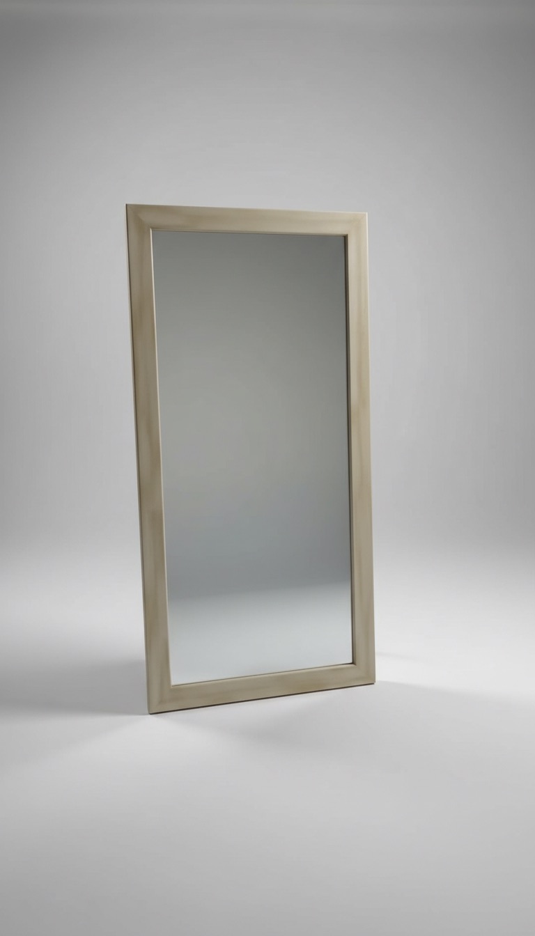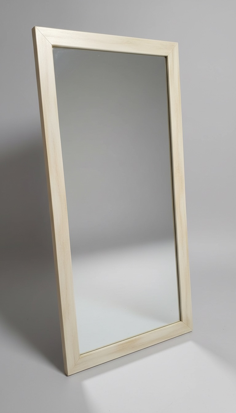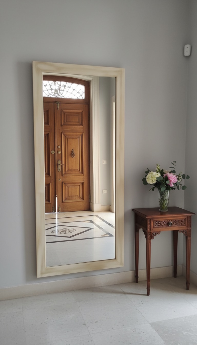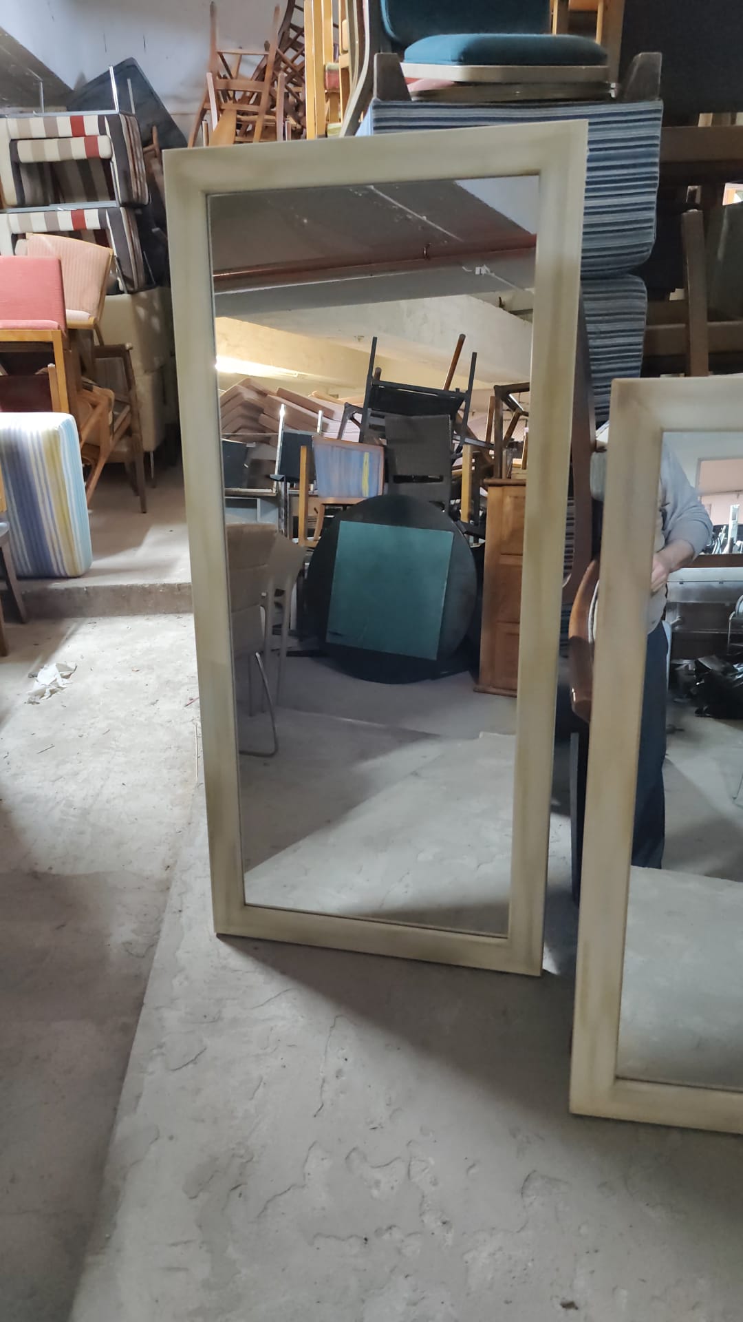 Espelho vertical de corpo inteiro com moldura larga em madeira com acabamento amarelo envelhecido.