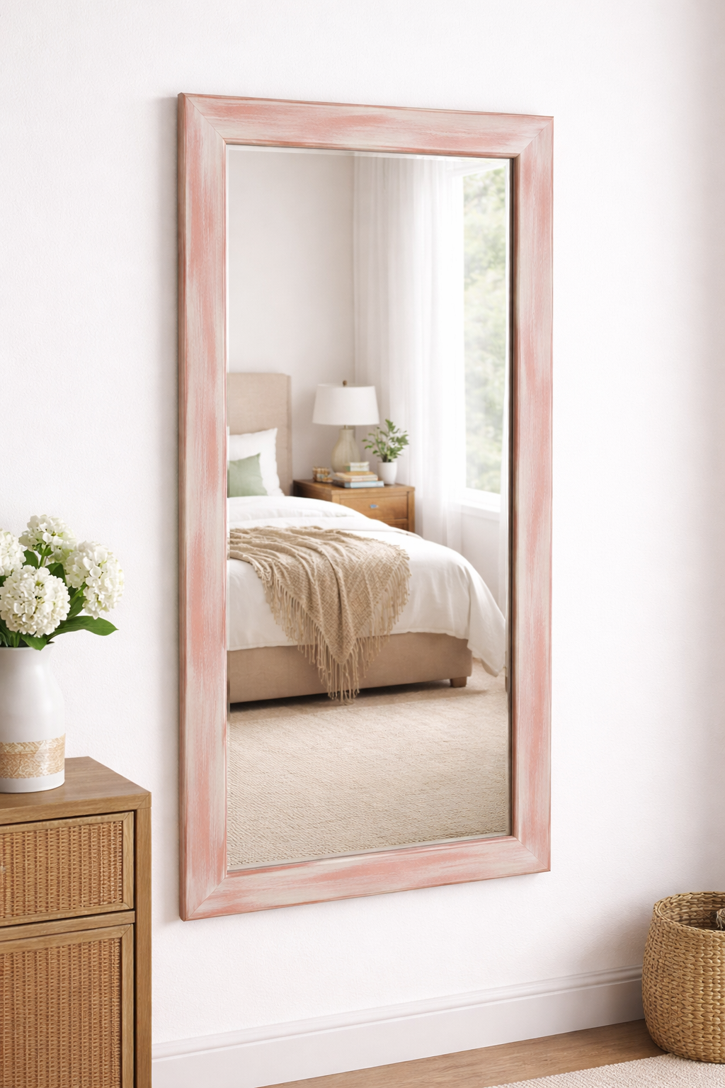 Espelho vertical de corpo inteiro com moldura larga em madeira com acabamento encarnado envelhecido.