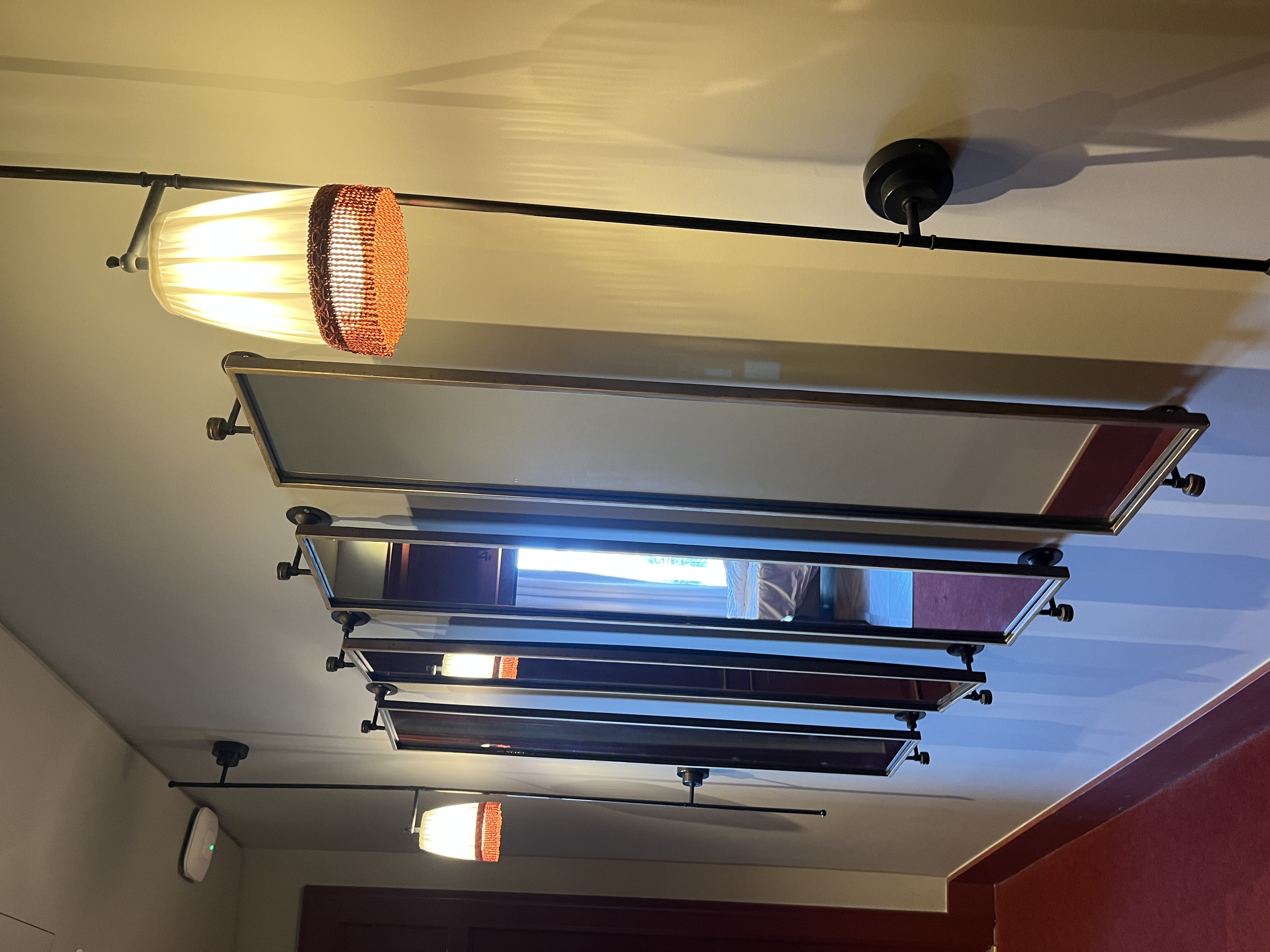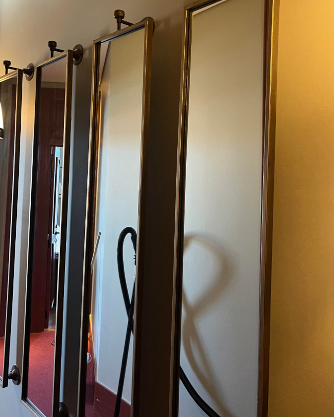 Espelhos retangulares de parede, com moldura fina em tom dourado/bronze.