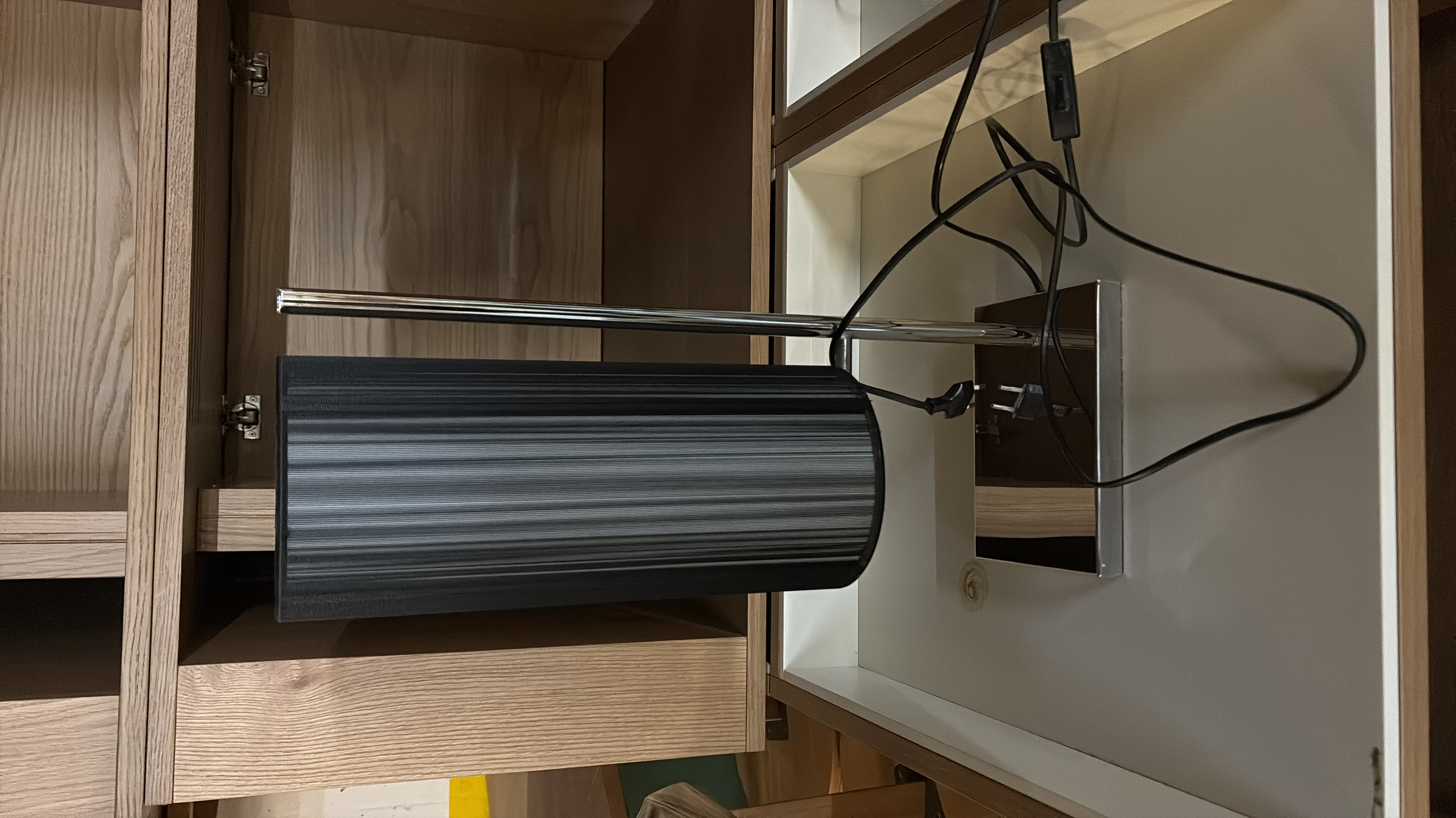 Luminária de mesa de design contemporâneo. Combina uma base metálica cromada com cúpula cilíndrica em tom escuro, criando uma peça elegante, discreta e versátil