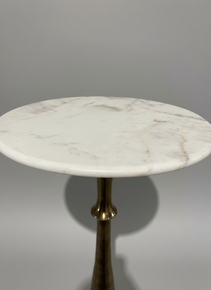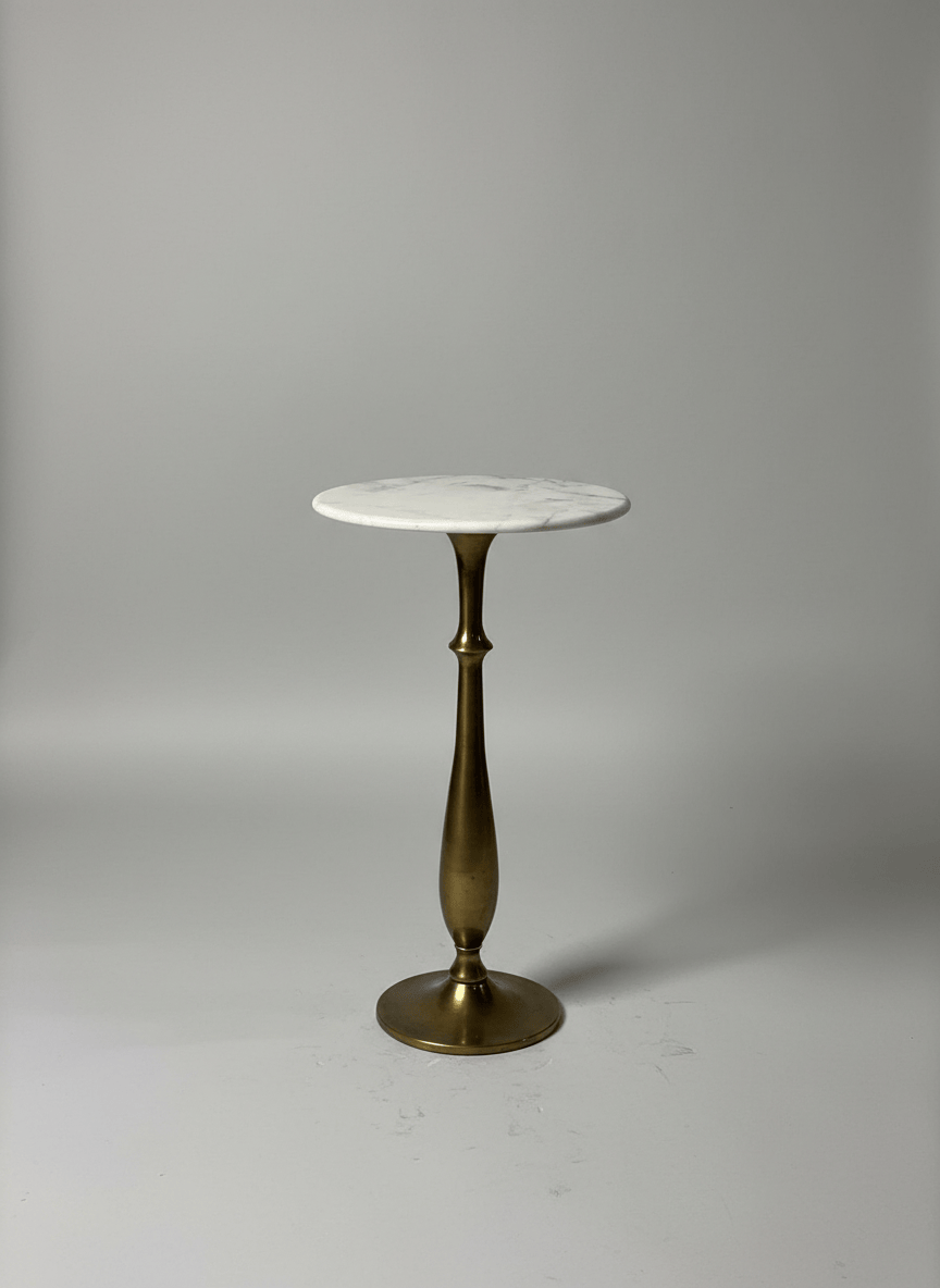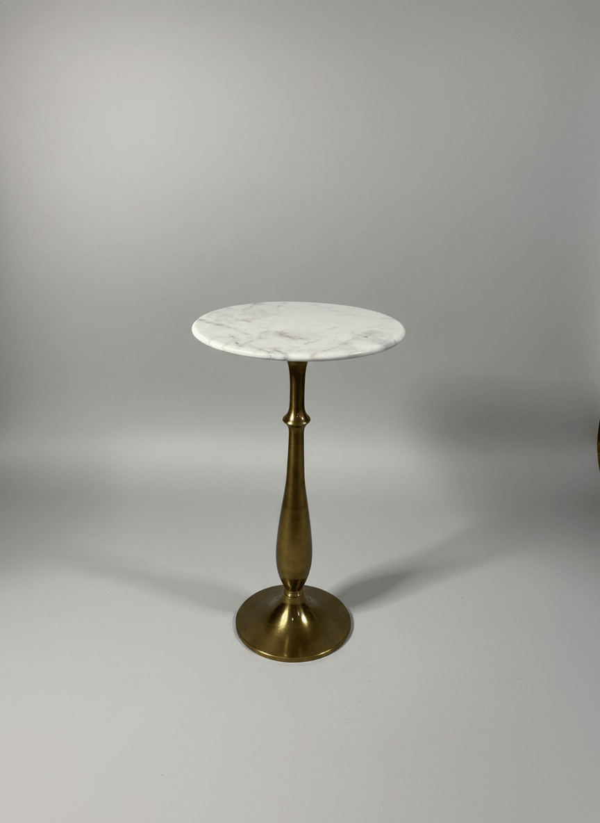 Mesa de apoio alta, de formato redondo, com tampo em mármore claro e base em metal dourado. Uma peça elegante e versátil, ideal para halls de entrada, corredores, salas ou espaços comerciais, funcionando como apoio decorativo ou ponto de destaque. O contraste entre o mármore e o metal confere um estilo clássico e sofisticado.