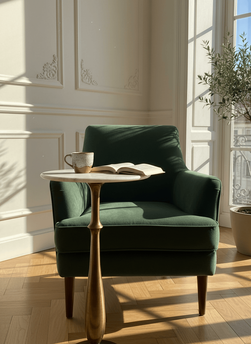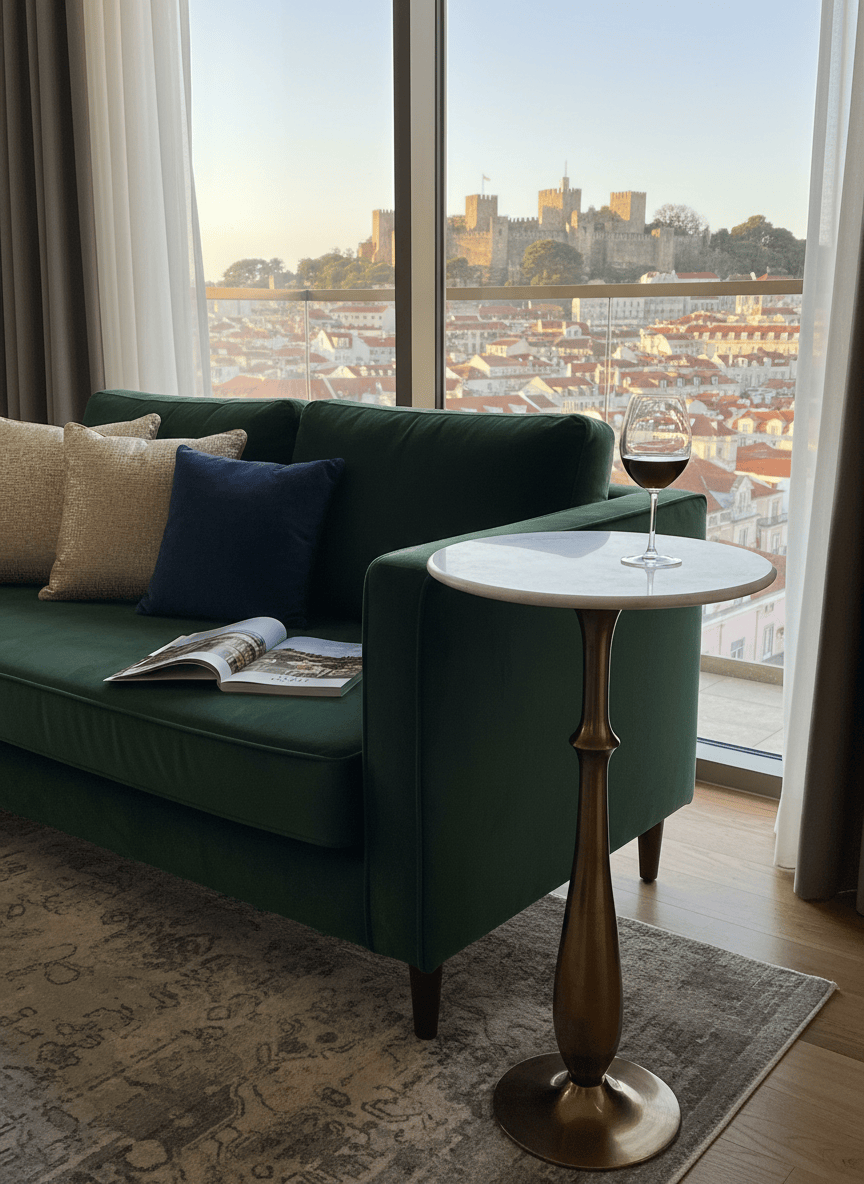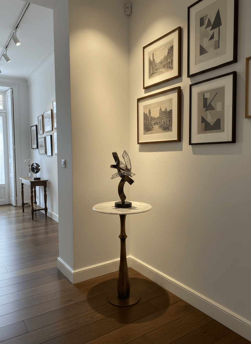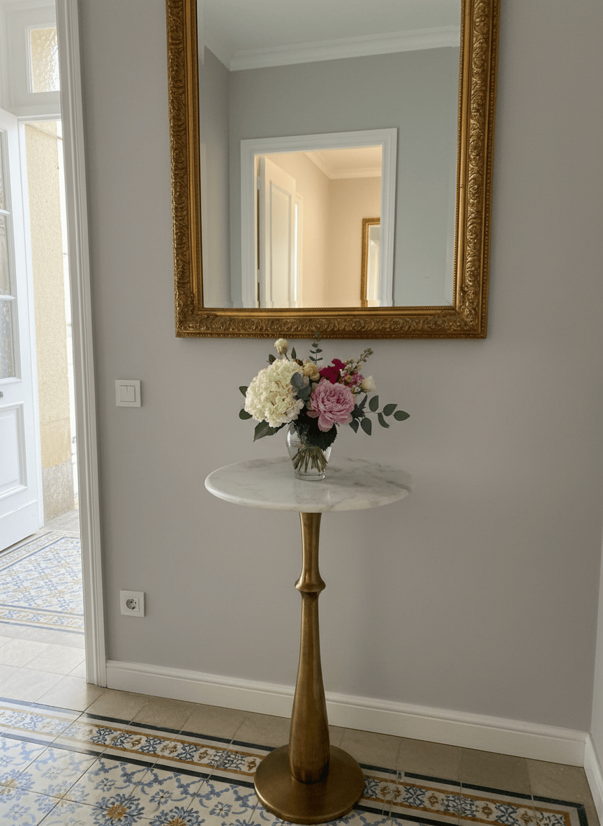 Mesa de apoio alta, de formato redondo, com tampo em mármore claro e base em metal dourado. Uma peça elegante e versátil, ideal para halls de entrada, corredores, salas ou espaços comerciais, funcionando como apoio decorativo ou ponto de destaque. O contraste entre o mármore e o metal confere um estilo clássico e sofisticado.