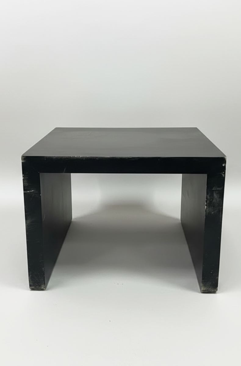 Mesa de centro de design minimalista, com linhas retas e formato em “U”, construída em madeira lacada a preto. A estrutura sólida e geométrica confere um aspeto moderno e robusto, ideal para espaços contemporâneos ou áreas de lounge em hotelaria.