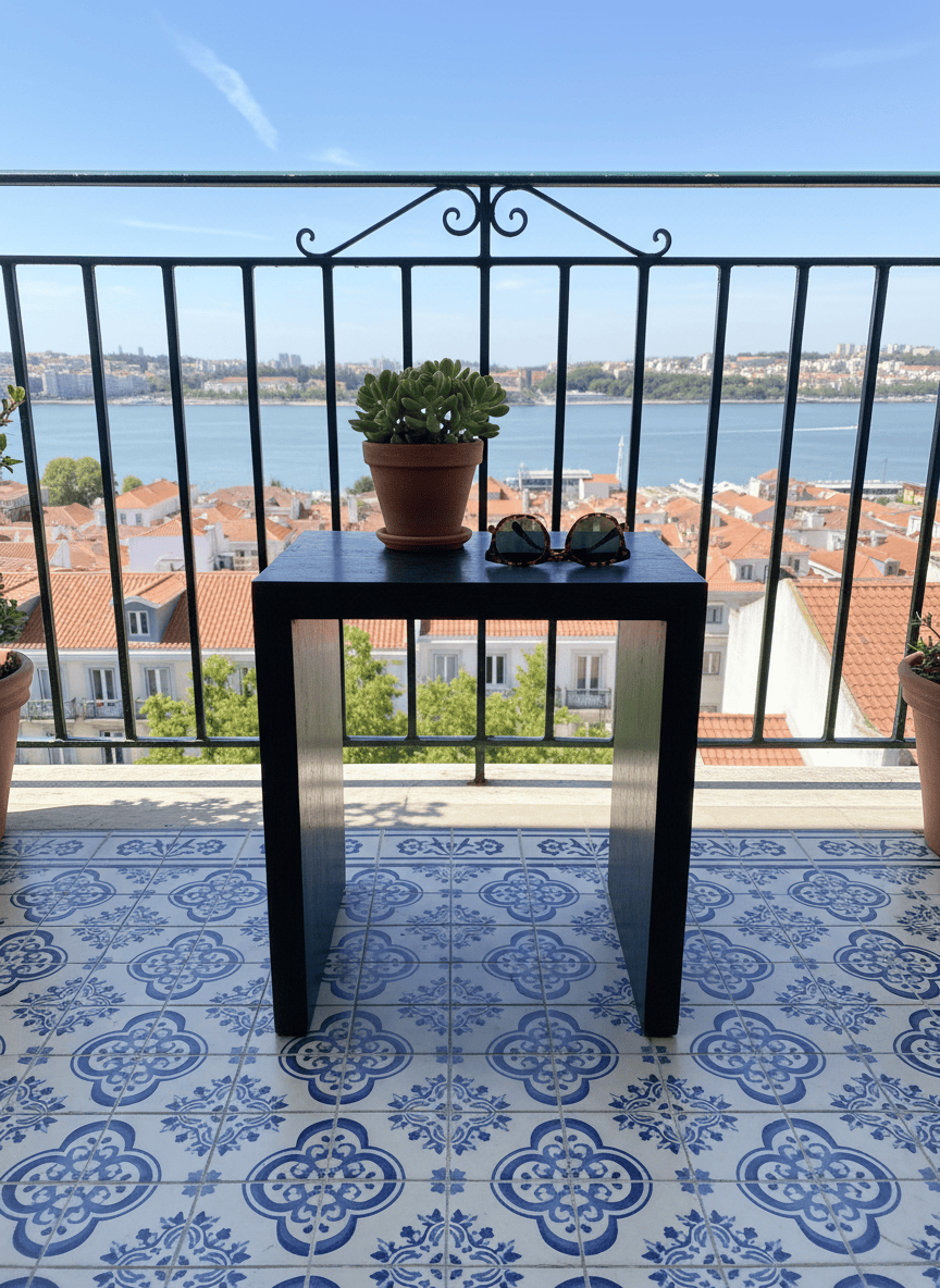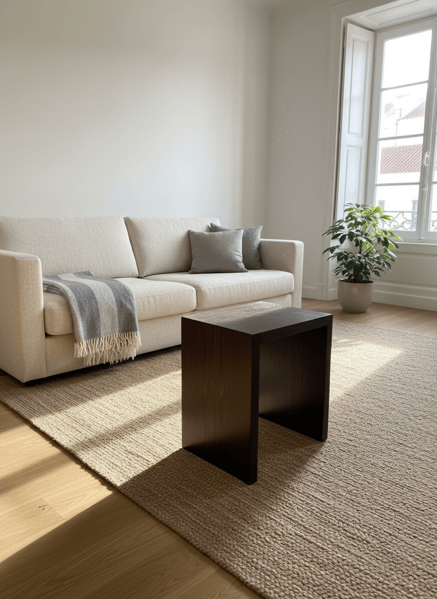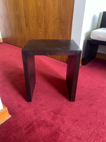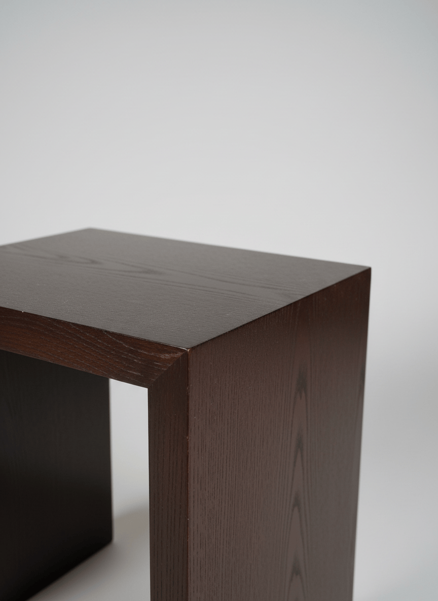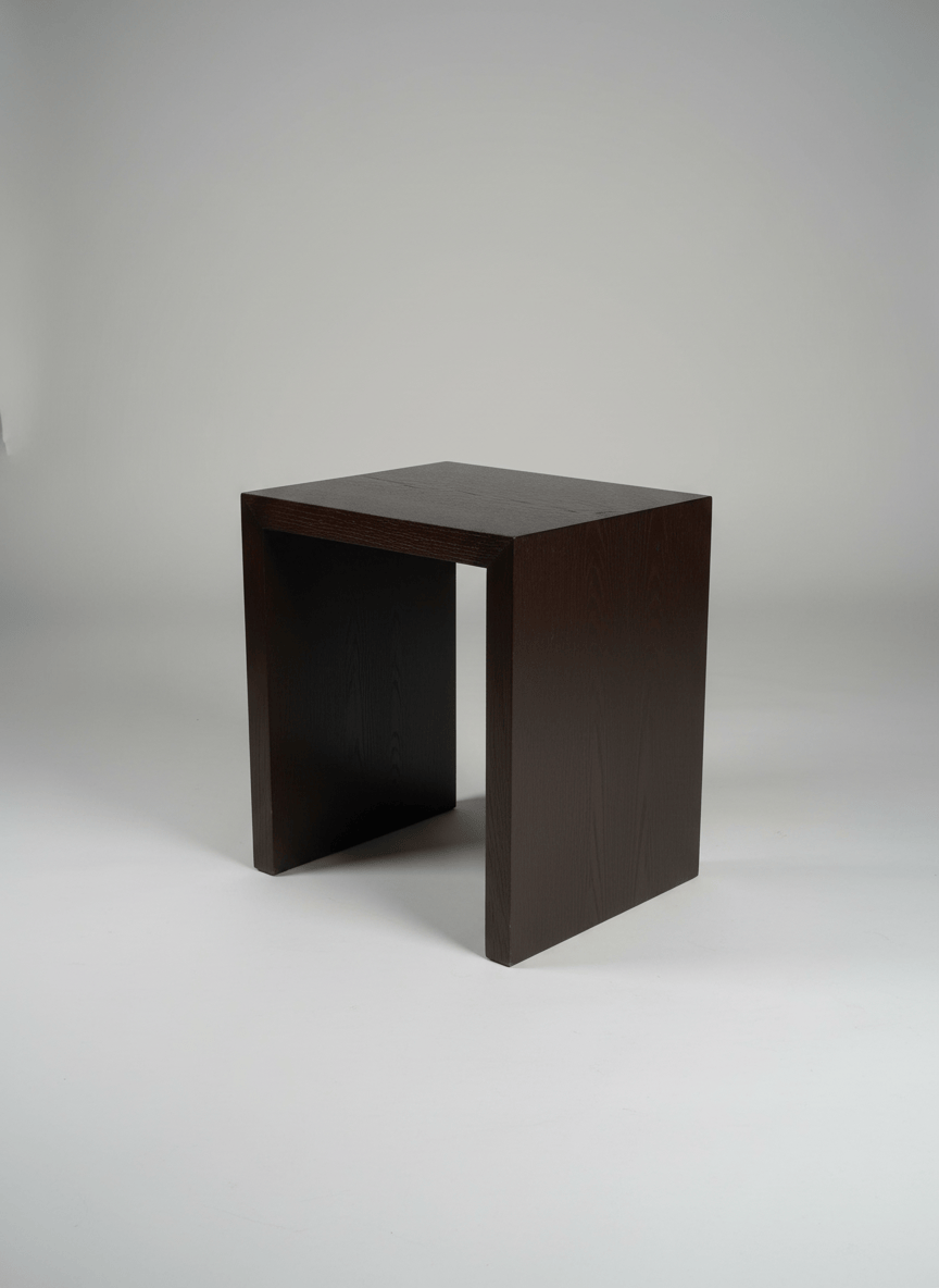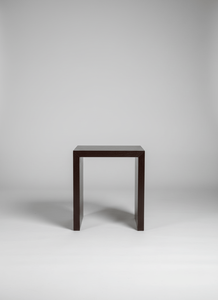 Mesa de apoio quadrada com um design minimalista e moderno. É construída em madeira, possivelmente carvalho ou nogueira, com um acabamento em tonalidade castanha escura, quase ébano, que realça o veio natural da madeira. A estrutura é robusta, formando um "U" invertido que confere estabilidade e um visual contemporâneo. O tampo quadrado apresenta alguns sinais de uso ligeiro, incluindo pequenos riscos superficiais e acumulação de pó visível nas fotografias, mas não há danos estruturais significativos ou lascas. As arestas estão bem definidas. É uma peça versátil, ideal para usar como mesa de cabeceira, mesa lateral, ou como um banquinho ocasional, adaptando-se a diversos ambientes interiores com um toque de elegância discreta.