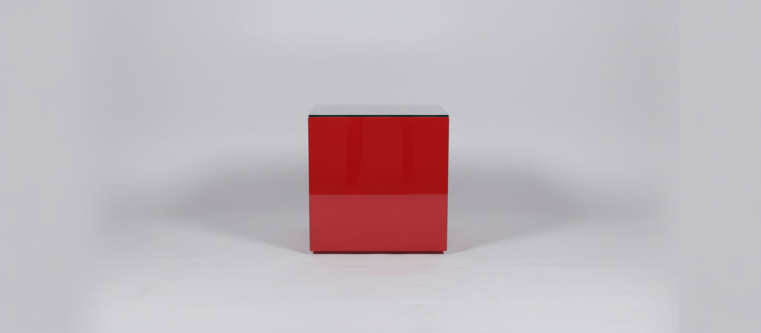 Esta é uma mesa de cabeceira de design moderno e minimalista, caracterizada por um acabamento lacado de alto brilho e um elegante tampo de vidro transparente. As mesas estão disponíveis em três cores distintas: vermelho, branco e preto. Cada unidade tem uma altura total de 50 cm, uma largura de 60 cm e uma profundidade de 40 cm, tornando-as versáteis para diferentes espaços. Construídas com estrutura robusta e um tampo de vidro resistente, as mesas apresentam-se em excelente condição. Não são visíveis quaisquer riscos, lascas, descolorações ou outros sinais de desgaste significativo nas superfícies ou no vidro, indicando um bom estado de conservação.