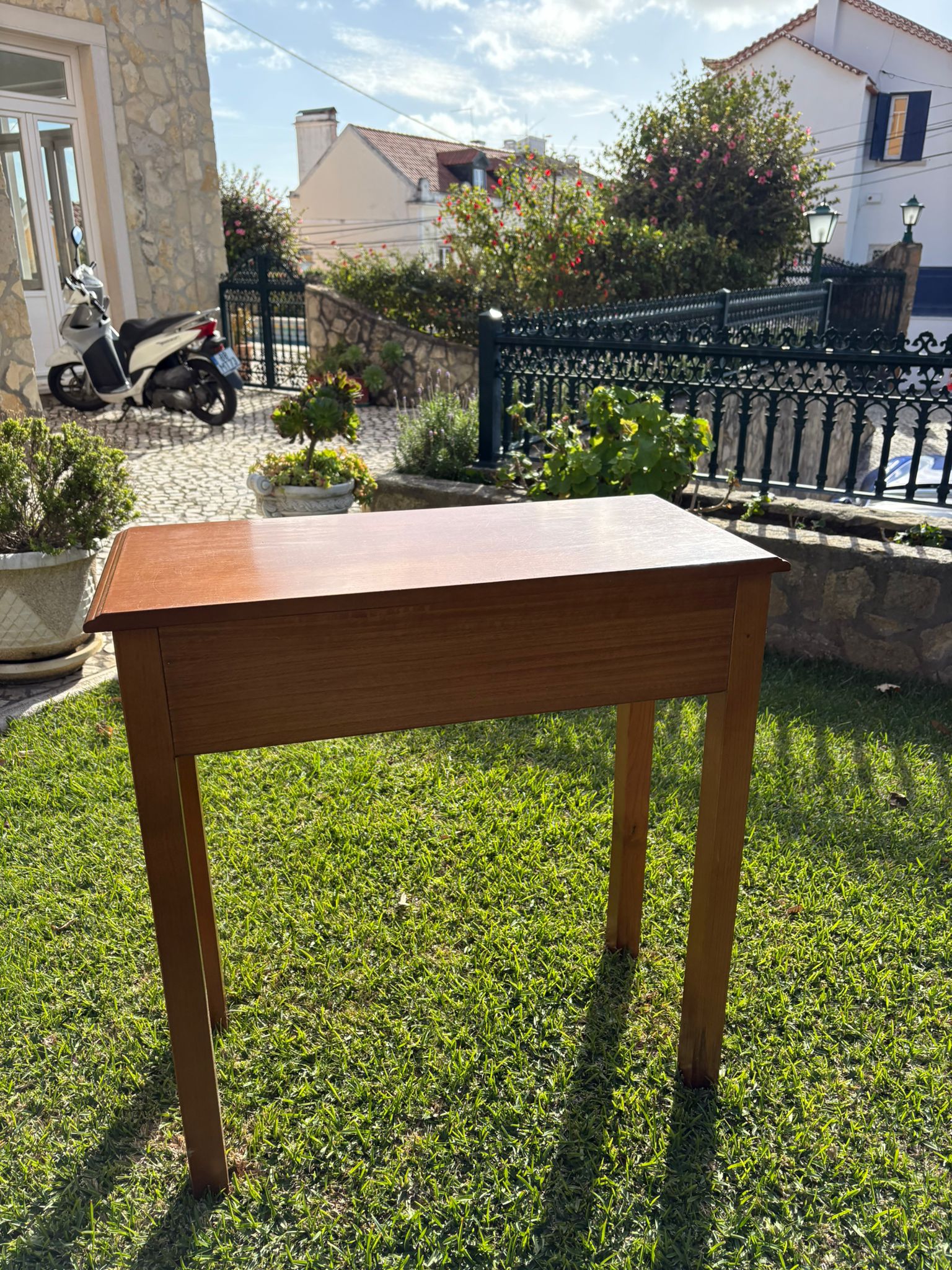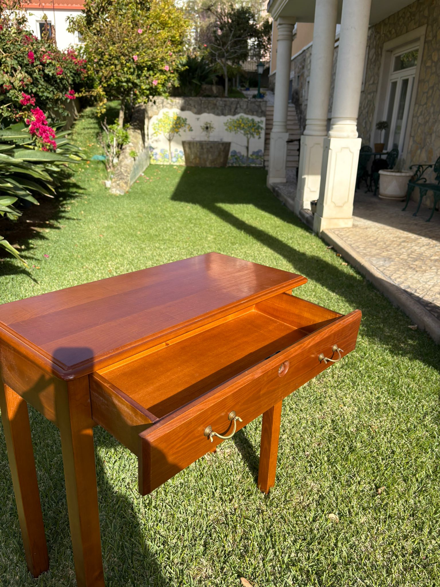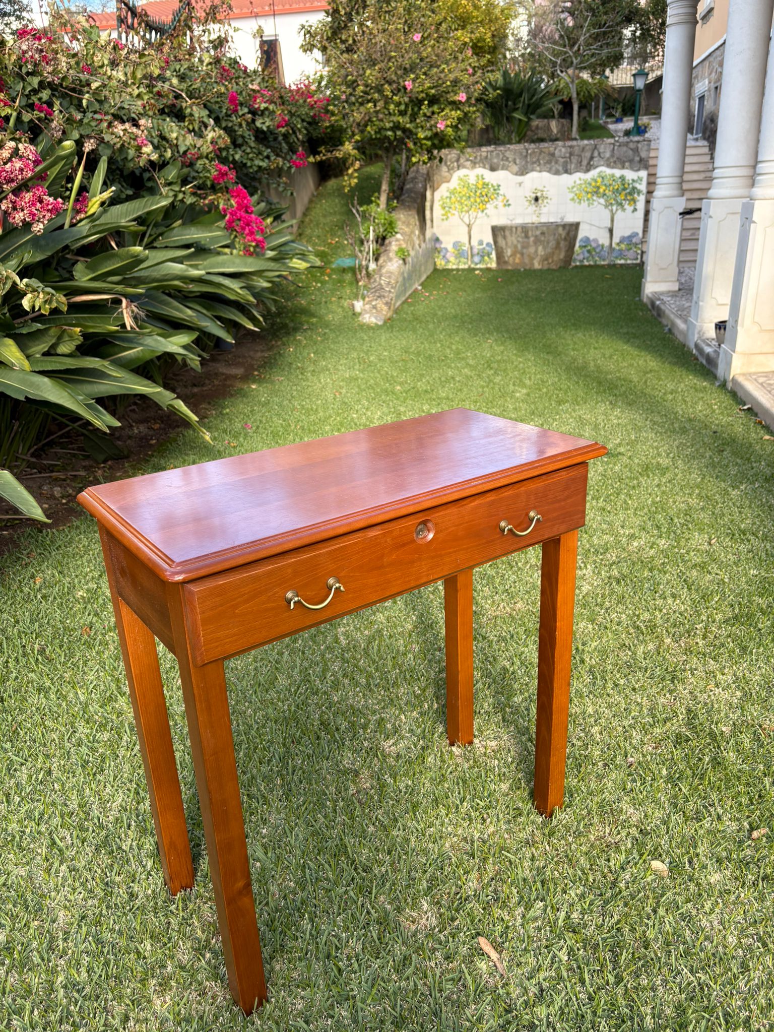 Mesa consola em madeira maciça, de linhas clássicas e elegantes, ideal para hall de entrada, corredor ou como mesa de apoio em quarto ou sala. A peça destaca-se pelo tom quente da madeira e pela gaveta central funcional, com puxadores metálicos originais, que acrescentam carácter e utilidade ao conjunto.