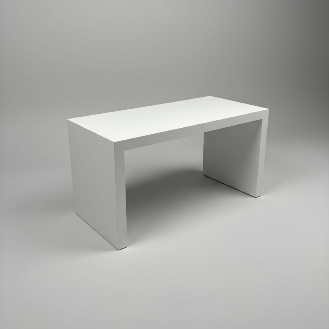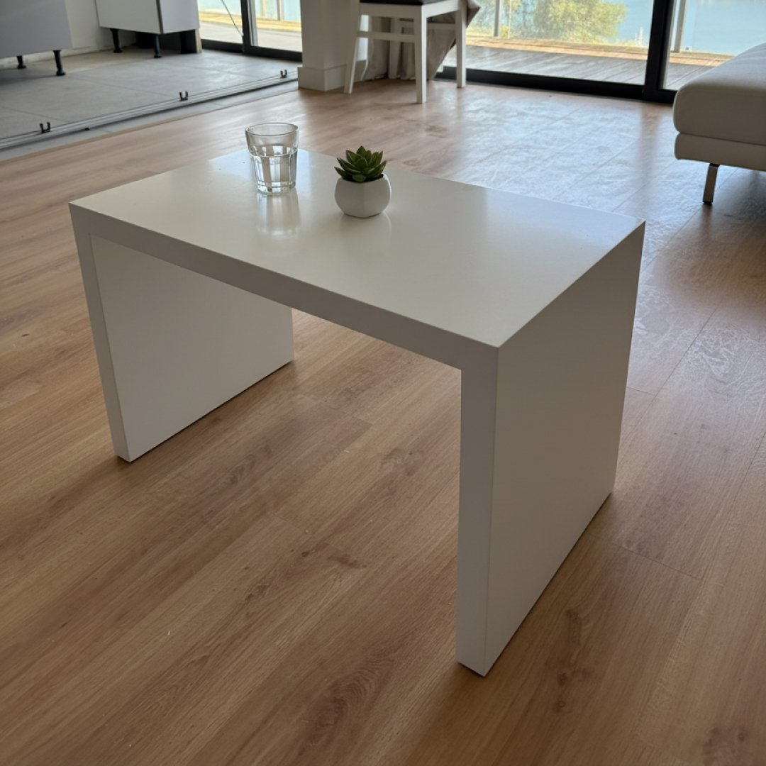 Esta mesa de apoio destaca-se pelo seu design de linhas puras e estética minimalista. Construída em MDF com acabamento em branco mate, a sua forma em "U" invertido oferece uma solução visualmente leve e extremamente funcional. Com 70 cm de comprimento, 40 cm de largura e 46 cm de altura, as suas proporções permitem que seja utilizada como mesa de centro em espaços compactos, mesa de apoio lateral ou até como banco decorativo. É uma peça versátil que se adapta a diversos estilos de decoração, garantindo um ambiente sempre organizado.
