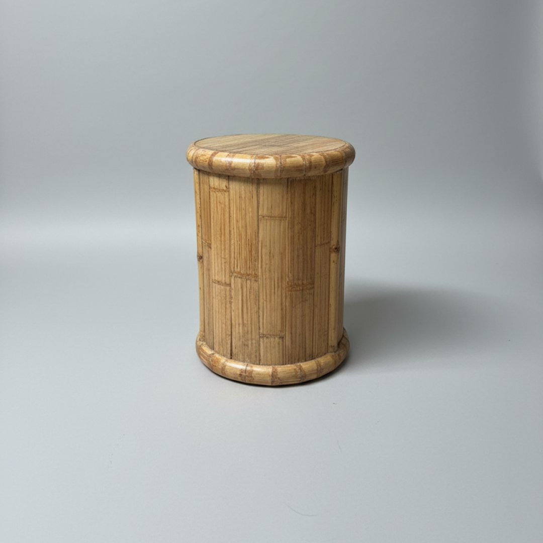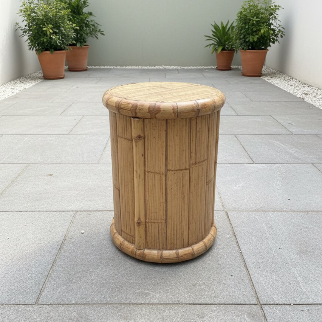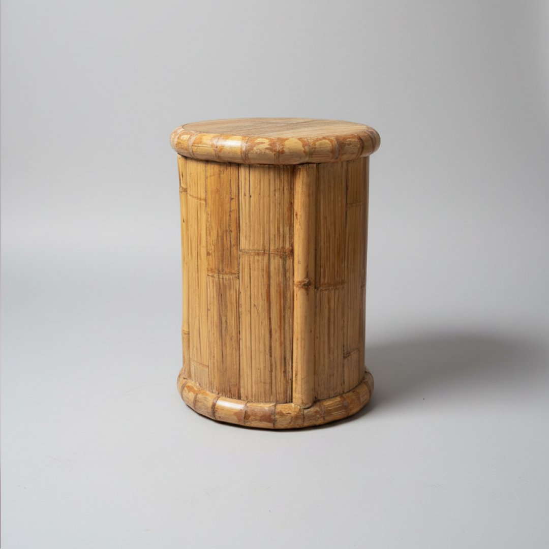 Peça multifuncional em bambu, podendo ser utilizada como mesa de apoio ou elemento decorativo. Design cilíndrico com ripas verticais e extremidades arredondadas, ideal para ambientes que procuram texturas naturais e uma estética relaxada.