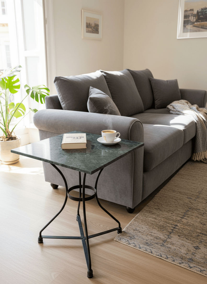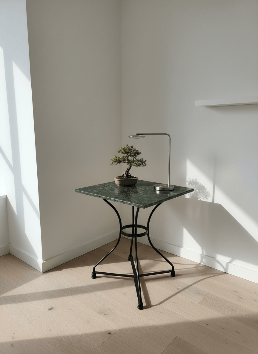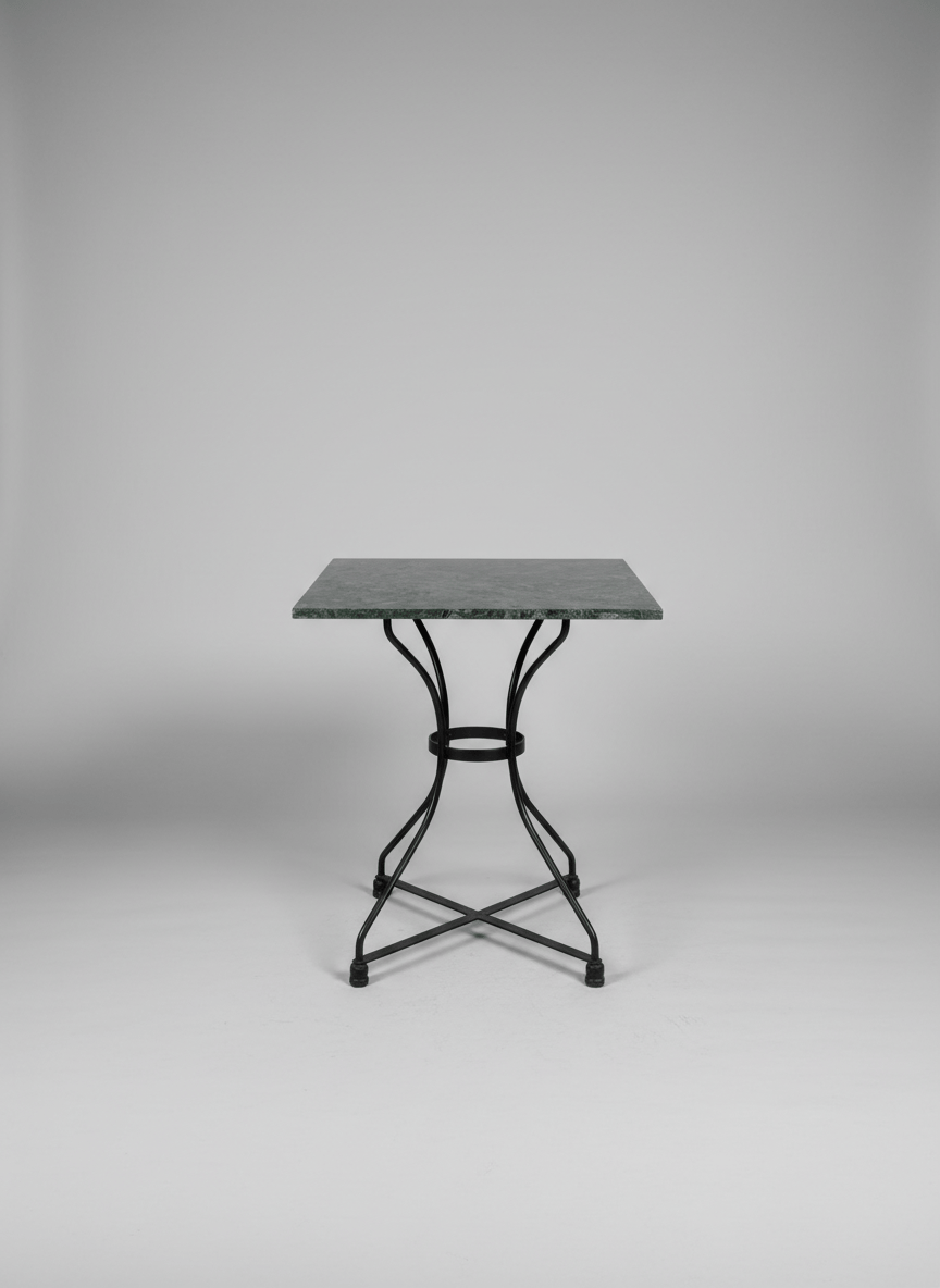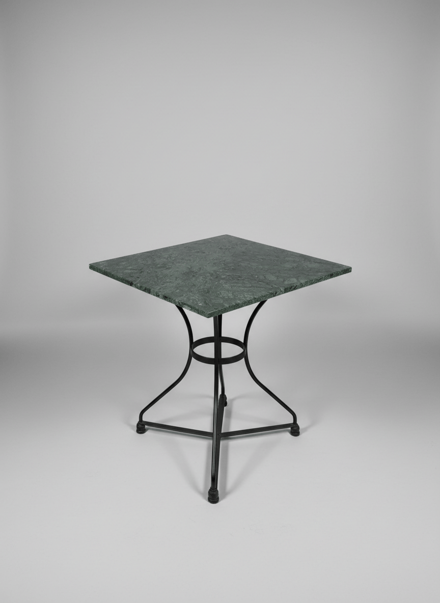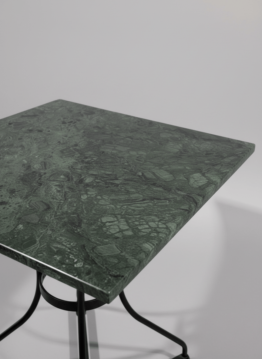 Mesa de apoio de linhas elegantes, com tampo quadrado em mármore verde e estrutura metálica preta. Uma peça robusta e intemporal, ideal para salas, halls, escritórios ou espaços comerciais. O contraste entre o mármore natural e o metal confere-lhe um carácter sofisticado, funcionando tanto como mesa funcional como elemento decorativo.