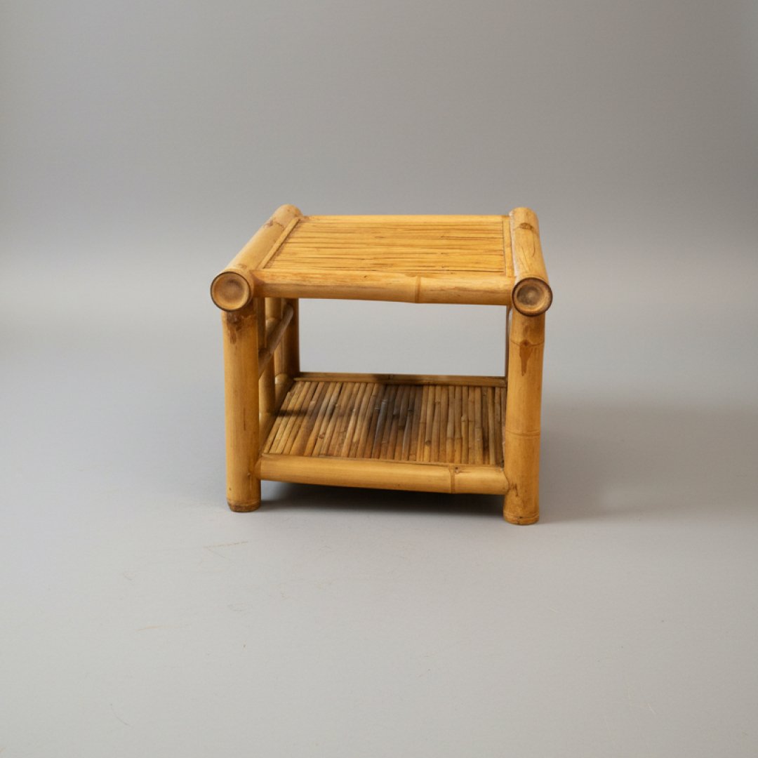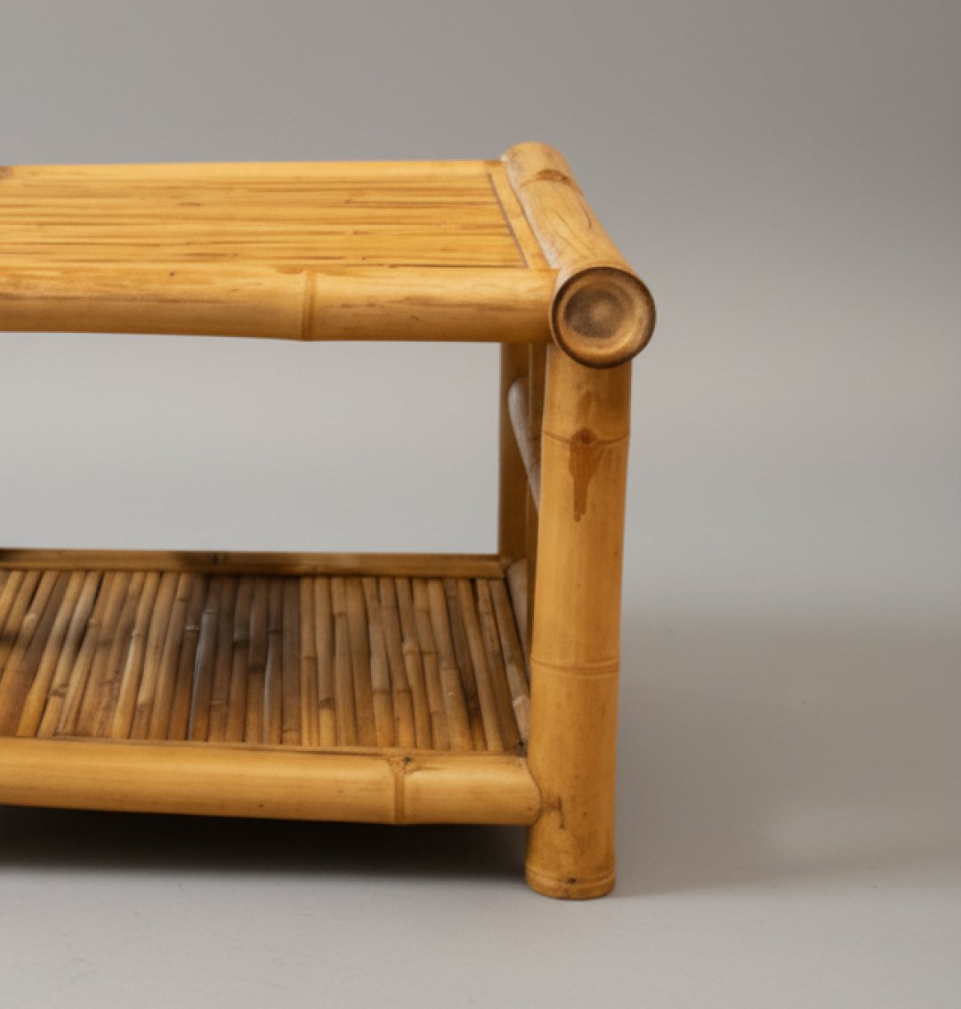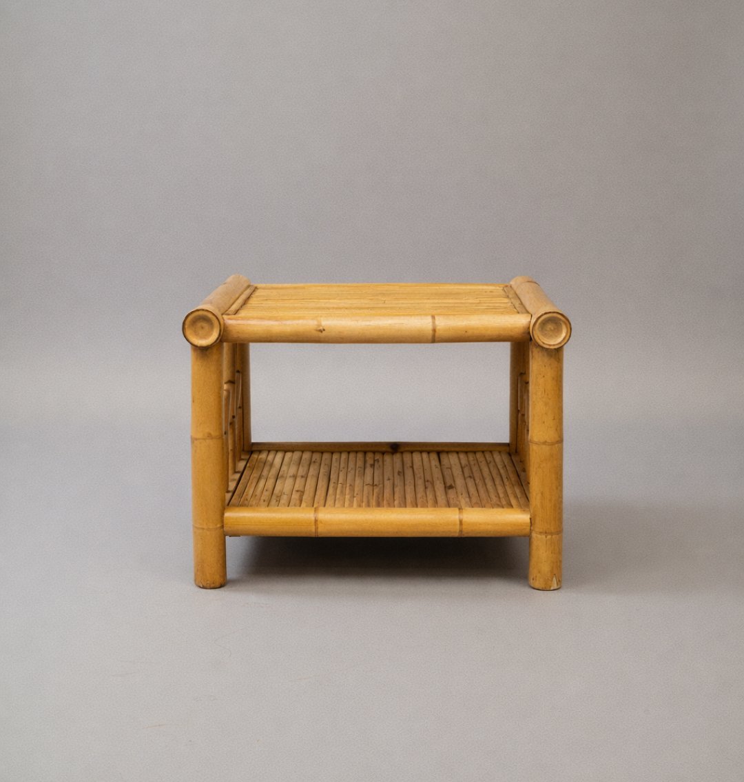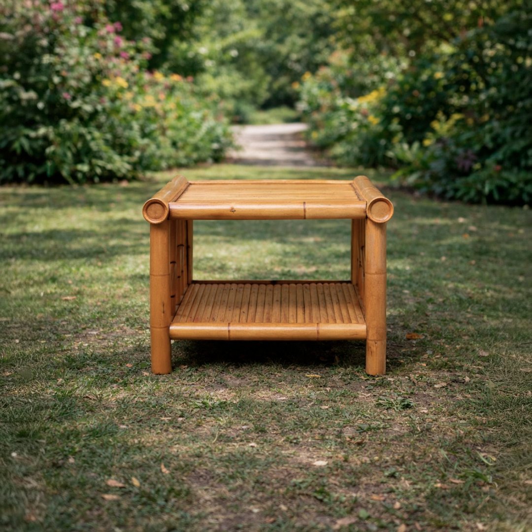 Esta mesa de apoio apresenta um design rústico e sustentável, construída inteiramente em canas de bambu natural de estrutura robusta. Composta por dois níveis de arrumação, um tampo superior e uma prateleira inferior ripada, é uma peça funcional que evoca uma estética tropical e artesanal. A sua silhueta compacta e os encaixes visíveis conferem-lhe um charme autêntico, ideal para complementar salas de estar, varandas fechadas ou jardins de inverno.