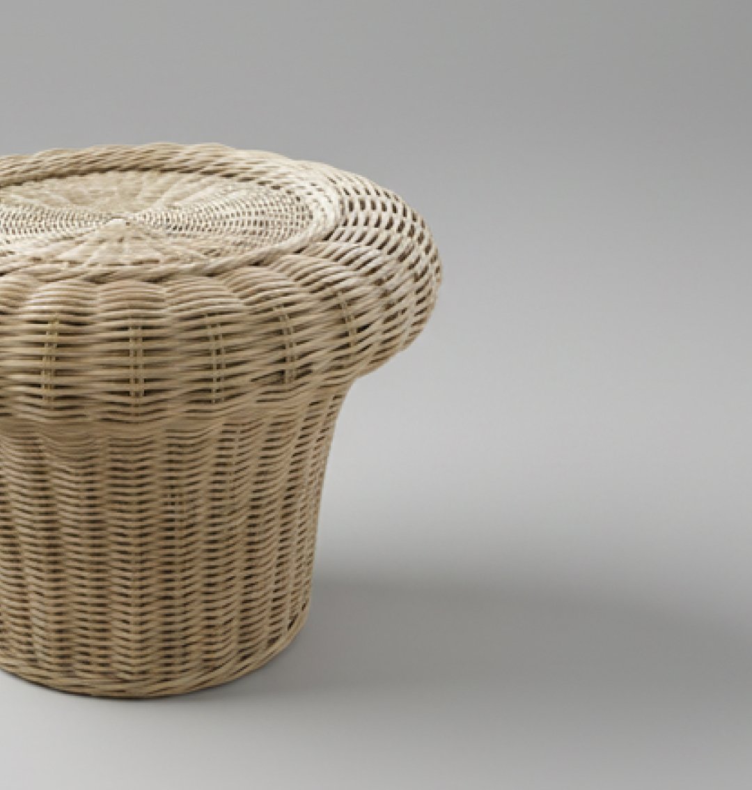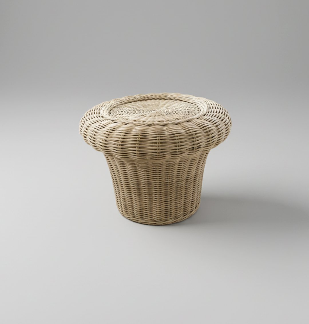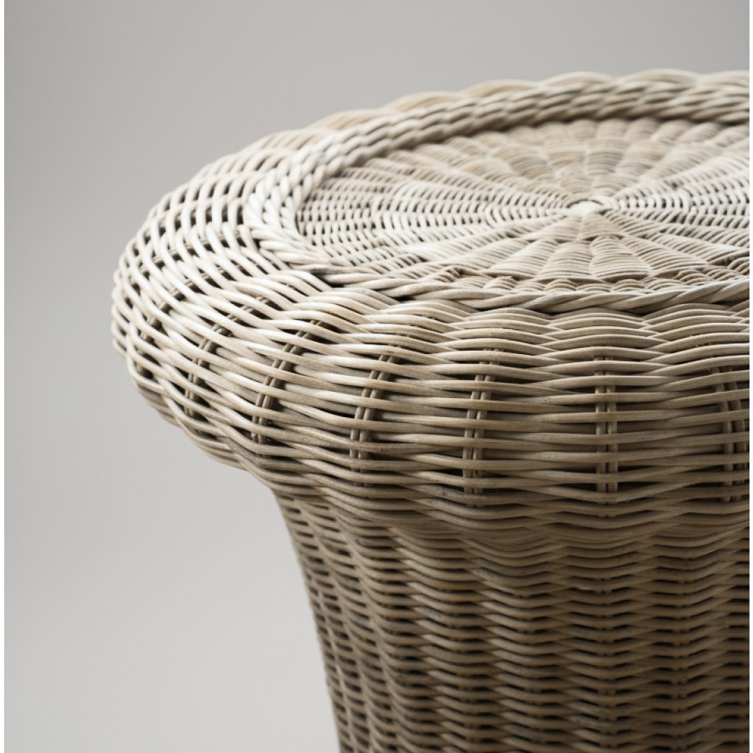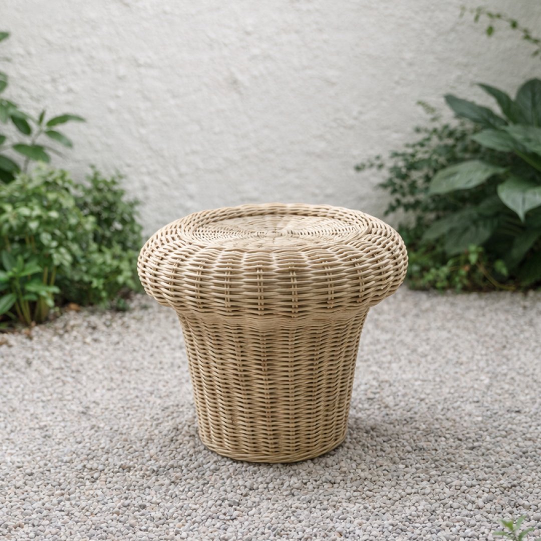 Esta mesa de apoio apresenta um design orgânico e escultural, assemelhando-se à silhueta de um cogumelo. Construída integralmente em vime natural com um entrançado meticuloso, a peça destaca-se pela sua textura rica e pela ausência de arestas vivas. É um elemento decorativo versátil que funciona perfeitamente como mesa lateral, suporte para objetos de arte ou até como um banco de acento em ambientes de inspiração boho, mediterrânica ou natural.