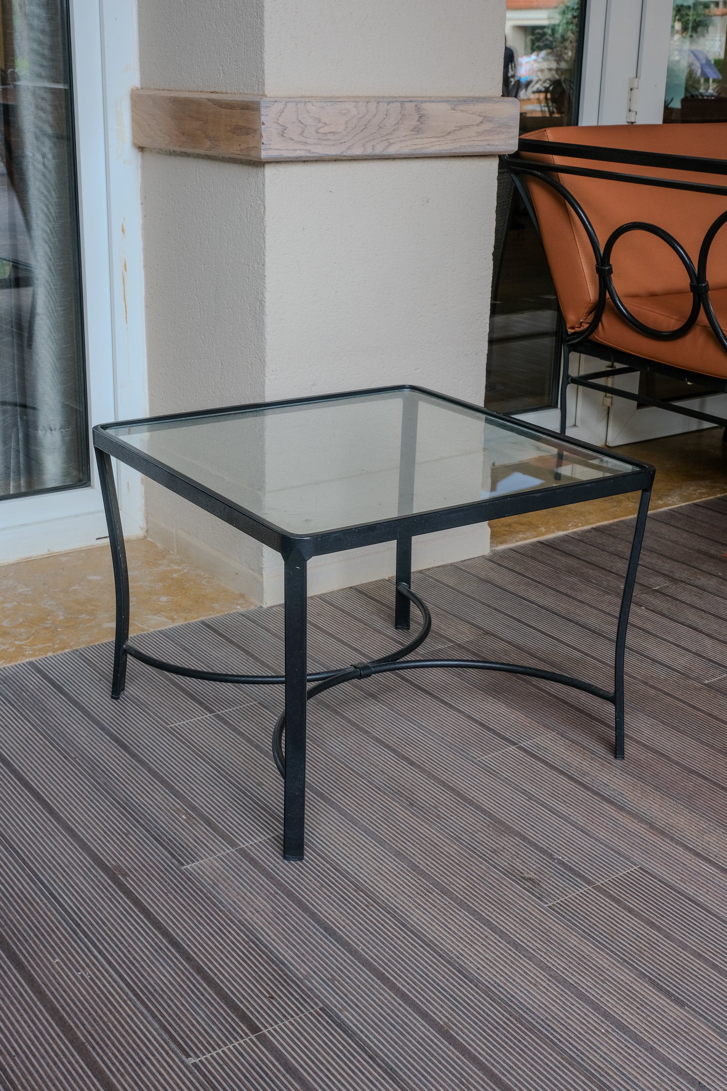 Mesa de apoio quadrada com estrutura em ferro preto e tampo em vidro transparente. O design combina linhas retas com pernas ligeiramente curvas, conferindo um aspeto elegante e discreto, ideal tanto para exteriores como interiores.