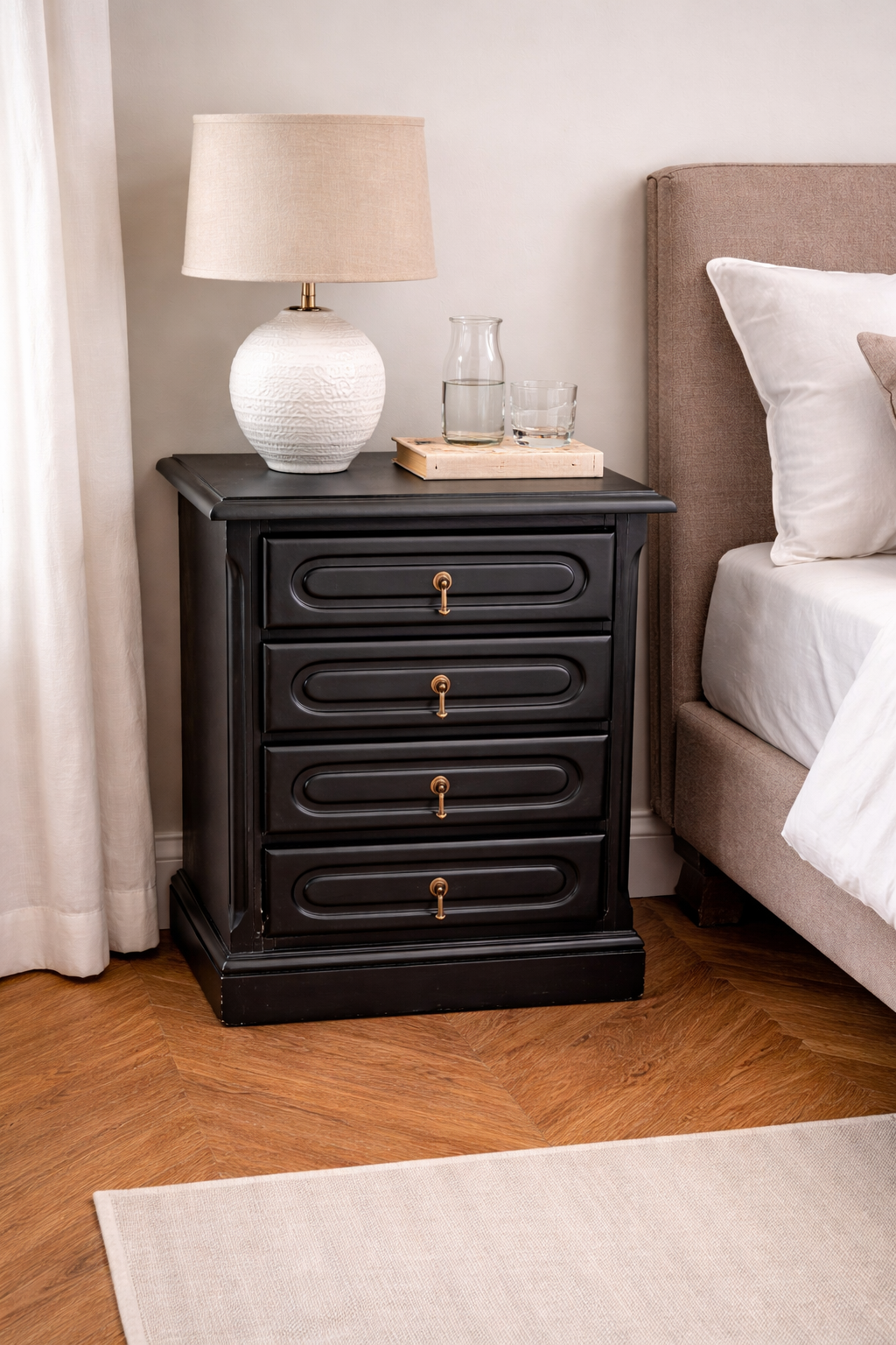 Mesa de cabeceira em madeira, com acabamento preto e quatro gavetas com puxadores em metal.