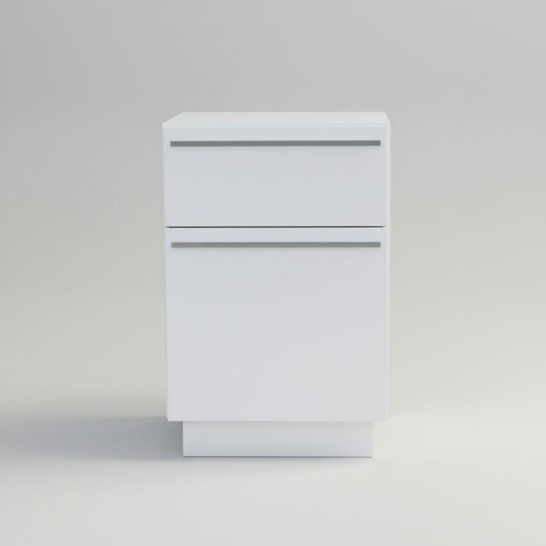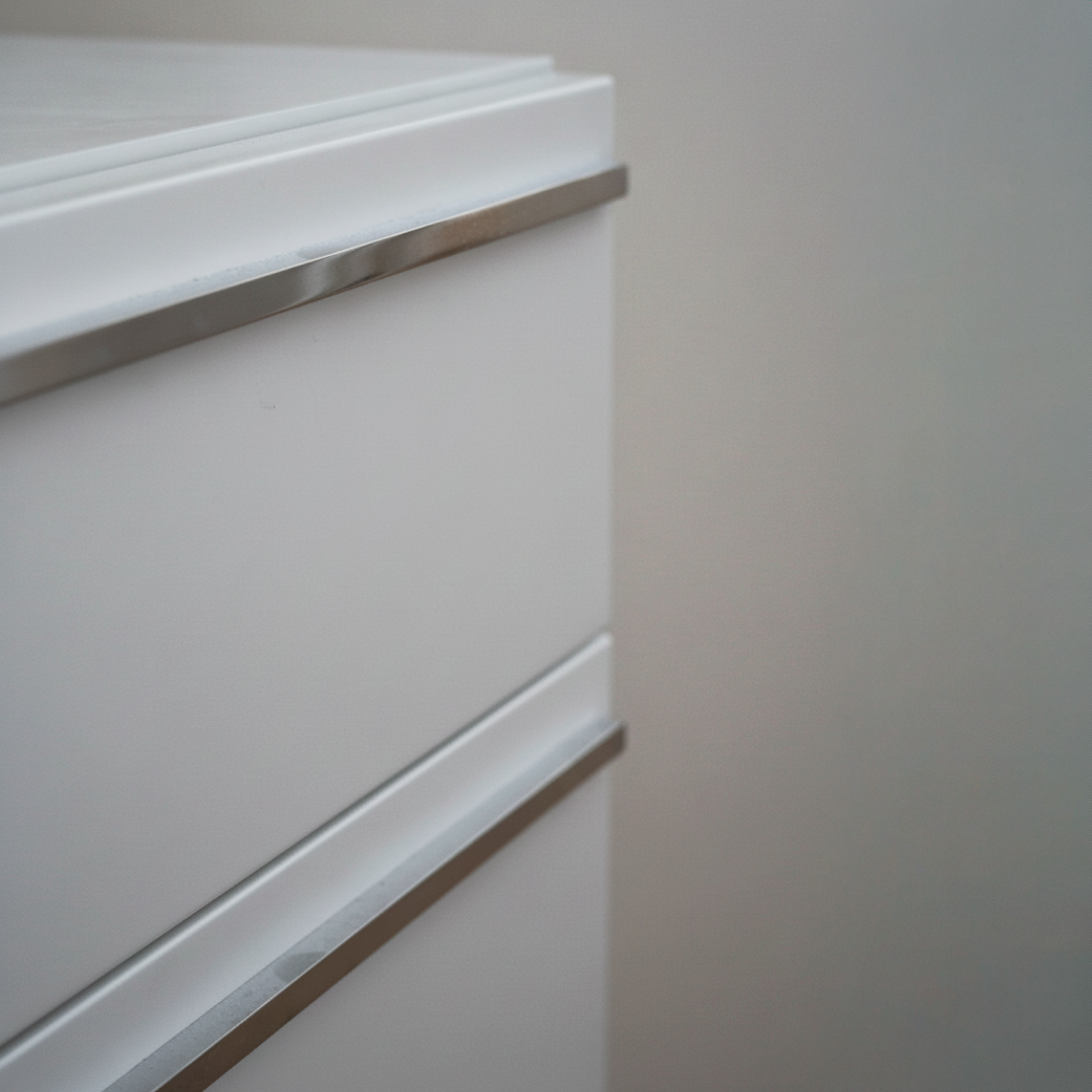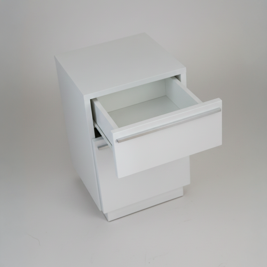 Mesa de cabeceira com estrutura retangular em acabamento branco e design minimalista. O módulo é composto por duas gavetas de diferentes dimensões para organização de artigos pessoais. Os puxadores são em perfil metálico de design linear, integrados no topo de cada frente de gaveta. Por ser um artigo proveniente de hotelaria, pode apresentar algum pós de uso decorrente do armazenamento, mas o material permite que se limpe facilmente com um pano húmido