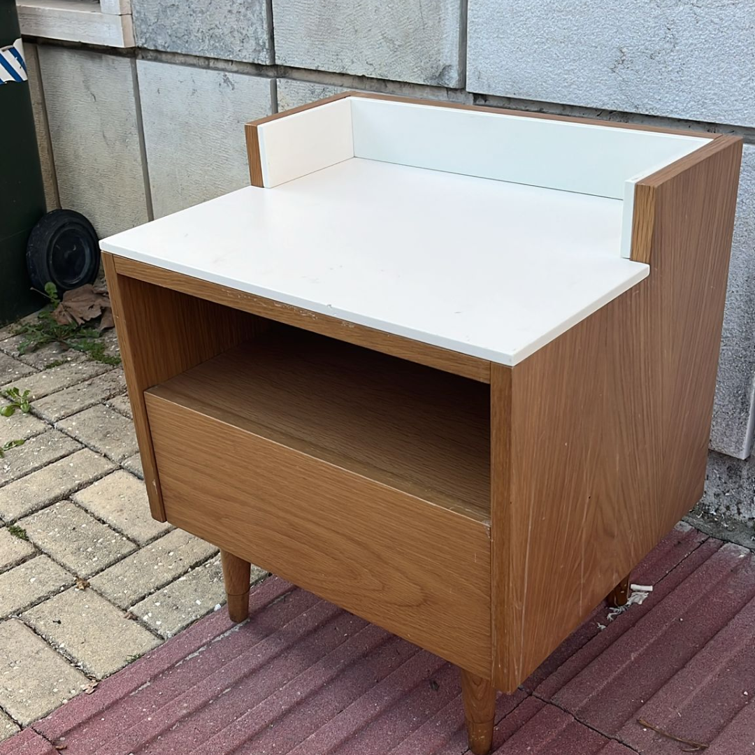 Peça de design, elegante e funcional, esta mesa de cabeceira em madeira natural conta com uma gaveta espaçosa e um nicho aberto, oferecendo organização prática sem comprometer o estilo.