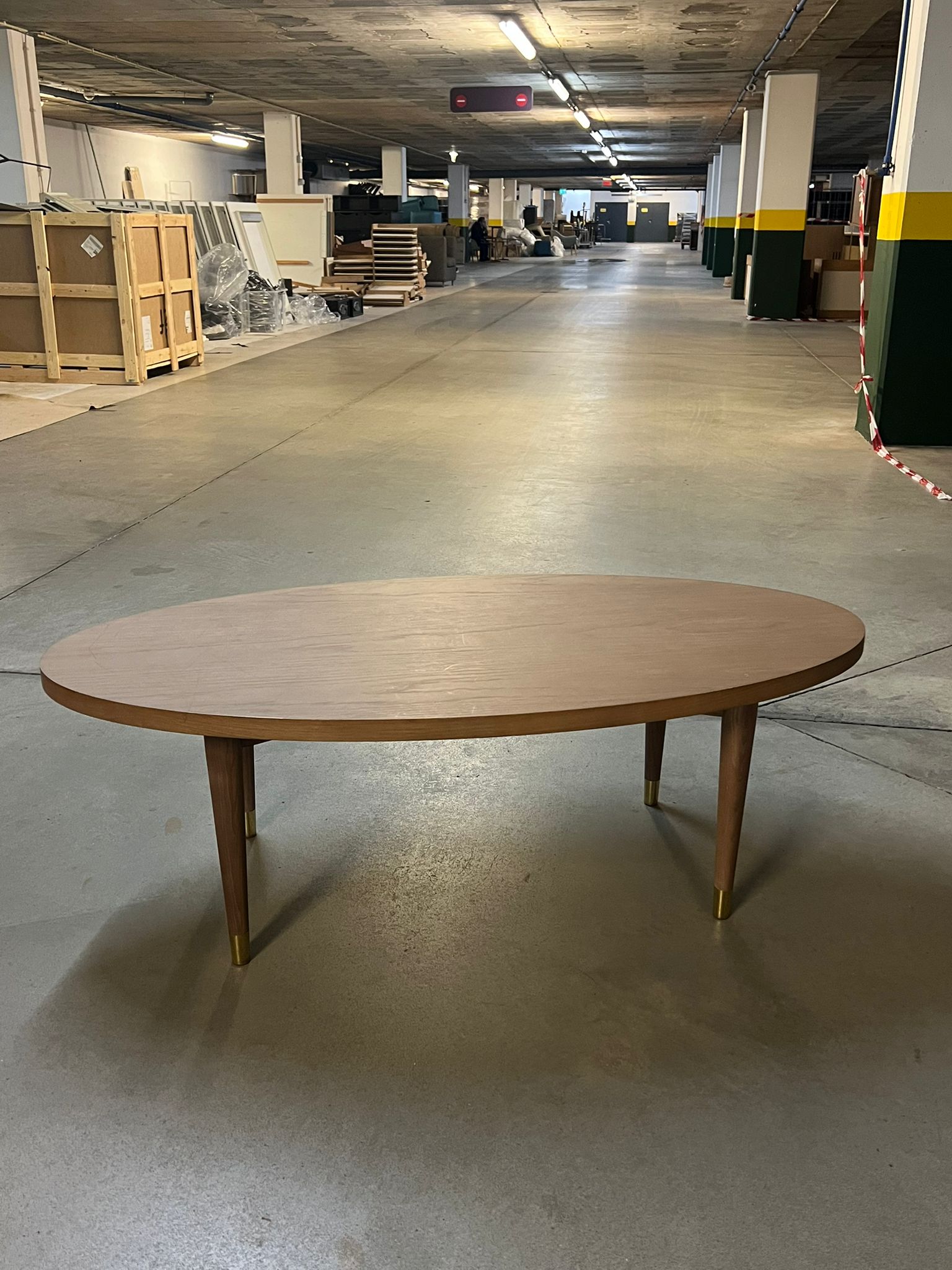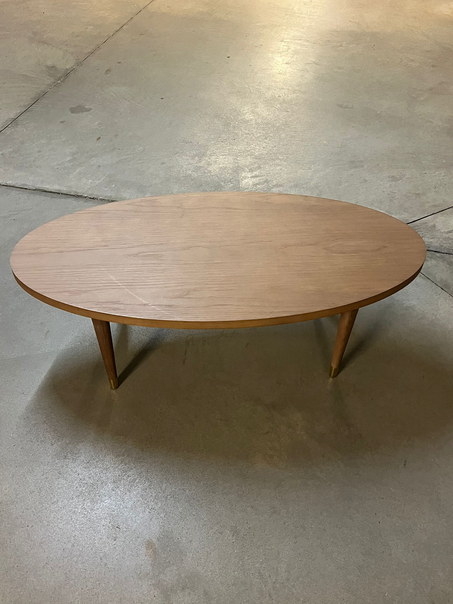 Com tampo oval em madeira e pernas afuniladas com detalhe metálico, a peça apresenta um equilíbrio cuidado entre leveza visual e robustez estrutural. O desenho simples, mas sofisticado, permite que funcione tanto como elemento central num lounge como peça complementar em zonas de espera ou salas de estar.