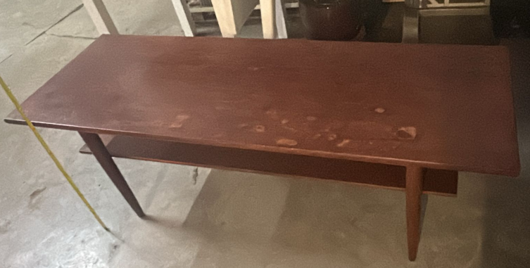 Mesa de centro, em madeira natural - tem pequenas marcas de uso.