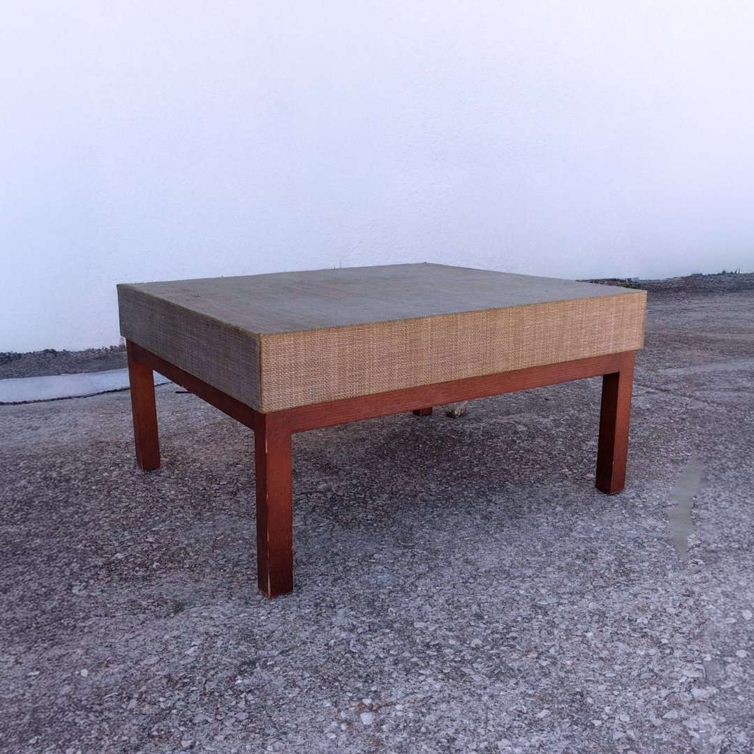 Este artigo é uma mesa de centro de formato quadrado com uma estrutura robusta em madeira de tom castanho avermelhado. O tampo possui um design de bloco alto e é totalmente estofado com um tecido de textura entrançada em tom bege/natural. As quatro pernas de madeira têm um design simples e reto. Trata-se de uma peça em segunda mão que apresenta sinais de uso e desgaste. A estrutura de madeira possui riscos e marcas superficiais nas pernas e na base. O estofo do tampo apresenta descoloração irregular, manchas visíveis e zonas onde o tecido está desgastado ou com fios soltos, especialmente nas arestas e na superfície central. É um artigo ideal para quem pretende proceder ao reestofamento da peça.