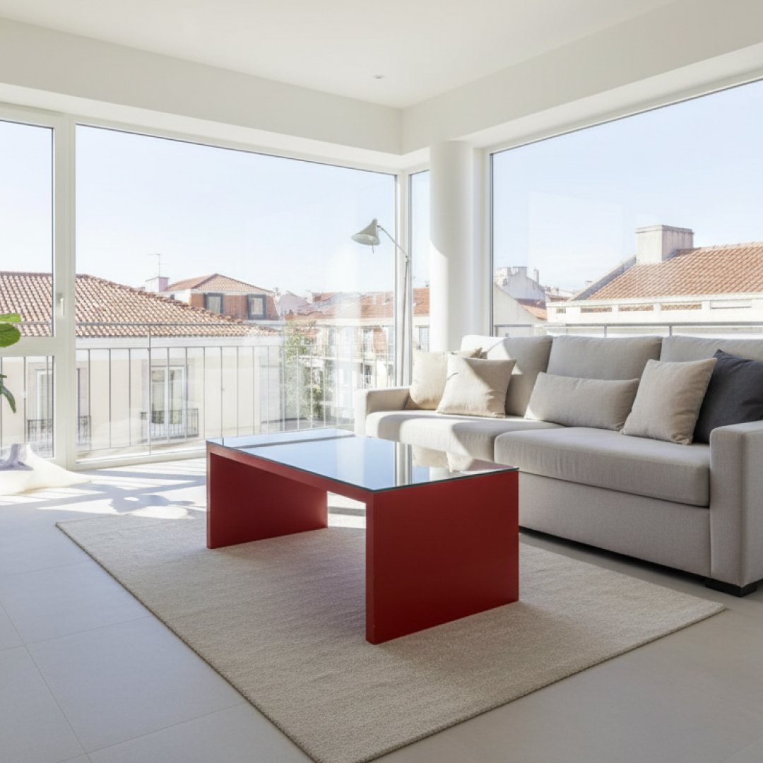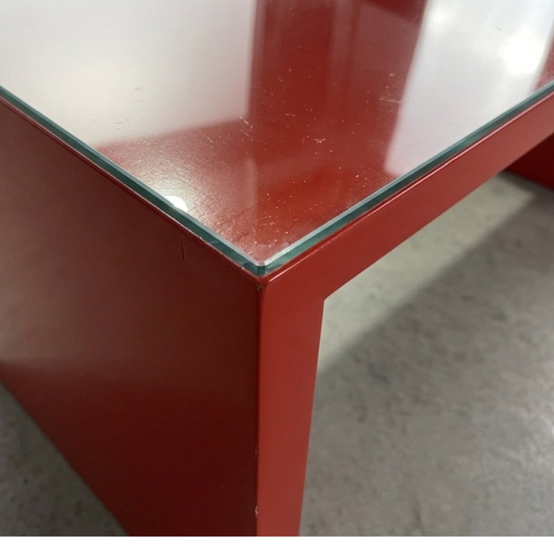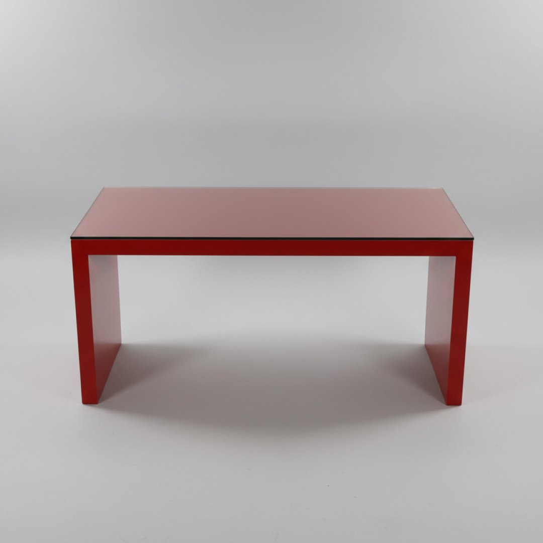 Esta mesa de centro foi desenhada para espaços de uso intensivo que exigem durabilidade. A estrutura em madeira lacada de cor vermelha é complementada por um tampo de vidro superior, que protege a superfície de riscos e facilita a limpeza diária. É uma peça funcional, com linhas retas e uma construção robusta que garante estabilidade.