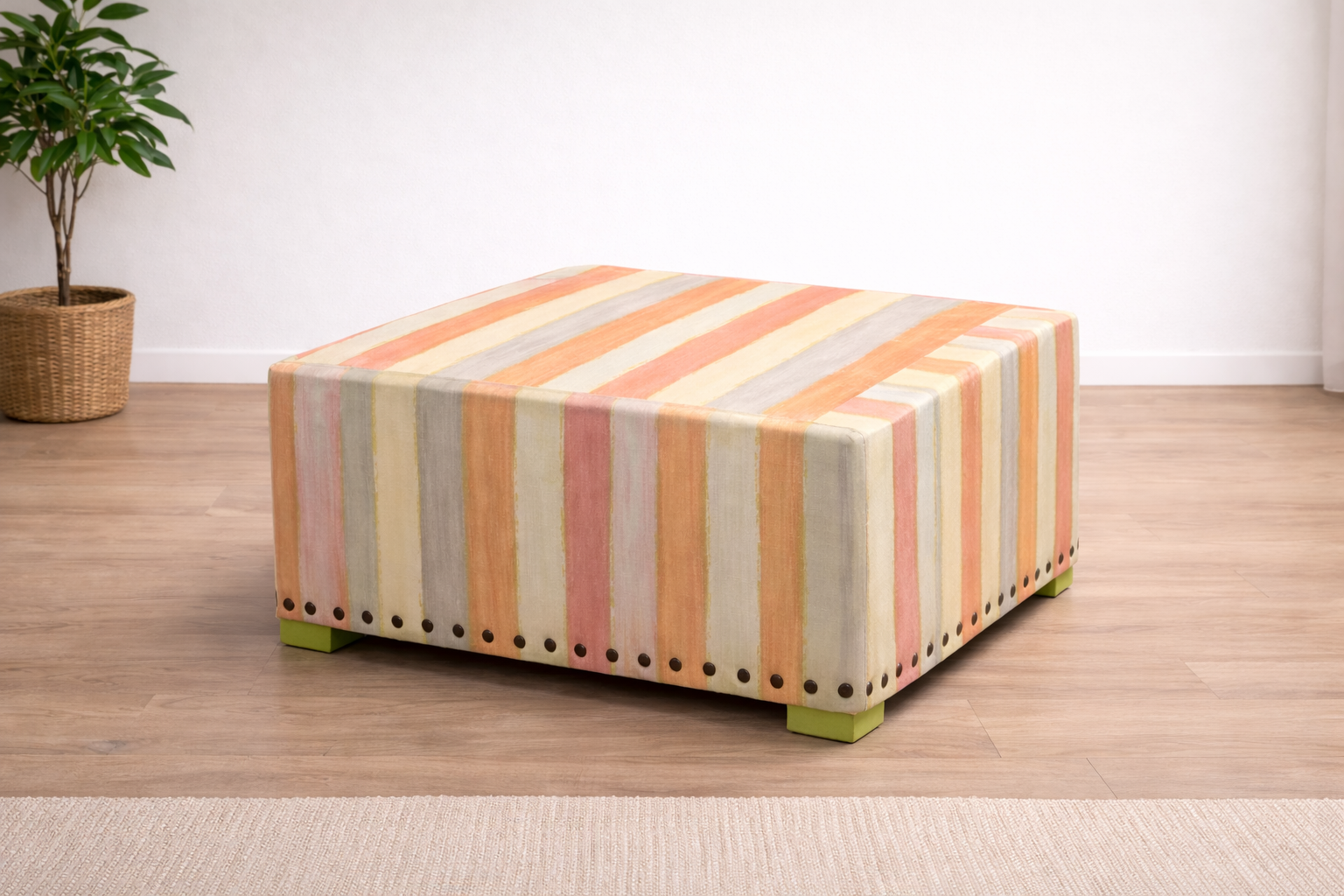 Mesa de centro de linhas simples e robustas, com formato retangular e estofada em tecido às riscas em tons quentes de laranja, bege e amarelo. Os pés em verde-água dão um contraste fresco e contemporâneo, ideal para salas de estar luminosas, casas de férias ou ambientes descontraídos com inspiração mediterrânica. Pode funcionar também como banco baixo ou apoio multifunções.