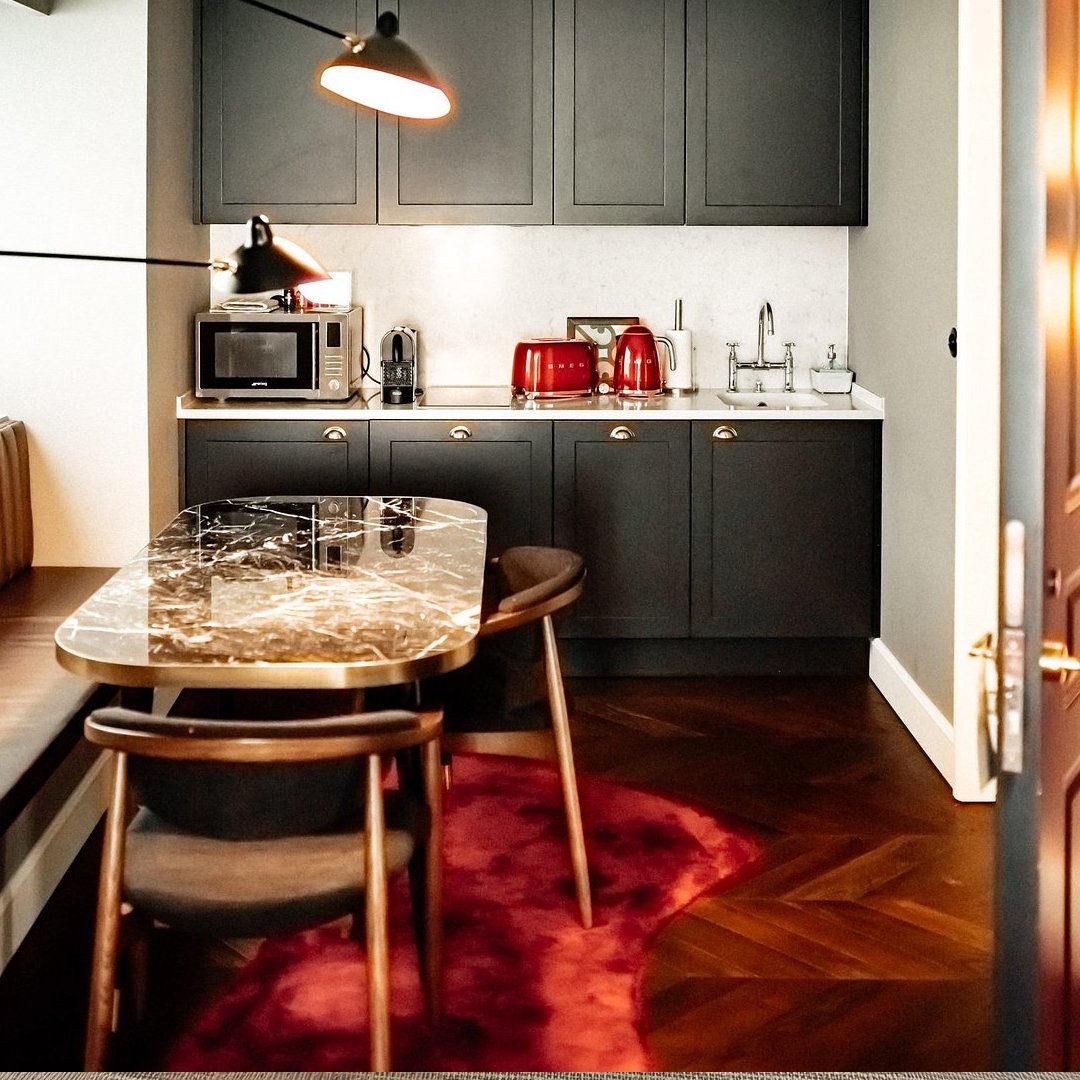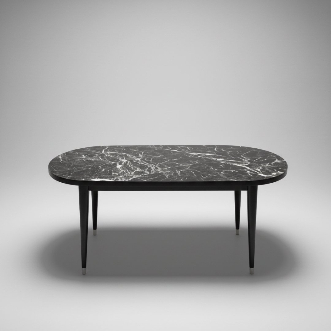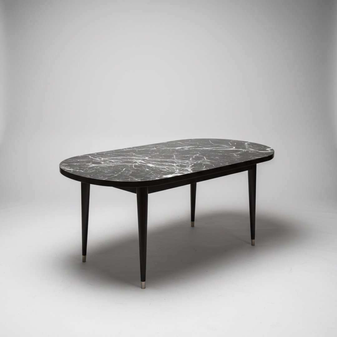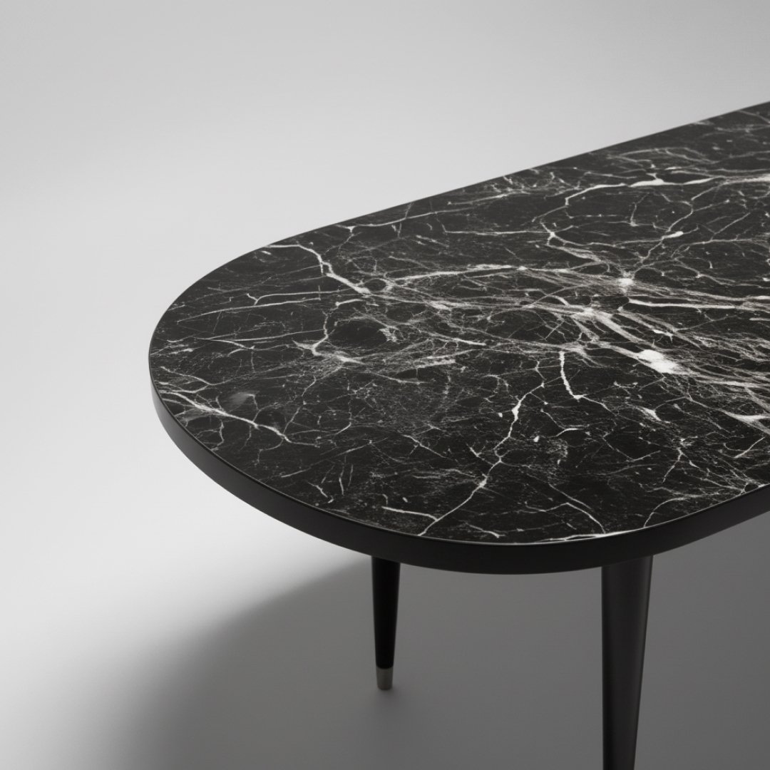 Mesa com tampo em mármore preto com veios claros e acabamento polido.