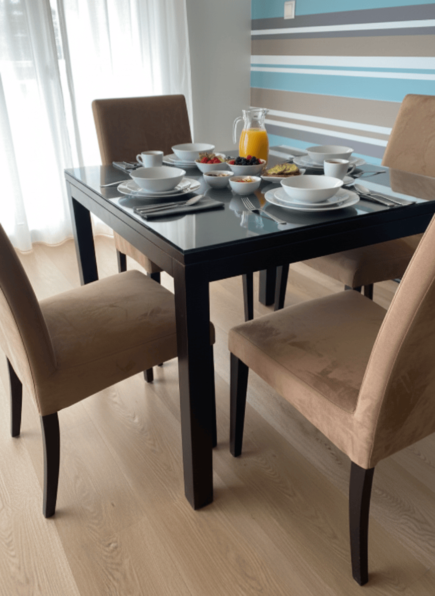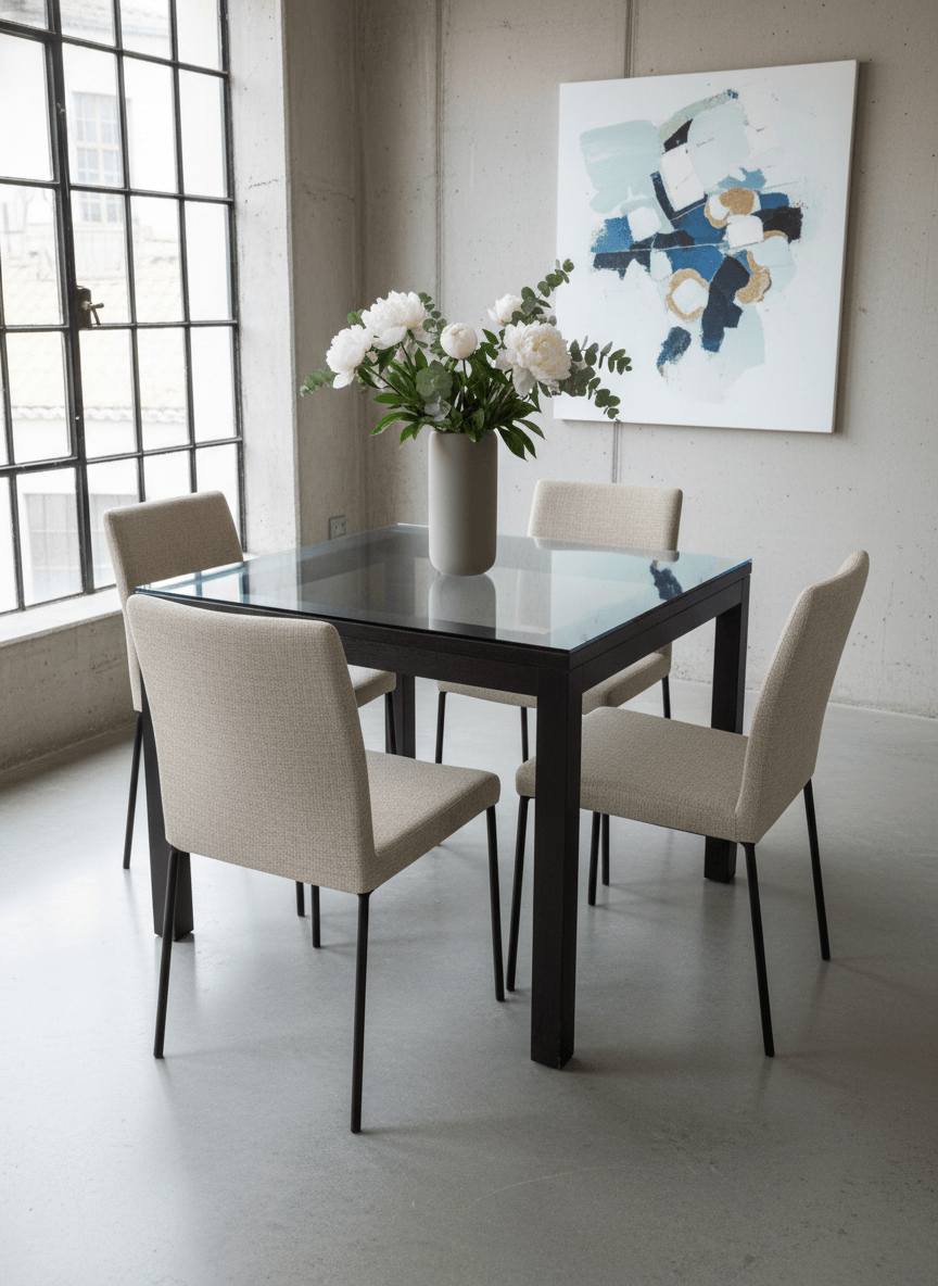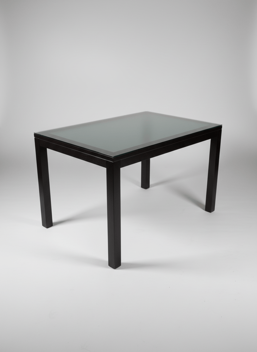 Mesa de jantar retangular com estrutura robusta em madeira e tampo de vidro. Este modelo é apresentado em diversas variantes: uma com estrutura em madeira de tonalidade castanho escuro e tampo de vidro azul esverdeado; outra com estrutura em madeira branca e tampo de vidro transparente; e uma terceira com estrutura em madeira vermelha e tampo de vidro vermelho escuro.