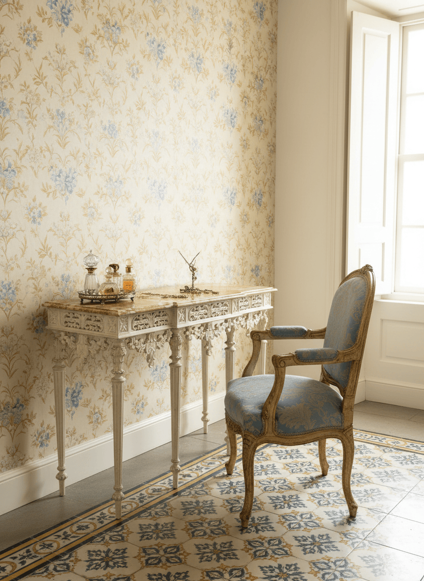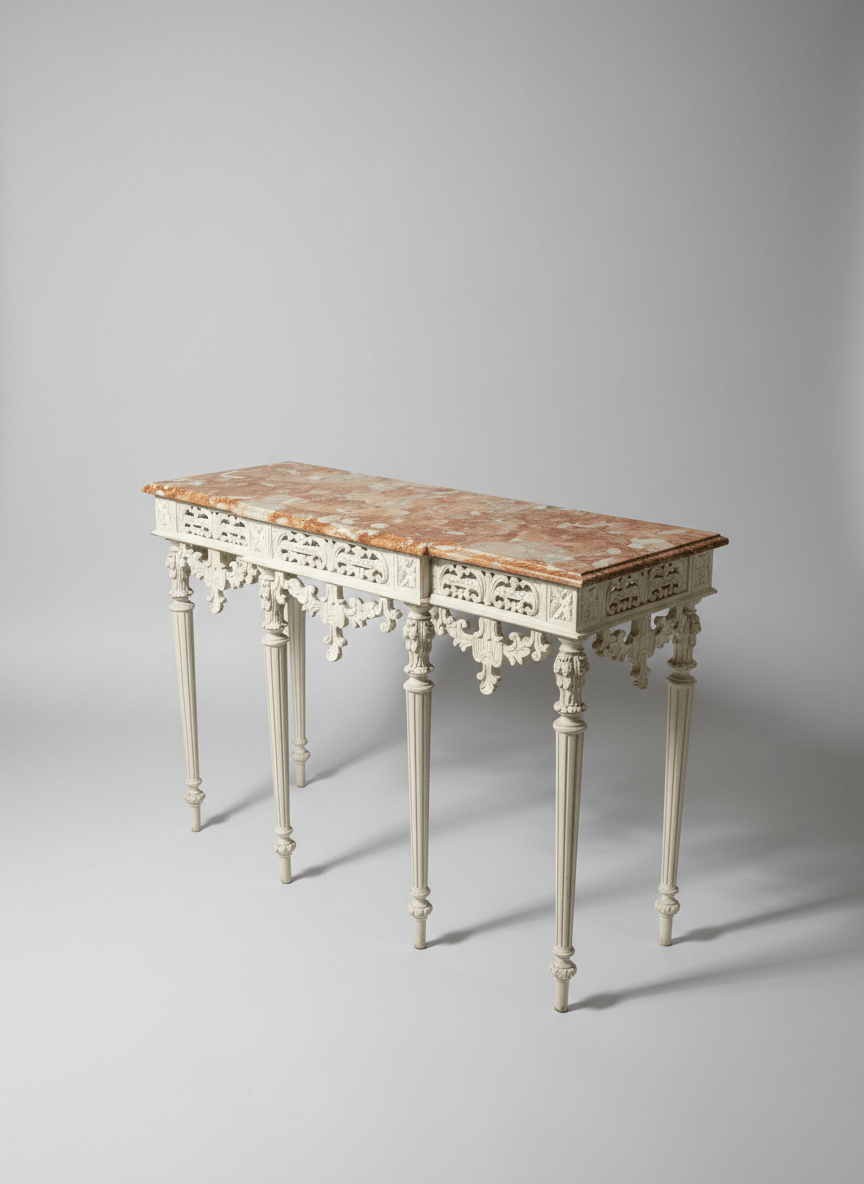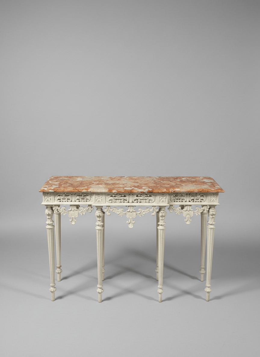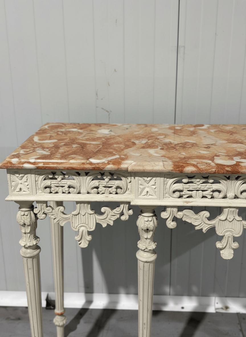Mesa decorativa de inspiração clássica, com estrutura em madeira pintada em tom claro e detalhes ornamentais trabalhados. O tampo em mármore, com veios em tons quentes, confere elegância e presença à peça. Ideal como mesa de apoio ou peça decorativa em entradas, corredores ou salas, destacando-se pelo seu carácter e acabamento cuidado.