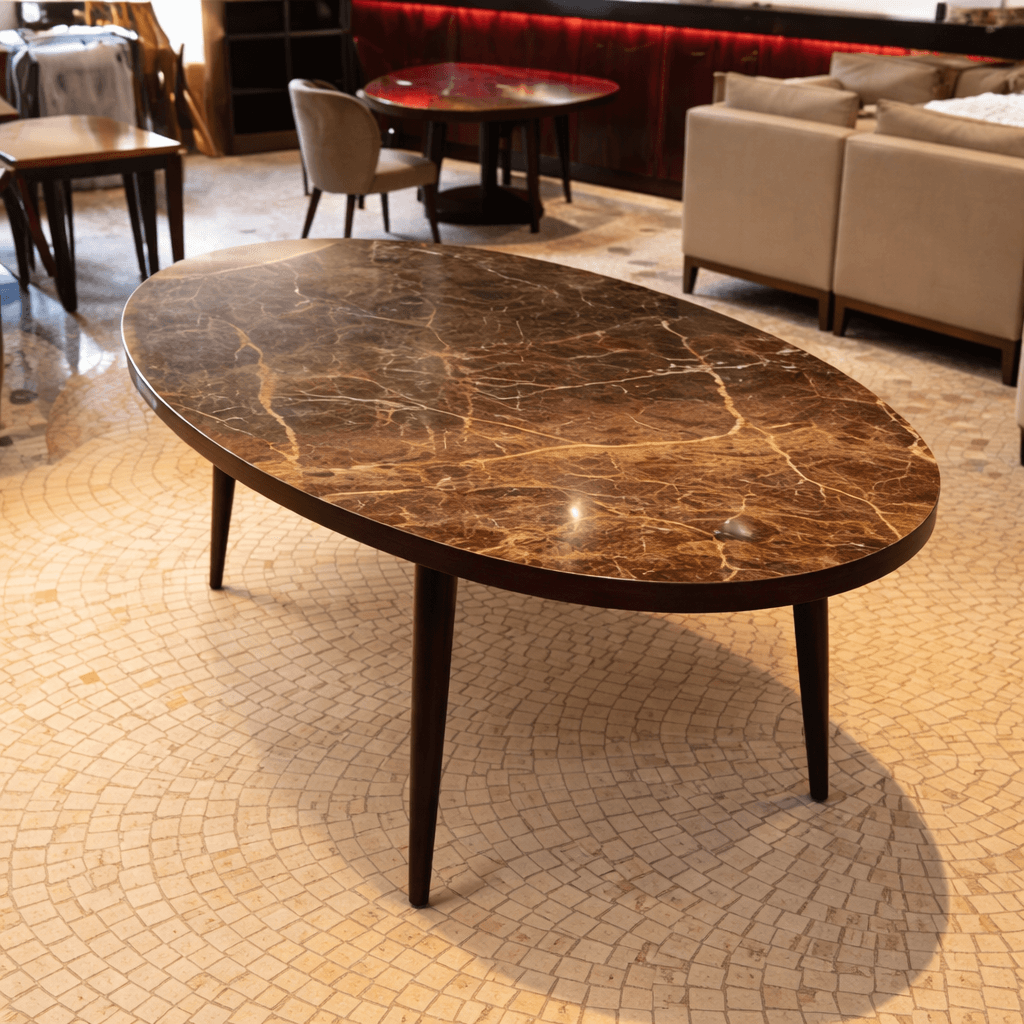 Tampo em mármore castanho com veios claros e acabamento polido.