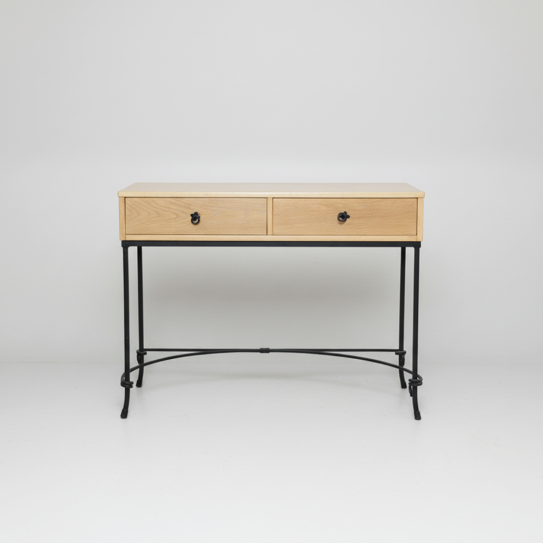 Estrutura composta por tampo em madeira de acabamento rústico e base em metal com acabamento preto. O design inclui duas gavetas frontais integradas com puxadores metálicos de formato circular, montadas sobre pernas de perfil fino e curvatura decorativa. É uma solução versátil para a organização de halls de entrada, corredores ou zonas de apoio.