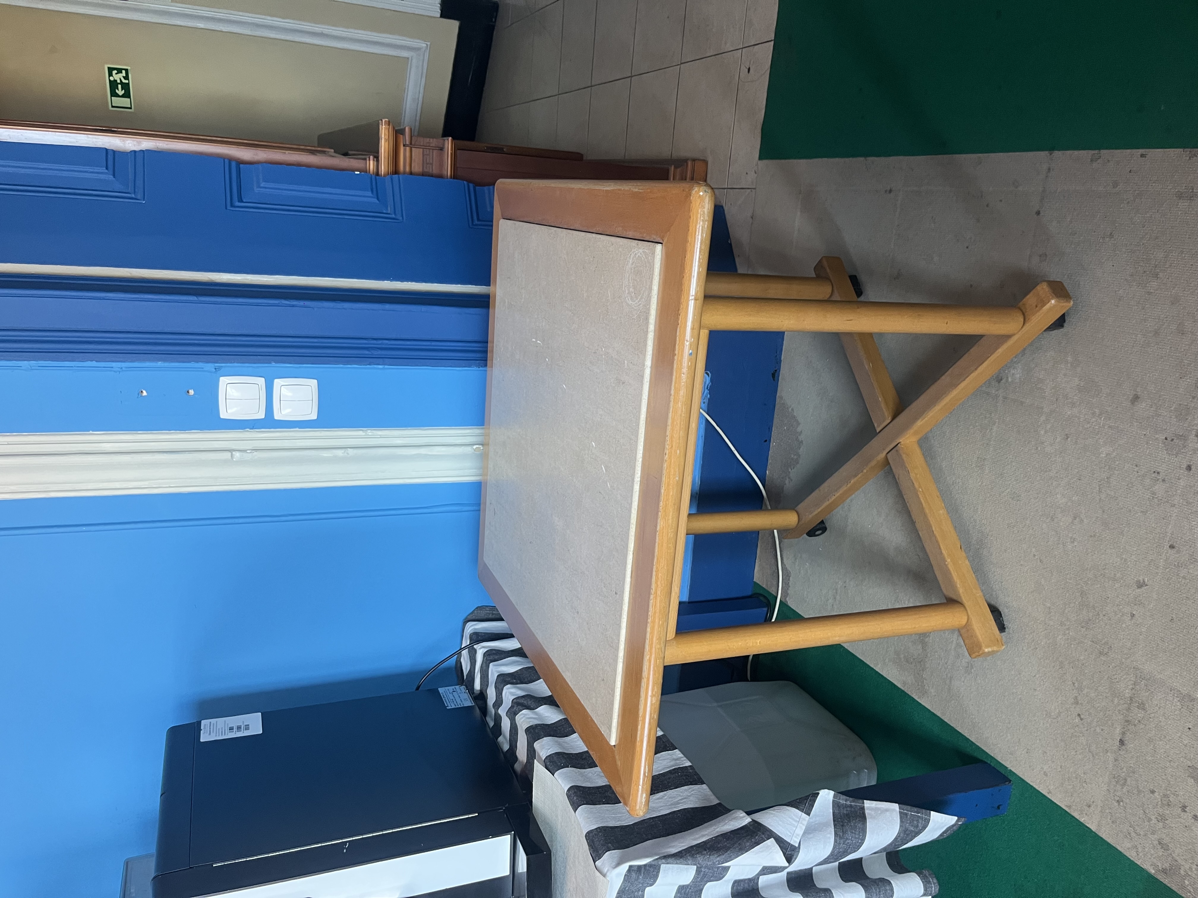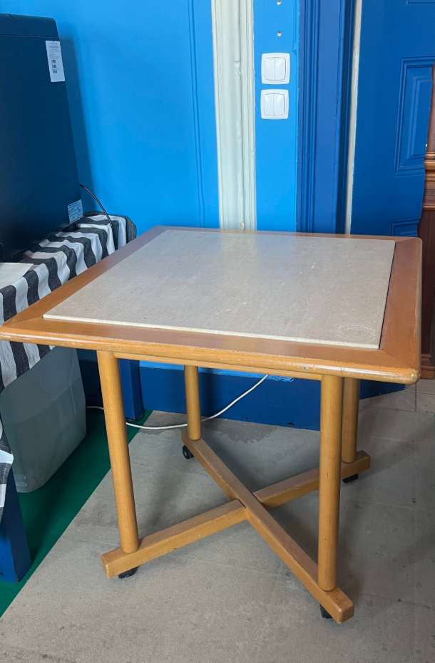 Mesa quadrada em madeira clara, com tampo em pedra/mármore e base com rodízios para fácil mobilidade.